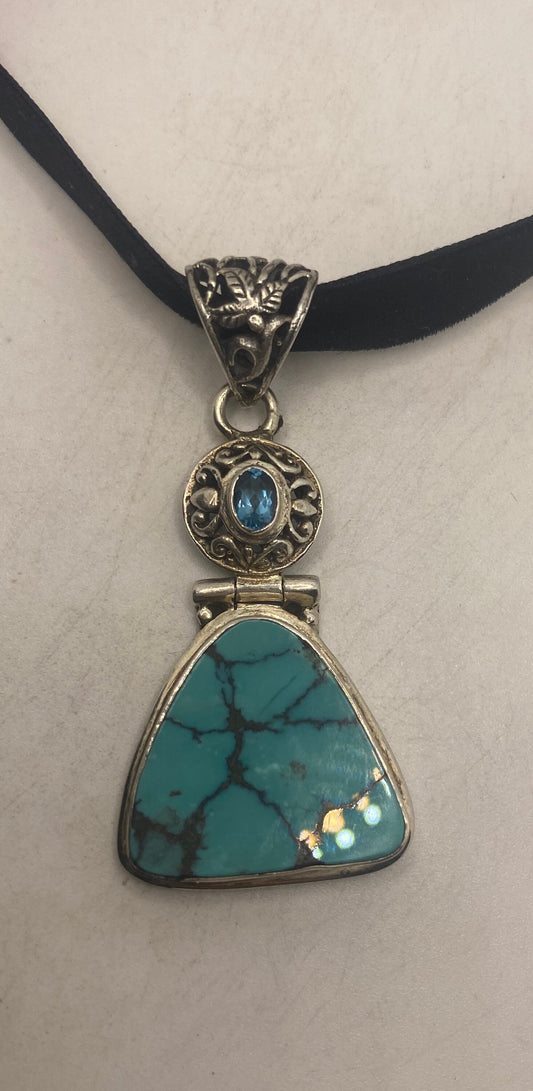 Vintage 925 Sterling Silver Blue Topaz Turquoise Vine Pendant Choker Necklace