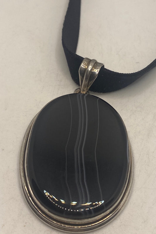 Vintage Banded Black Onyx Agate Choker Black Velvet Ribbon Pendant Necklace 925 Sterling Silver