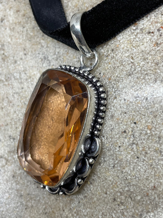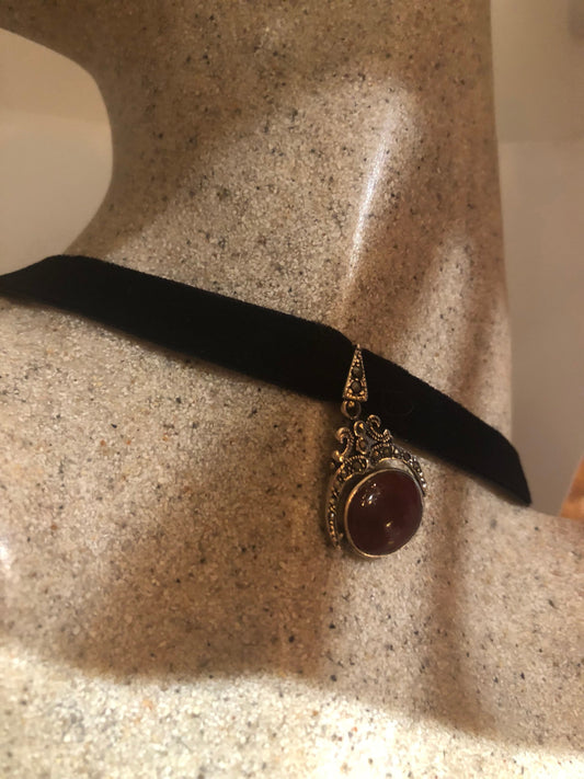 Vintage Black Tourmalated Glass Antique Black Velvet Ribbon Choker Necklace