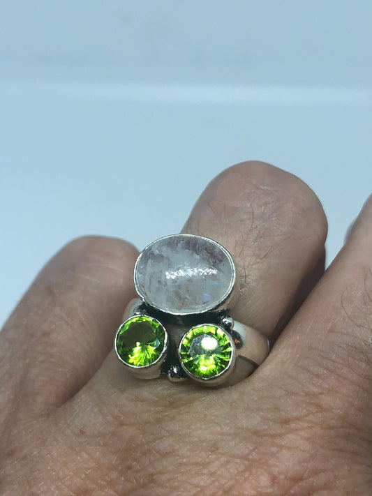 Vintage Large Blue White Rainbow Moonstone Peridot Stone Silver Ring