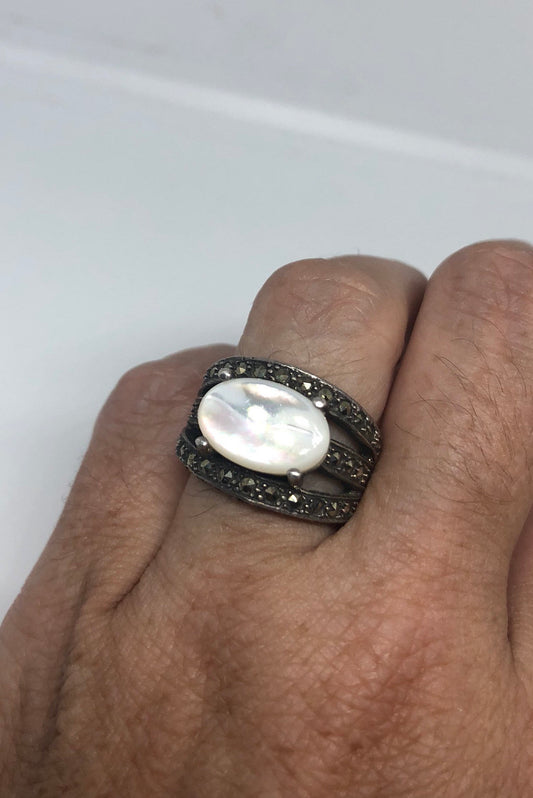 Vintage Mother of Pearl 925 Sterling Silver Marcasite Cocktail Ring