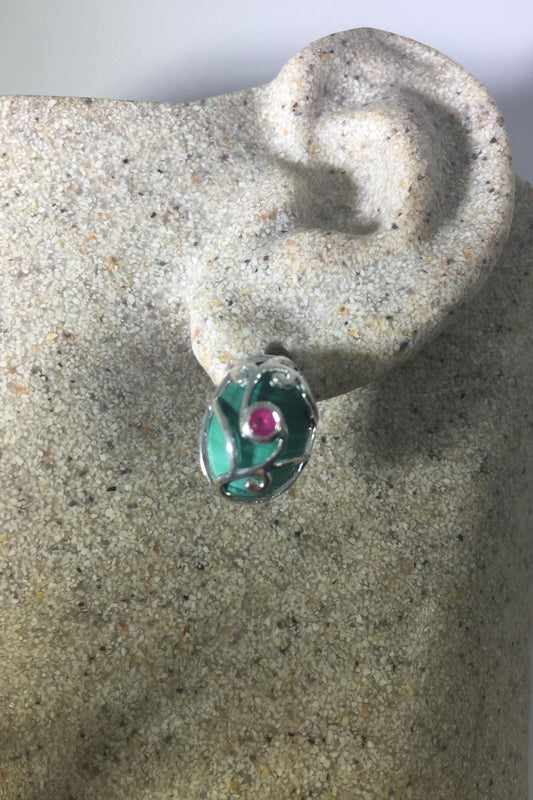 Vintage Handmade 925 Sterling Silver Green malachite and Ruby Stud Earrings