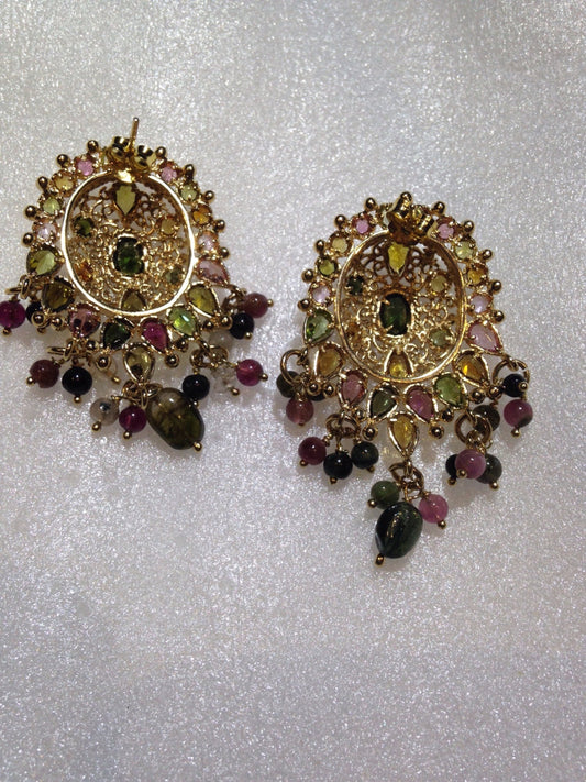 Vintage Genuine Mixed Color Tourmaline 925 Sterling Silver Golden Chandelier Dangle Earrings
