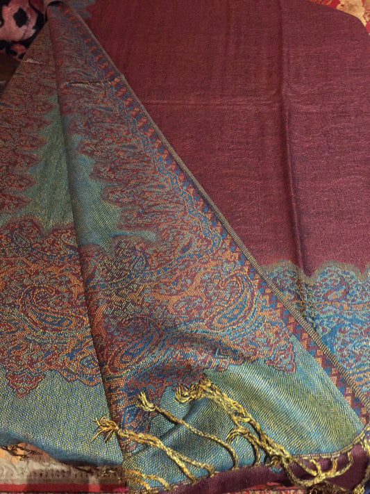 Vintage Burgundy Turquoise Paisley Brocade Pashmina Scarf Wrap