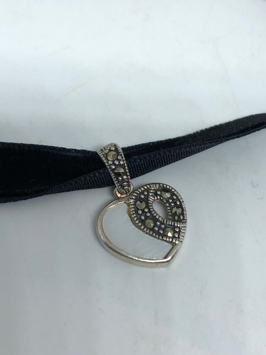 Vintage Deco Marcasite Heart Locket Choker 925 Sterling Silver Necklace