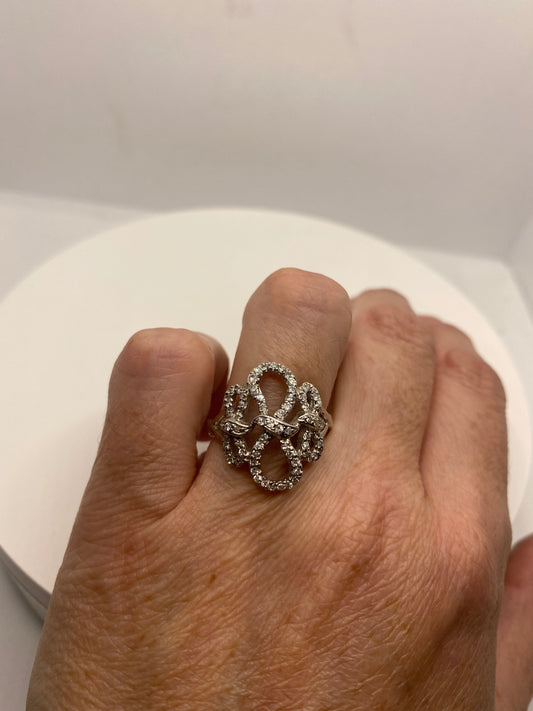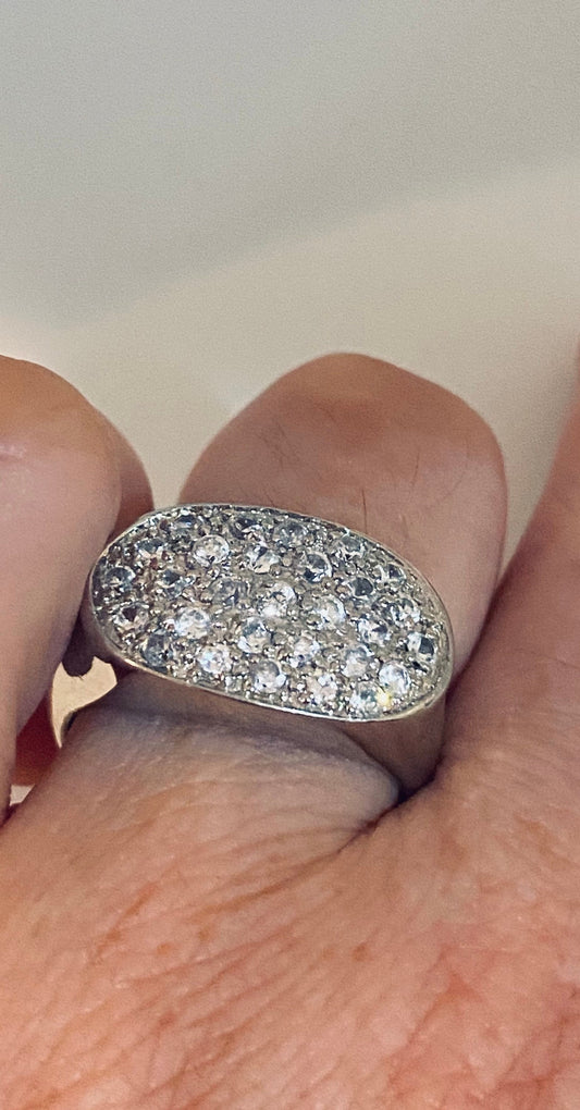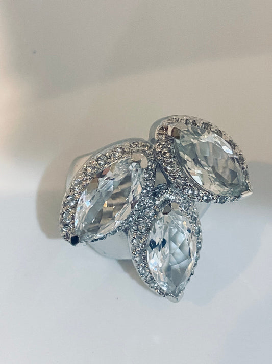 Vintage White Sapphire and Clear Aquamarine 925 Sterling Silver Statement Cocktail Ring
