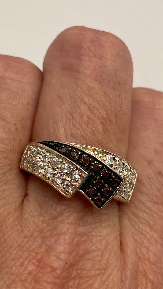 Vintage White Sapphire and Brown Garnet 925 Sterling Silver Wedding Band Ring
