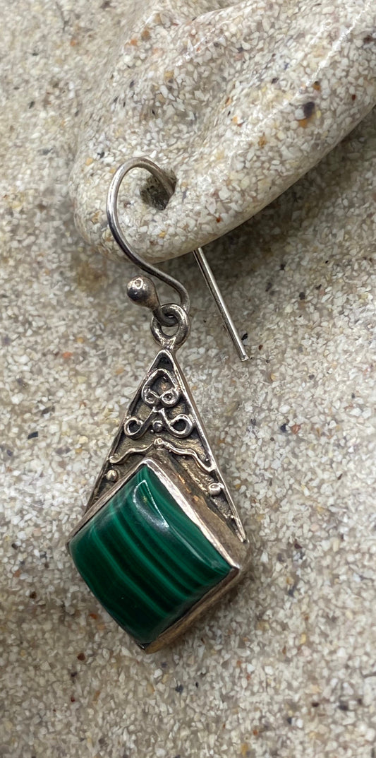 Antique Vintage Green Malachite 925 Sterling Silver Dangle Earrings
