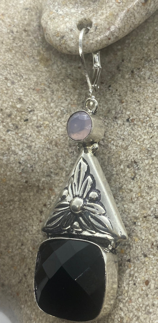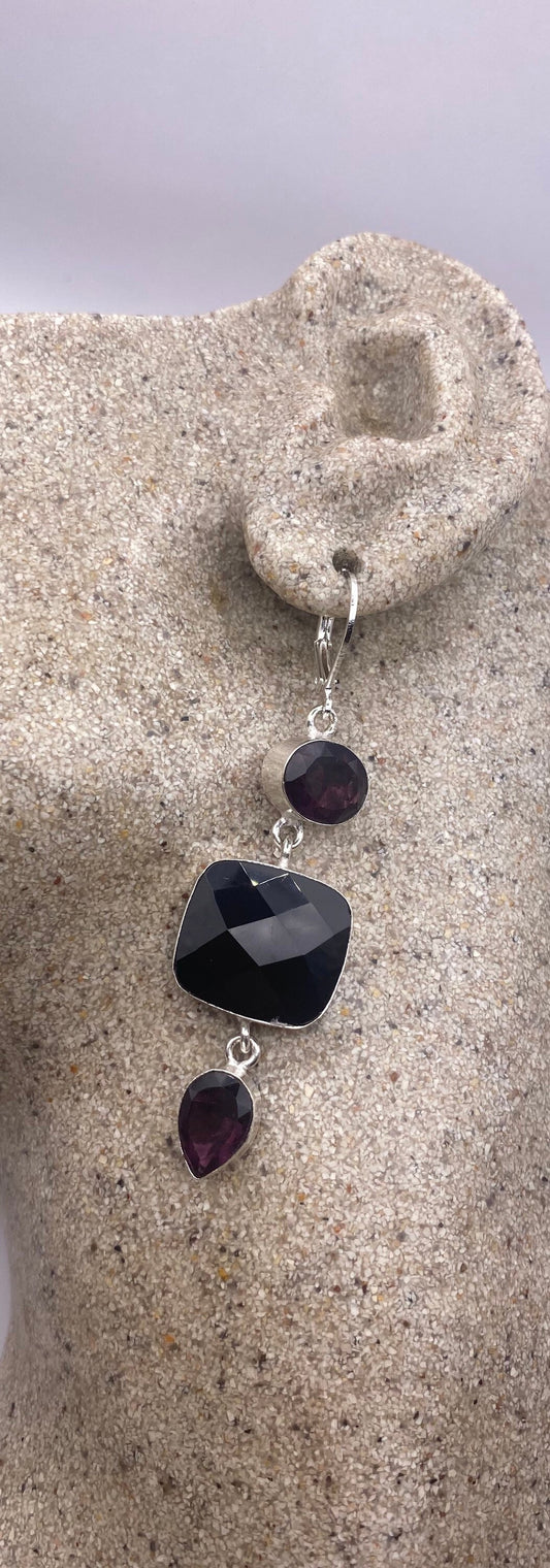 Vintage Black Onyx Amethyst Sterling Silver Deco Dangle Earrings