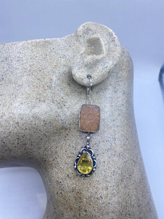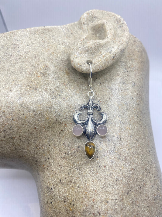 Vintage Rose Quartz Tigers Eye Sterling Silver Lever Back Dangle Earrings