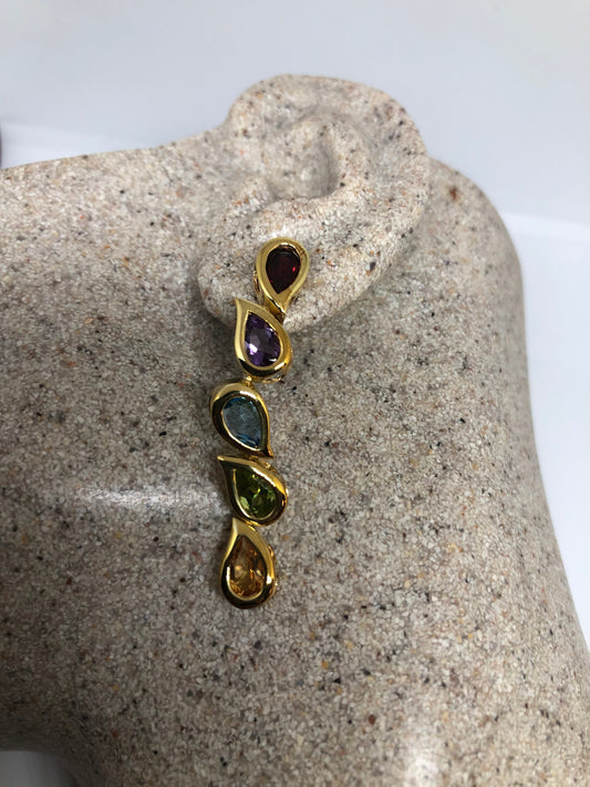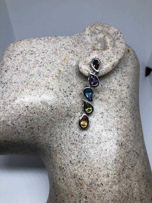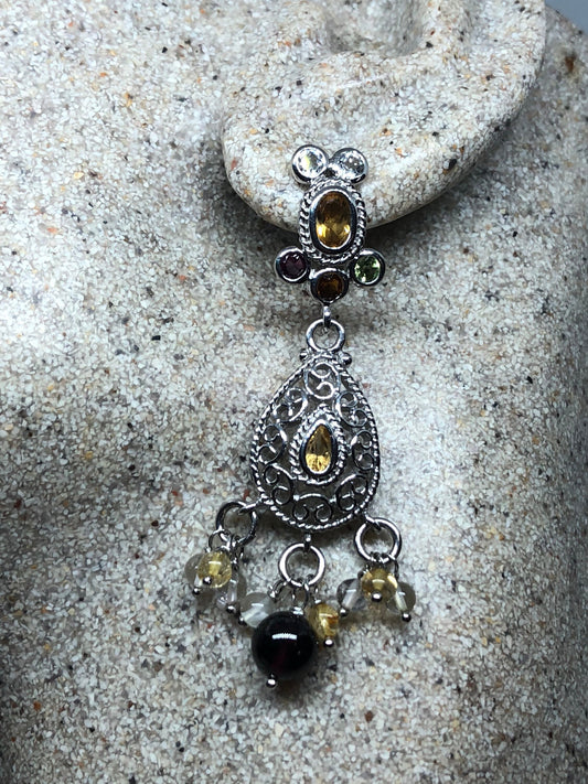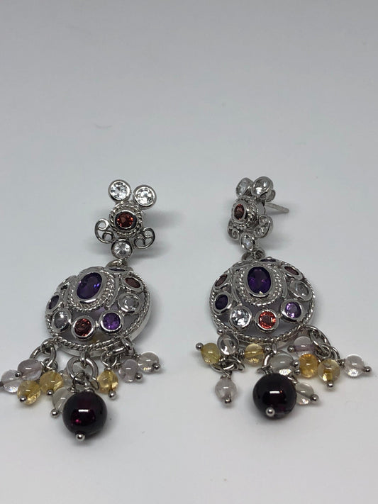 Vintage Mixed Genuine Gemstone Filigree 925 Sterling Silver Dangle button Earrings