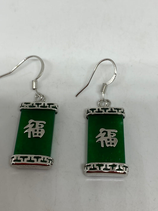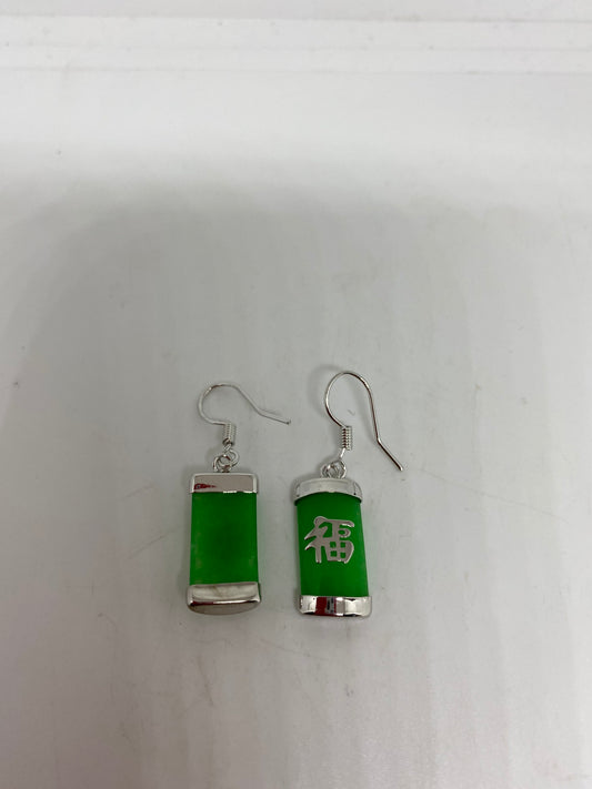 Vintage Fun Green Jade Gemstone Silver Bronze Earrings