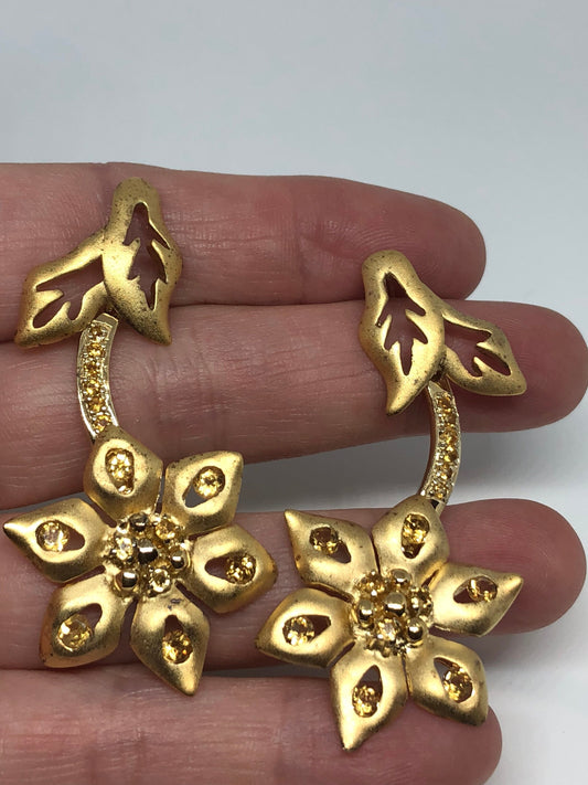 Vintage Genuine Citrine Gemstone Golden 925 Sterling Silver Flower Dangle Earrings