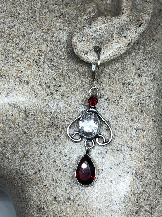 Vintage Red Garnet Clear Quartz Earrings 925 Sterling Silver