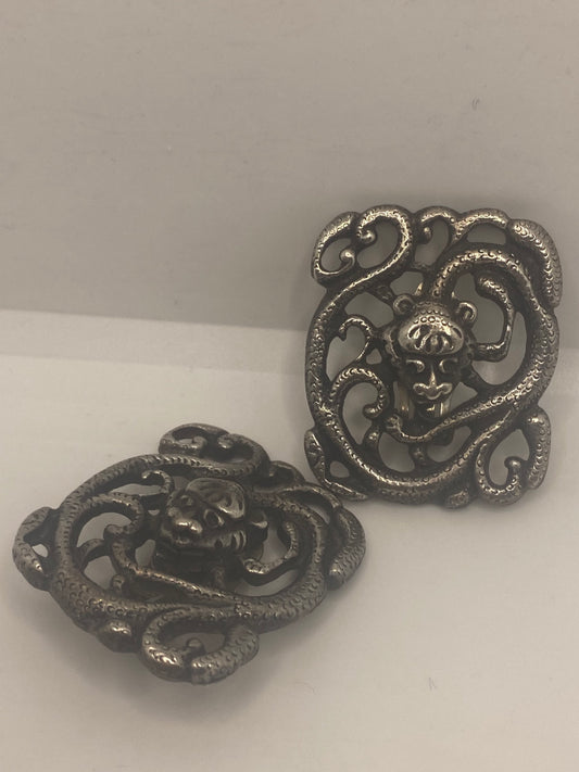 Antique Vintage Asian Dragon 925 Sterling Silver Clip On Button Earrings