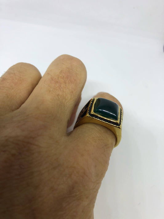 Vintage Gothic Gold Finished Genuine Green Onyx Free Mason Mens Ring