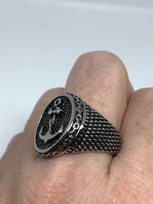 Vintage Silver Stainless Steel Gothic Anchor Mens Ring