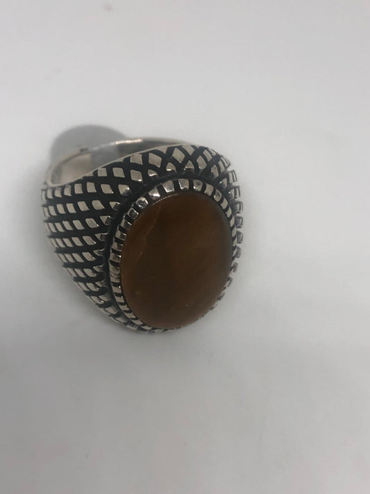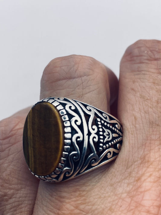 Vintage Gothic Sterling Silver Genuine Tigers Eye Mens Ring