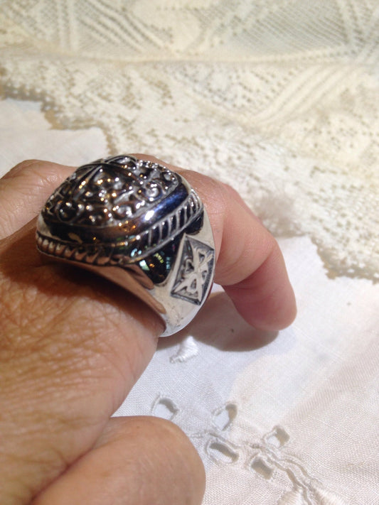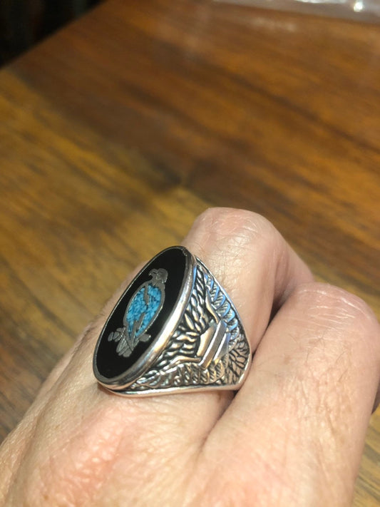 Vintage Native American Style Southwestern Turquoise Stone Inlay Mens Hawk Ring