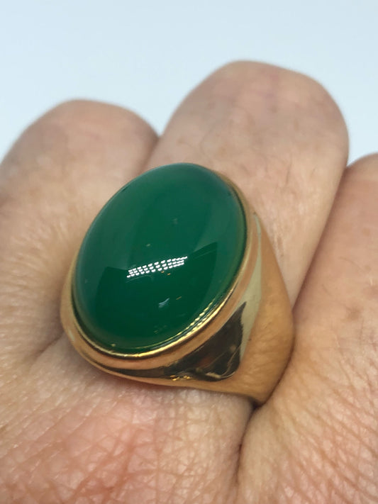 Vintage Gothic Gold Finished Genuine Green Chrysopraise Mens Ring