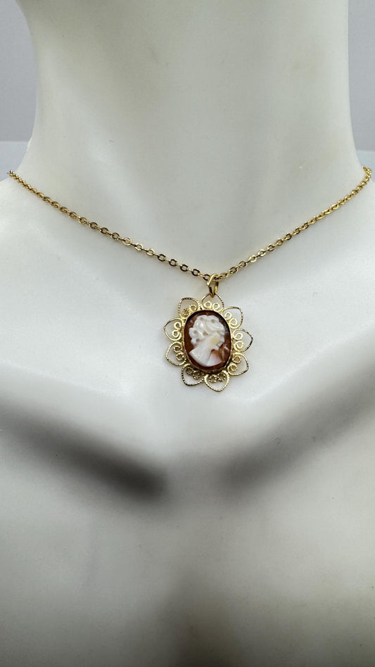 Vintage Carved Cameo Yellow Gold 925 Sterling Silver Necklace Choker pin brooch