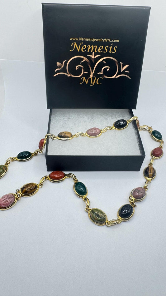 Vintage Green Jade Mixed Stone scarab Yellow 12k Gold Fill Necklace
