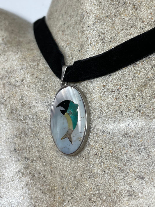 Vintage 925 Sterling Silver Genuine Gemstone Inlay Dolphin Choker Necklace