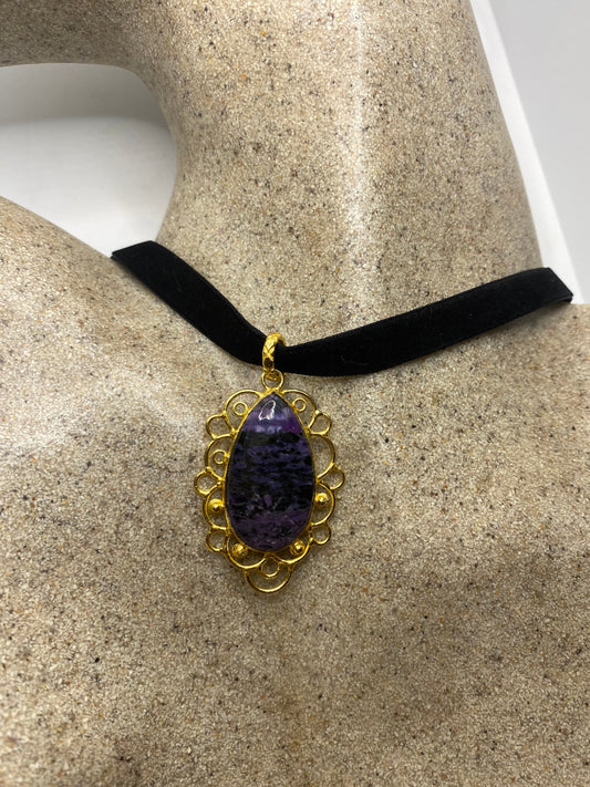 Vintage Cabochon Purple Charlite Golden Choker Necklace