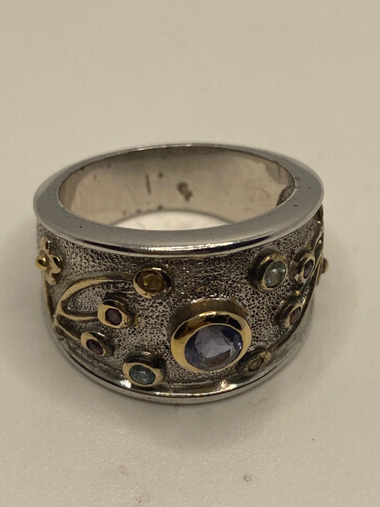 Vintage Handmade Ruby Emerald Sapphire Setting Sterling Silver Gothic Ring