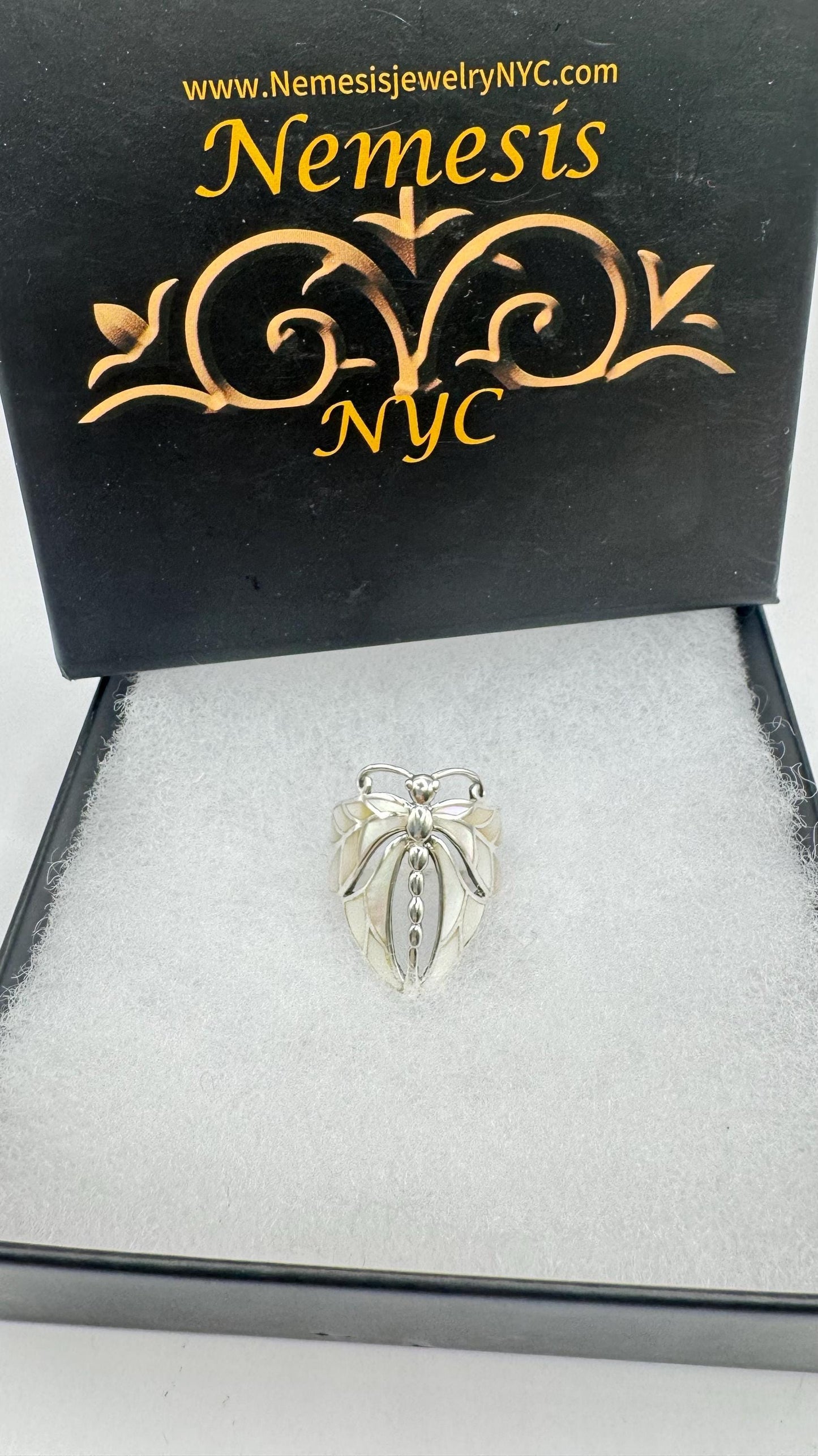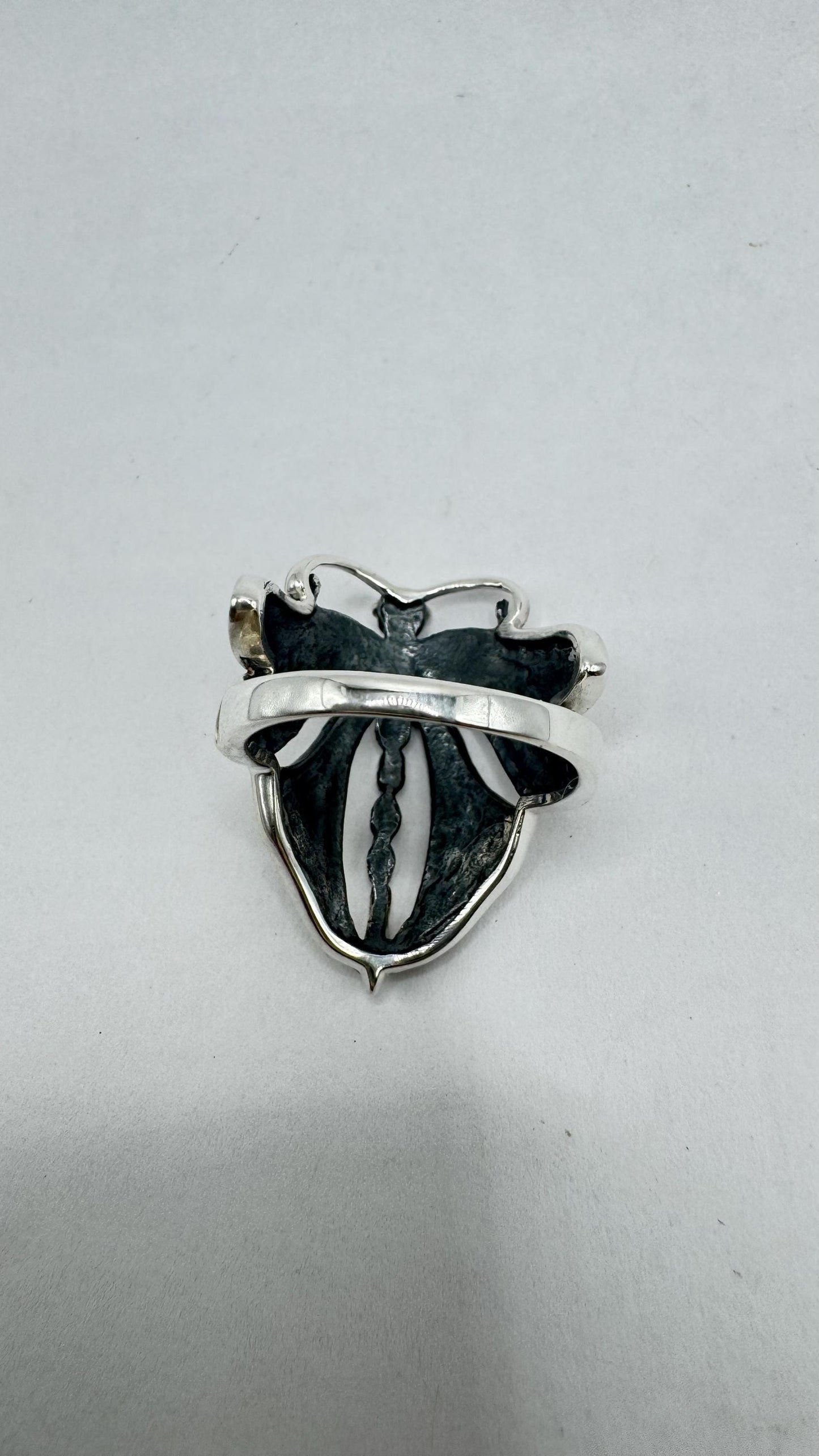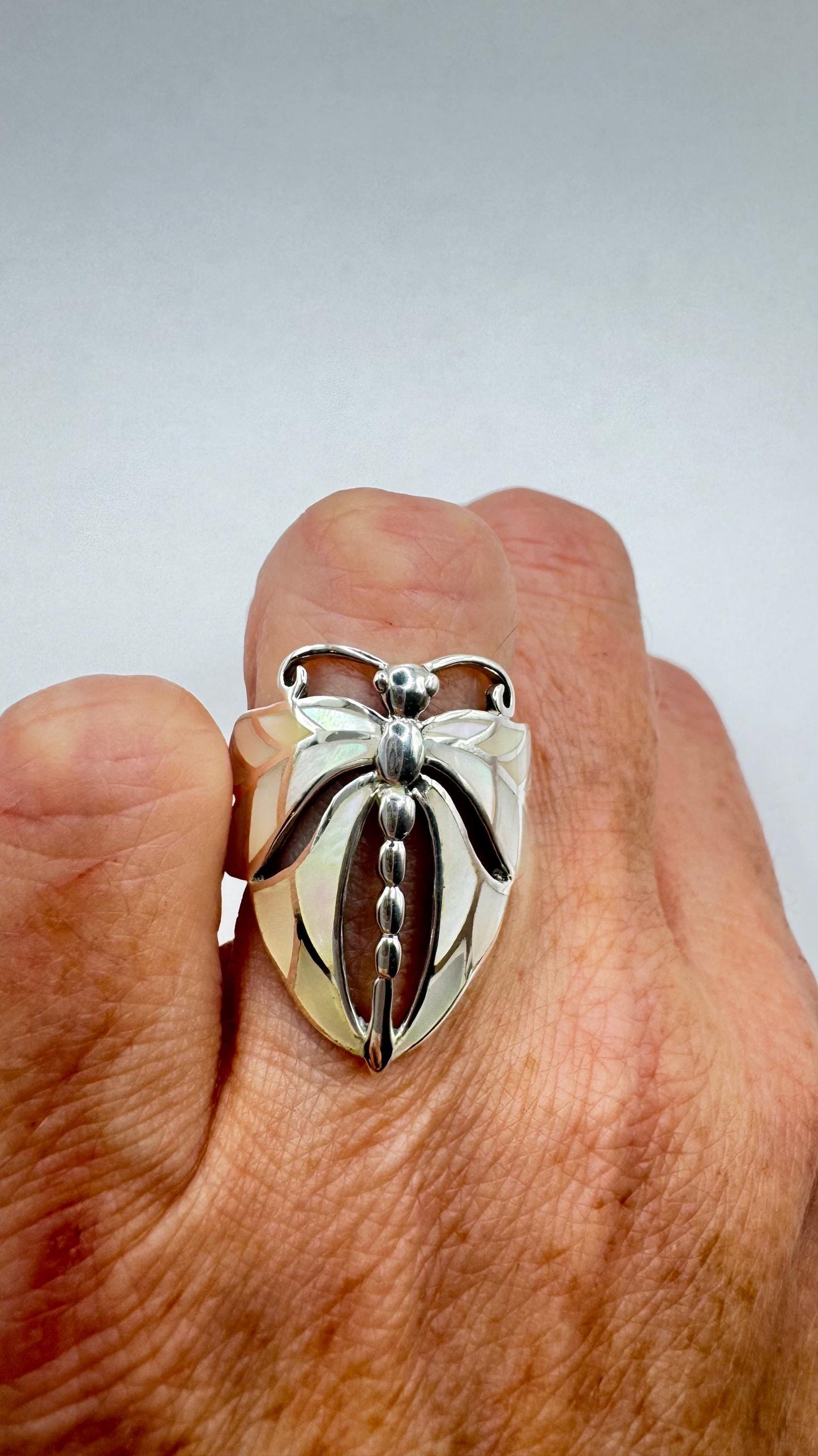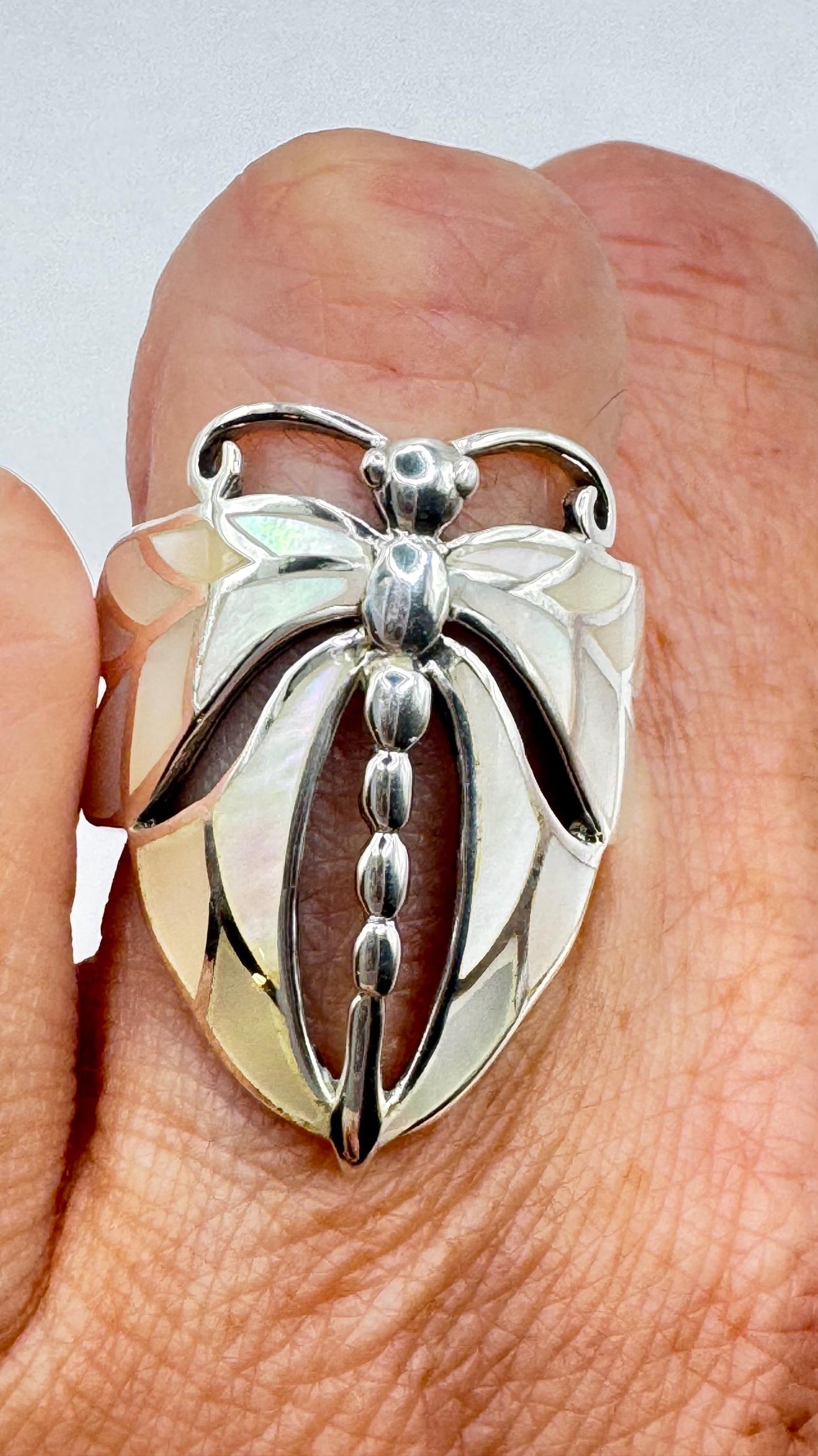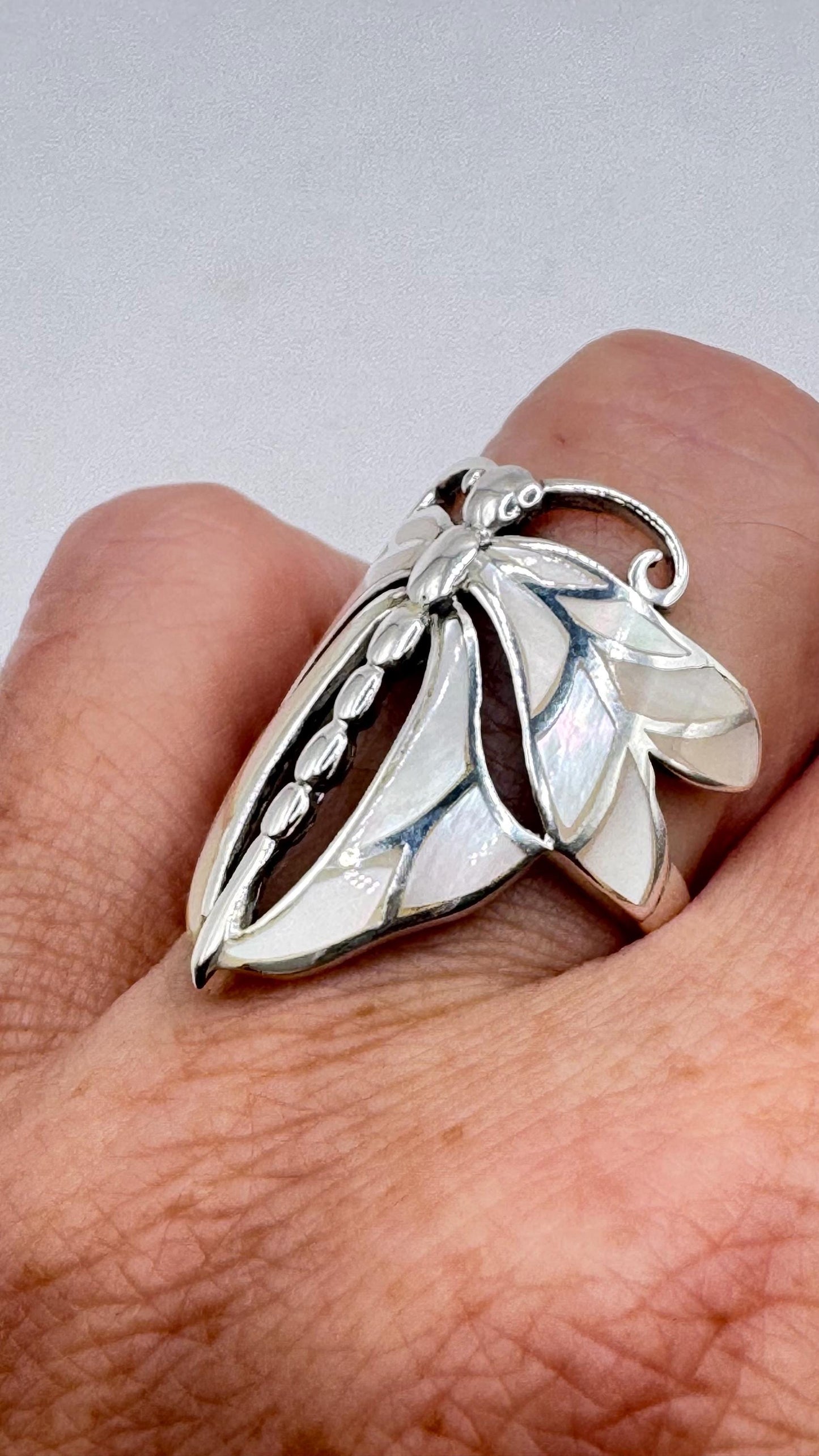 Antique Deco Mother of Pearl Dragonfly 925 Sterling Silver Ring