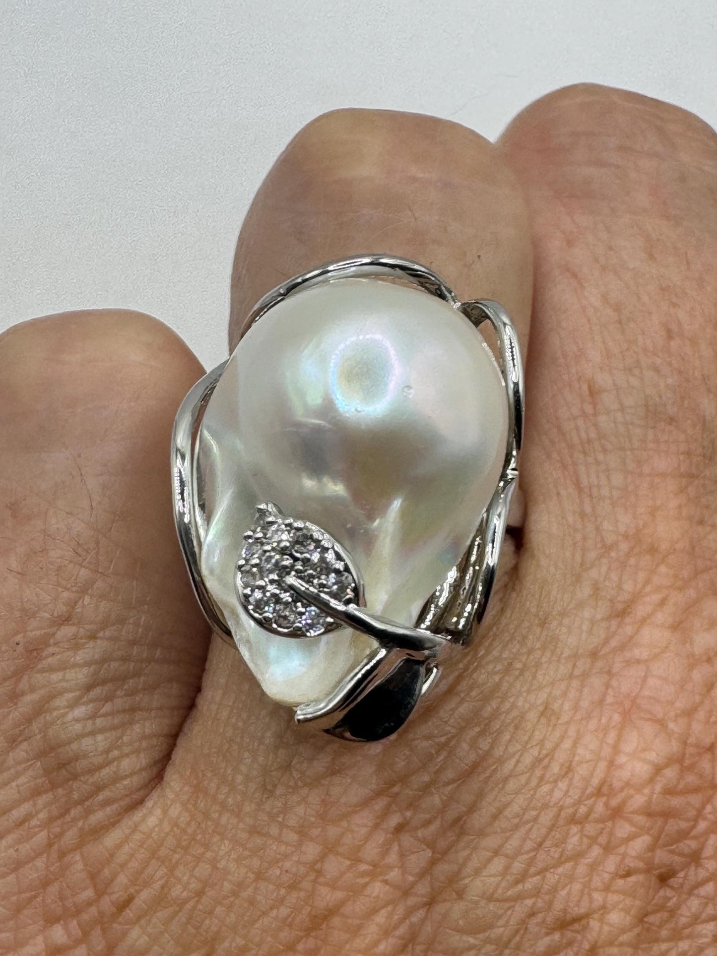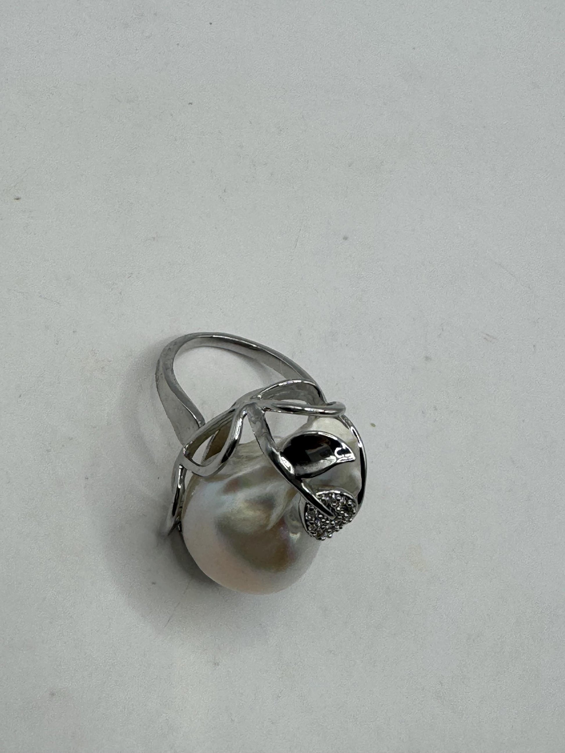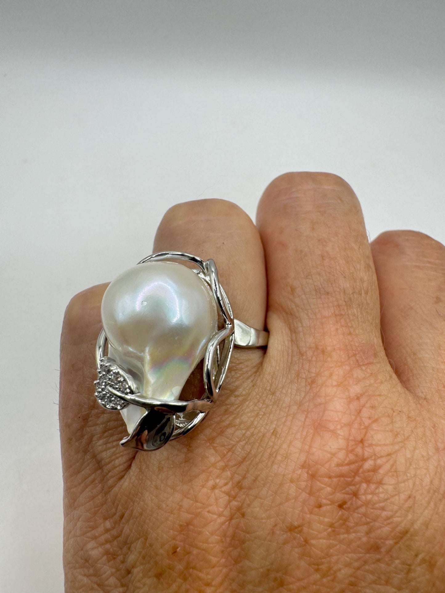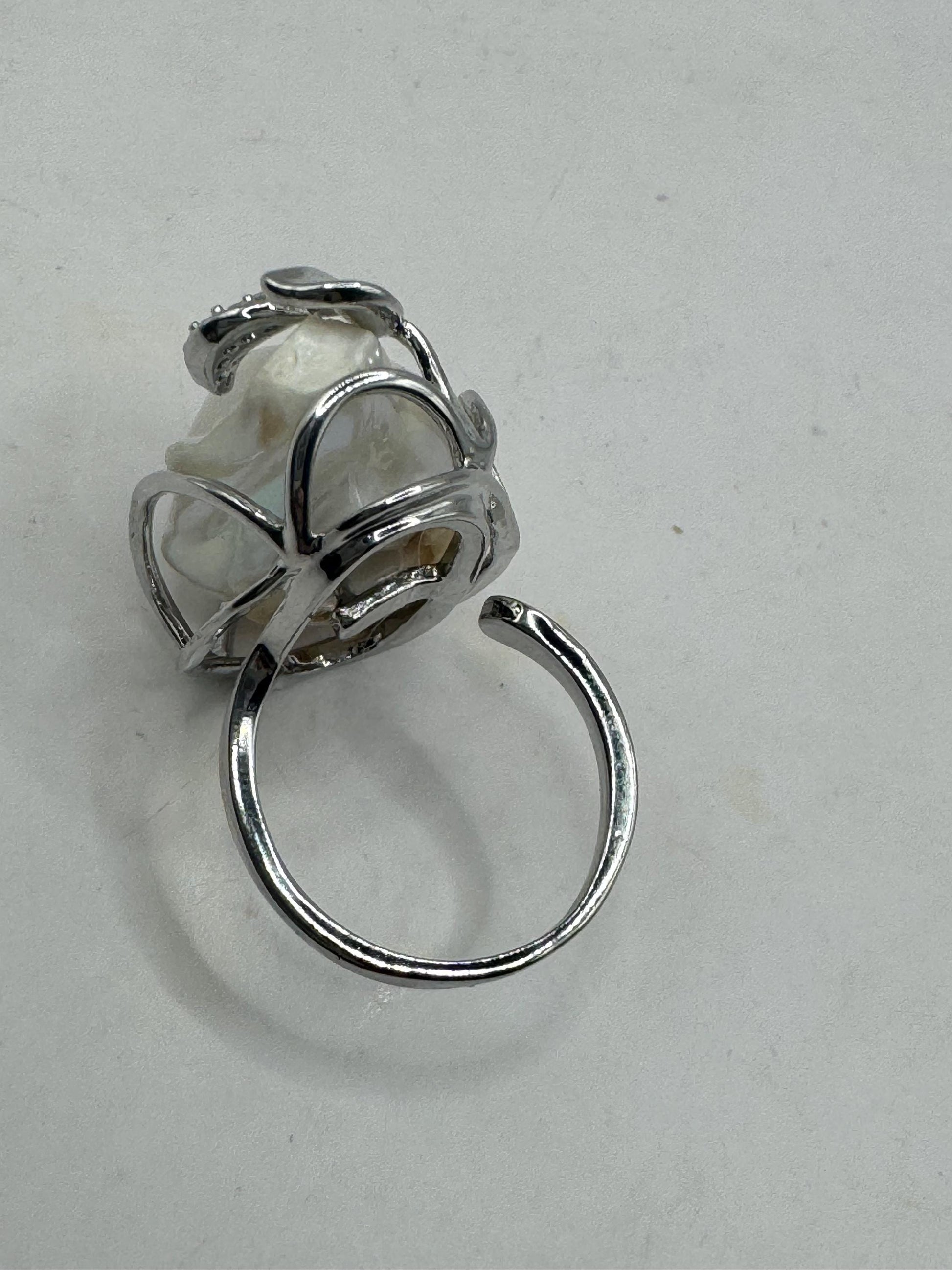 Vintage Biwa white pearl Ring rhodium 925 Sterling Silver Cocktail Statement