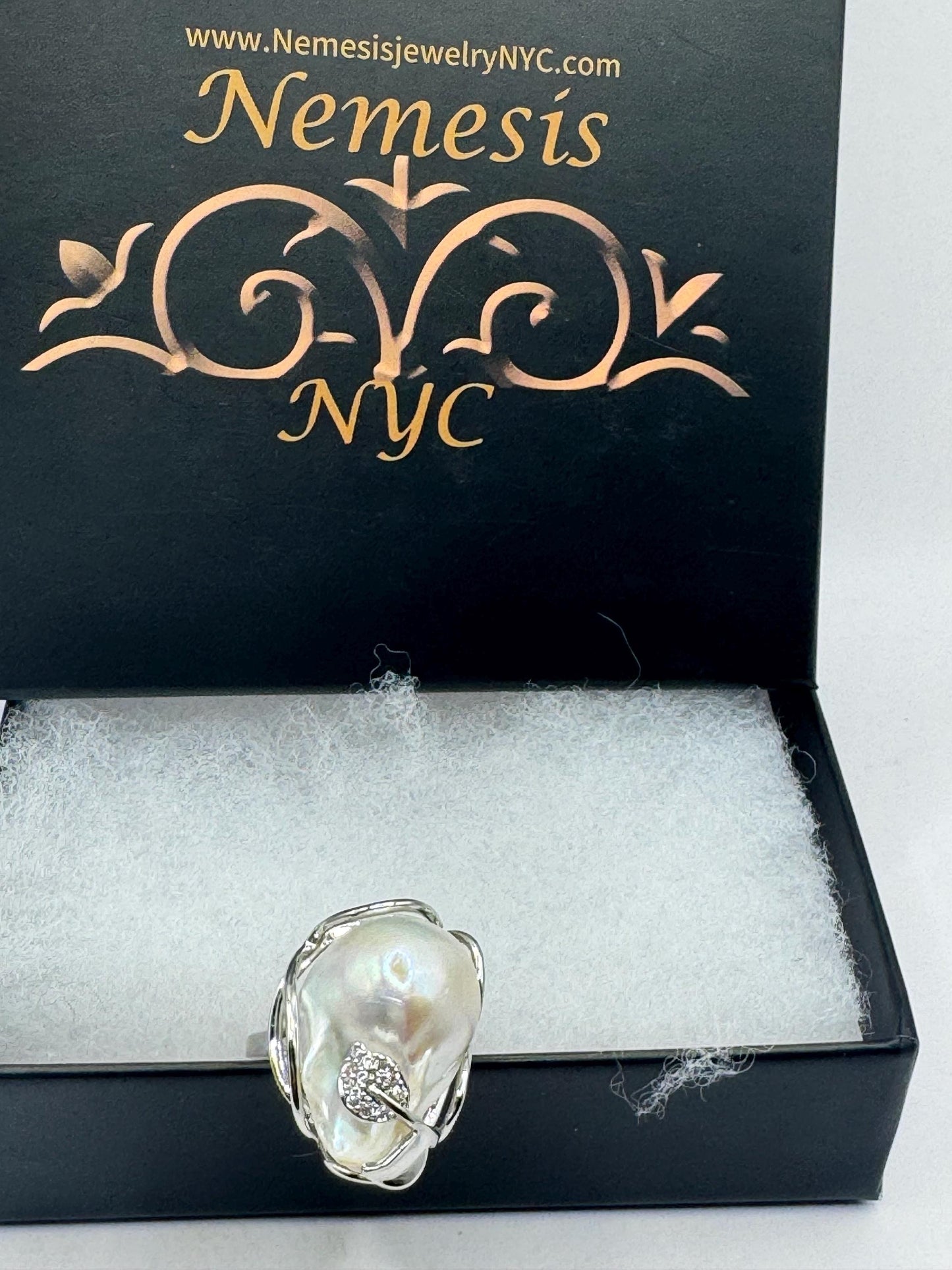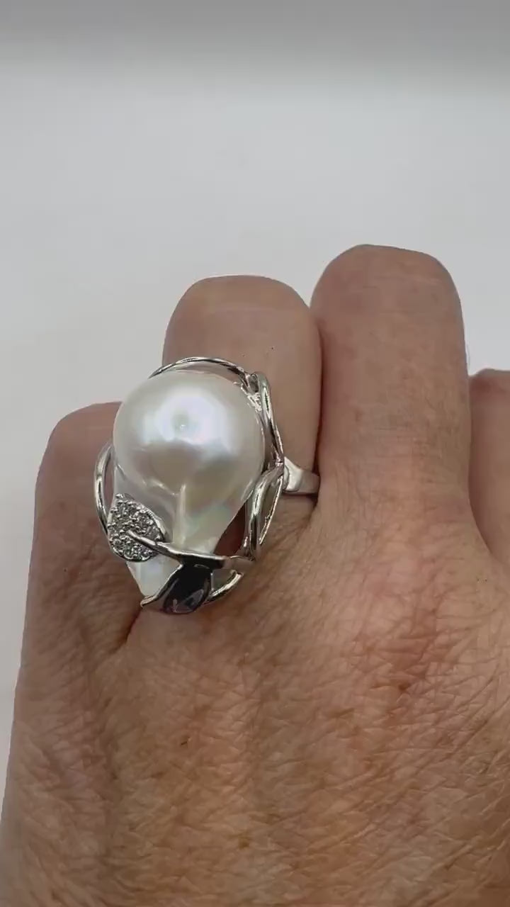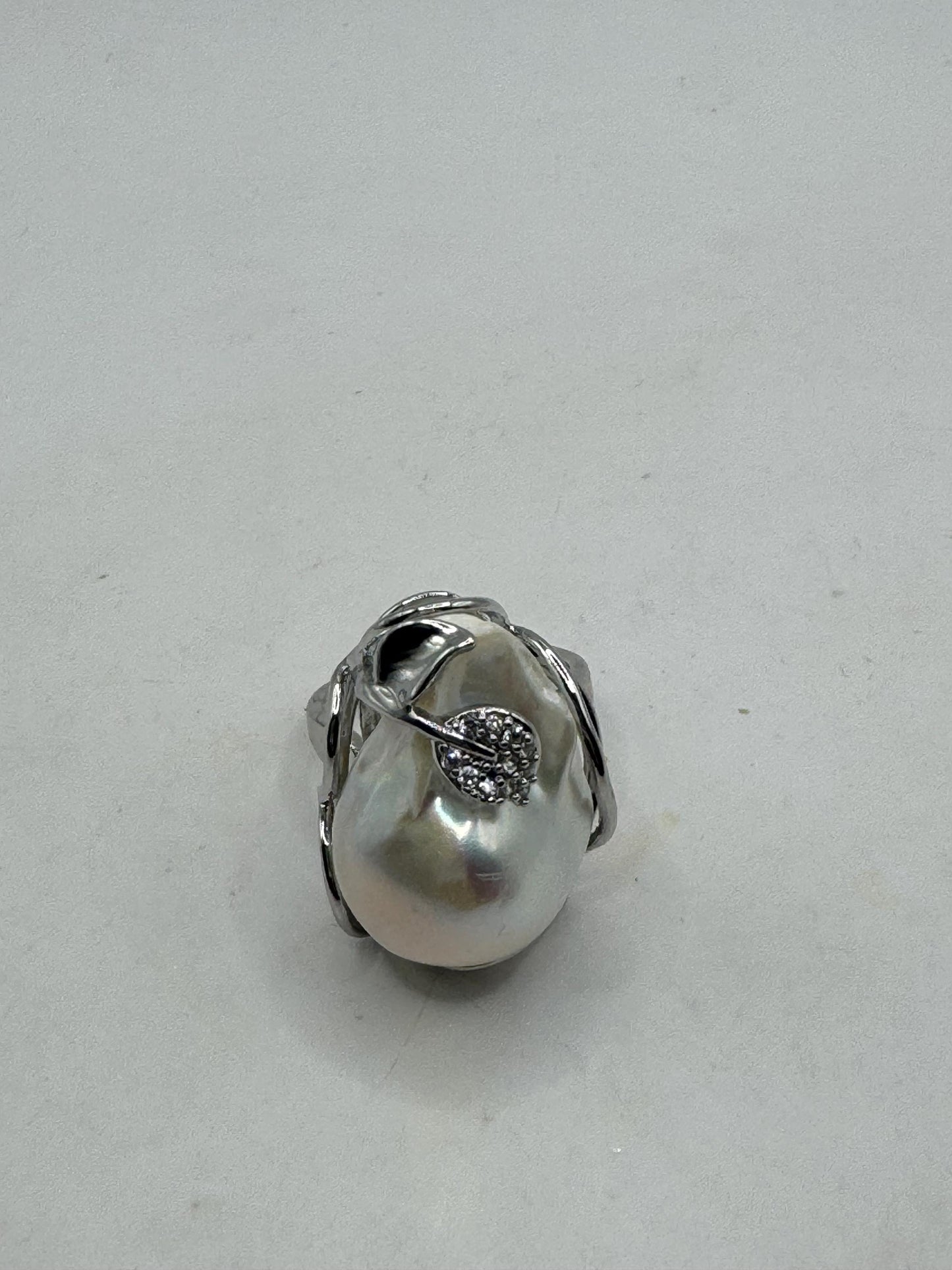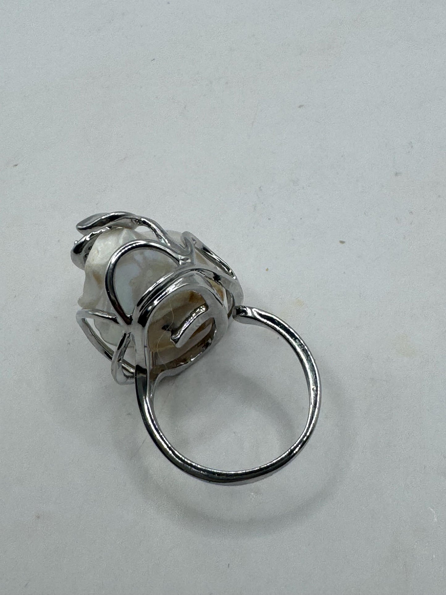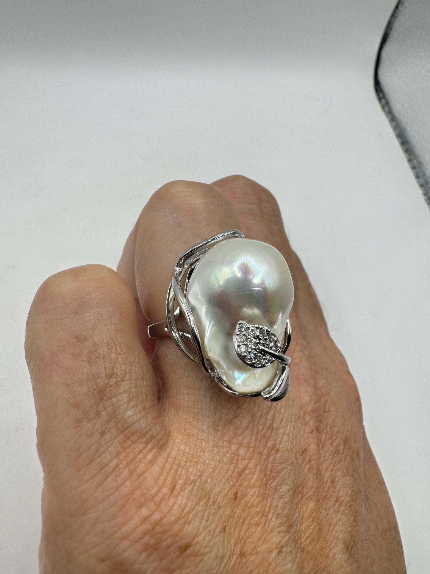 Vintage Biwa white pearl Ring rhodium 925 Sterling Silver Cocktail Statement