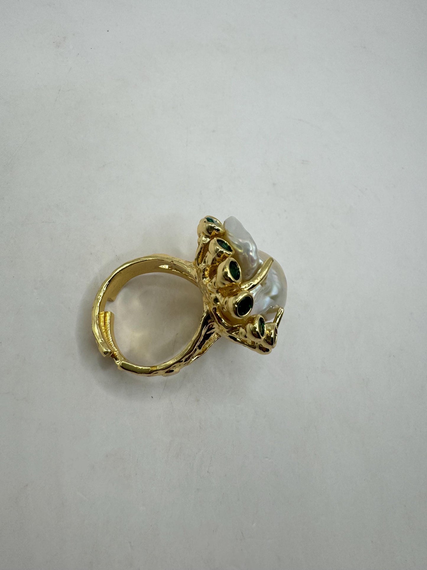 Vintage Biwa Pearl Ring Golden 925 Sterling Silver Cocktail Statement Adjustable
