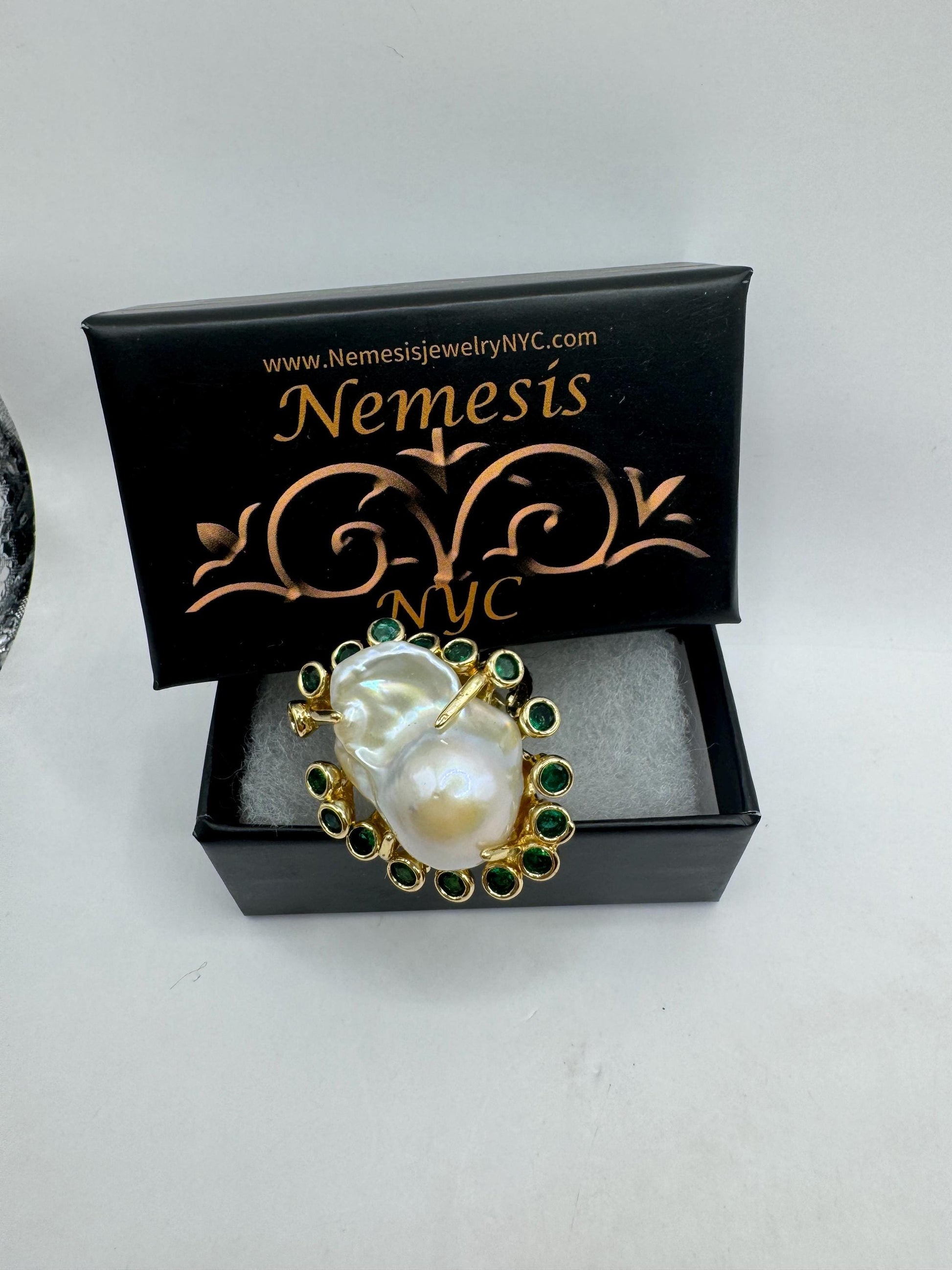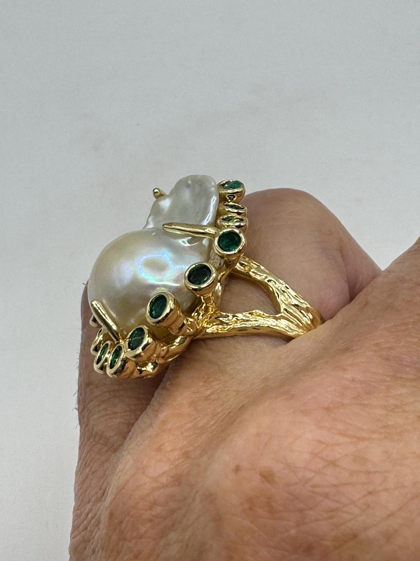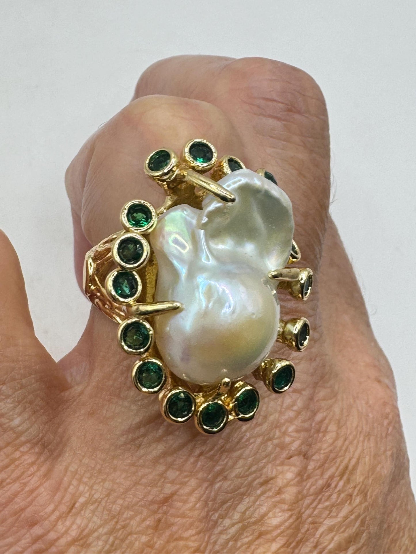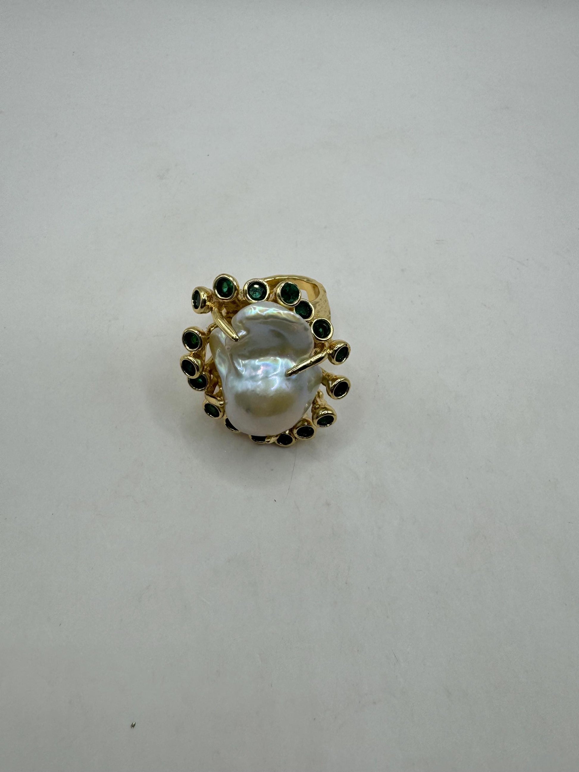 Vintage Biwa white pearl and green chrome diopside Ring Golden 925 Sterling Silver Cocktail Statement