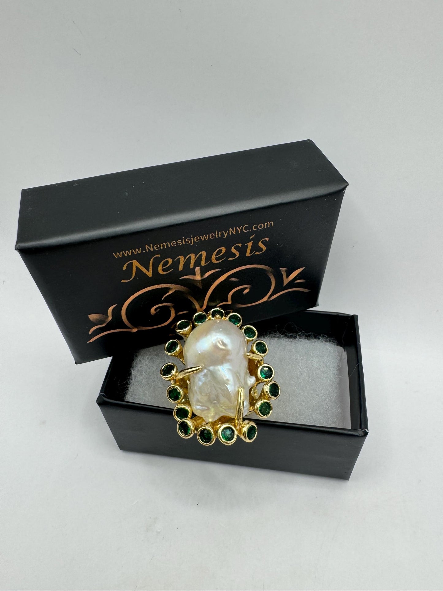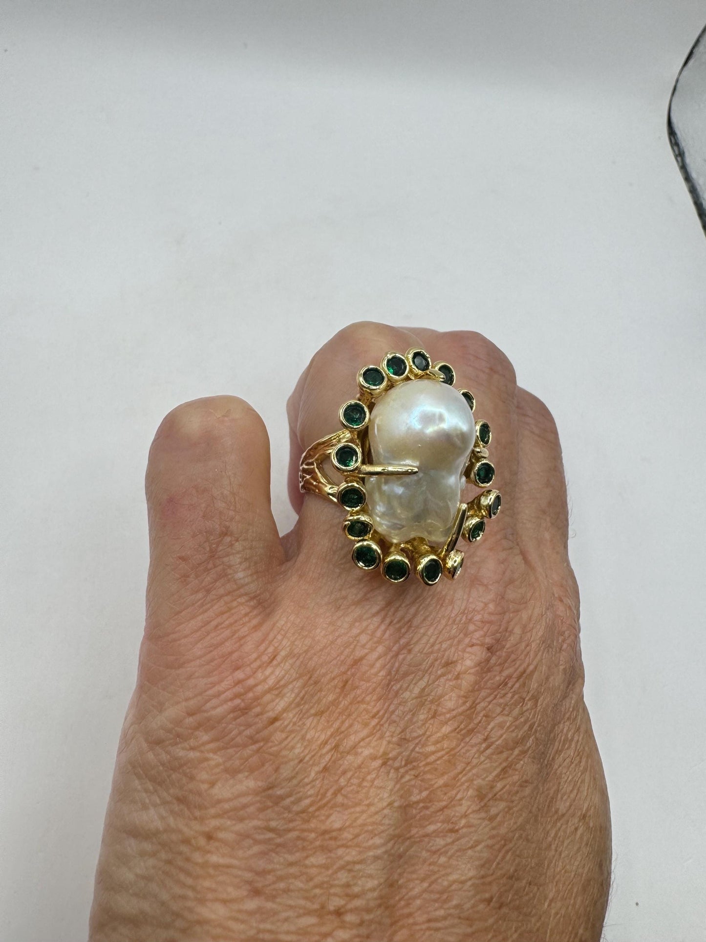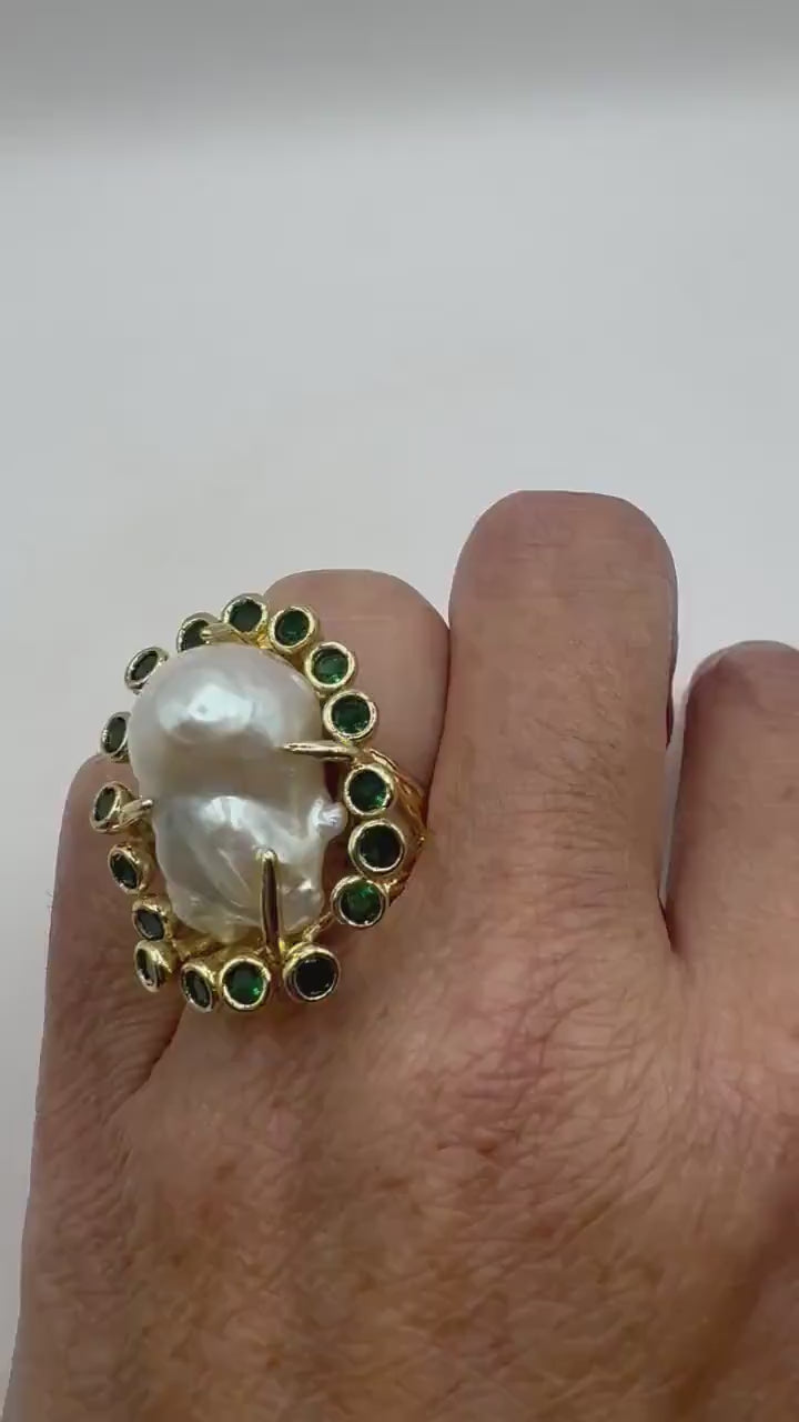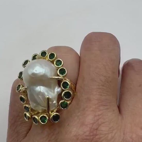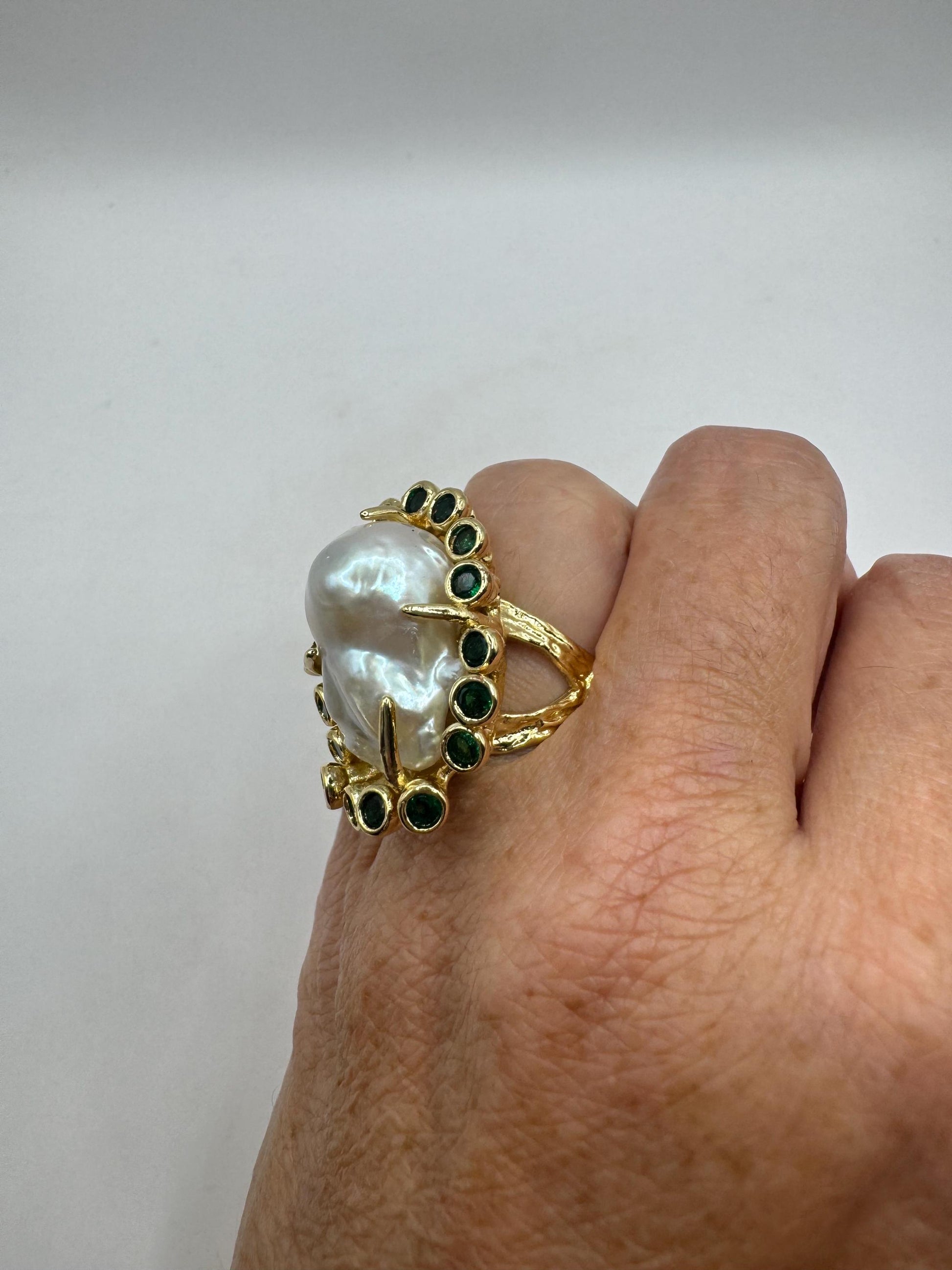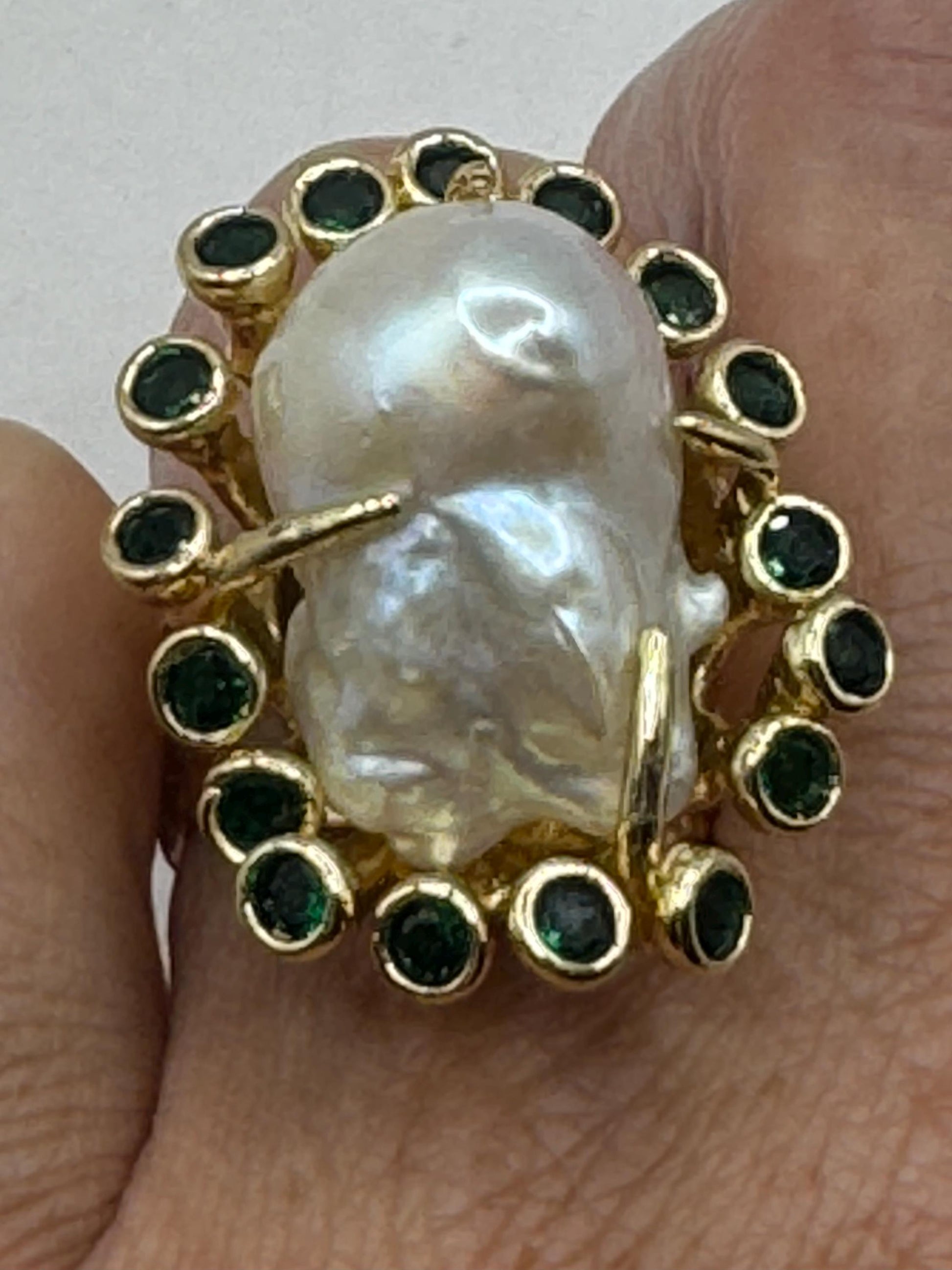 Vintage Biwa white pearl and green chrome diopside Ring Golden 925 Sterling Silver Cocktail Statement