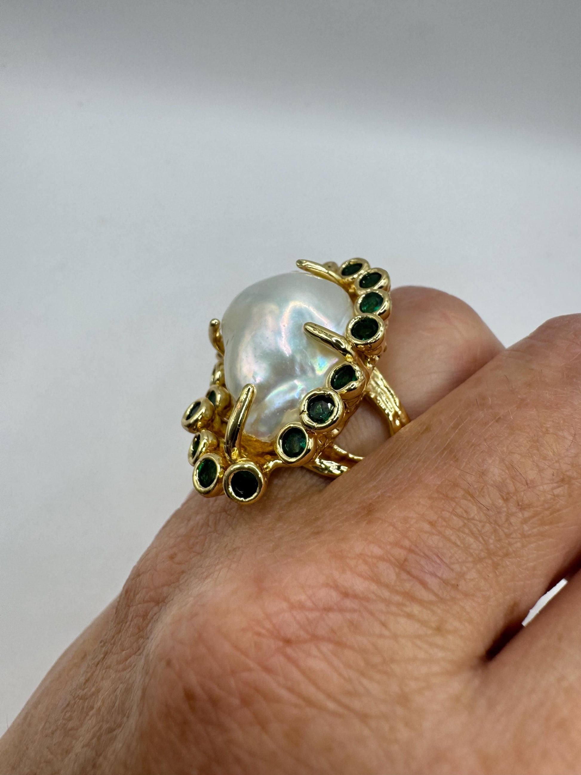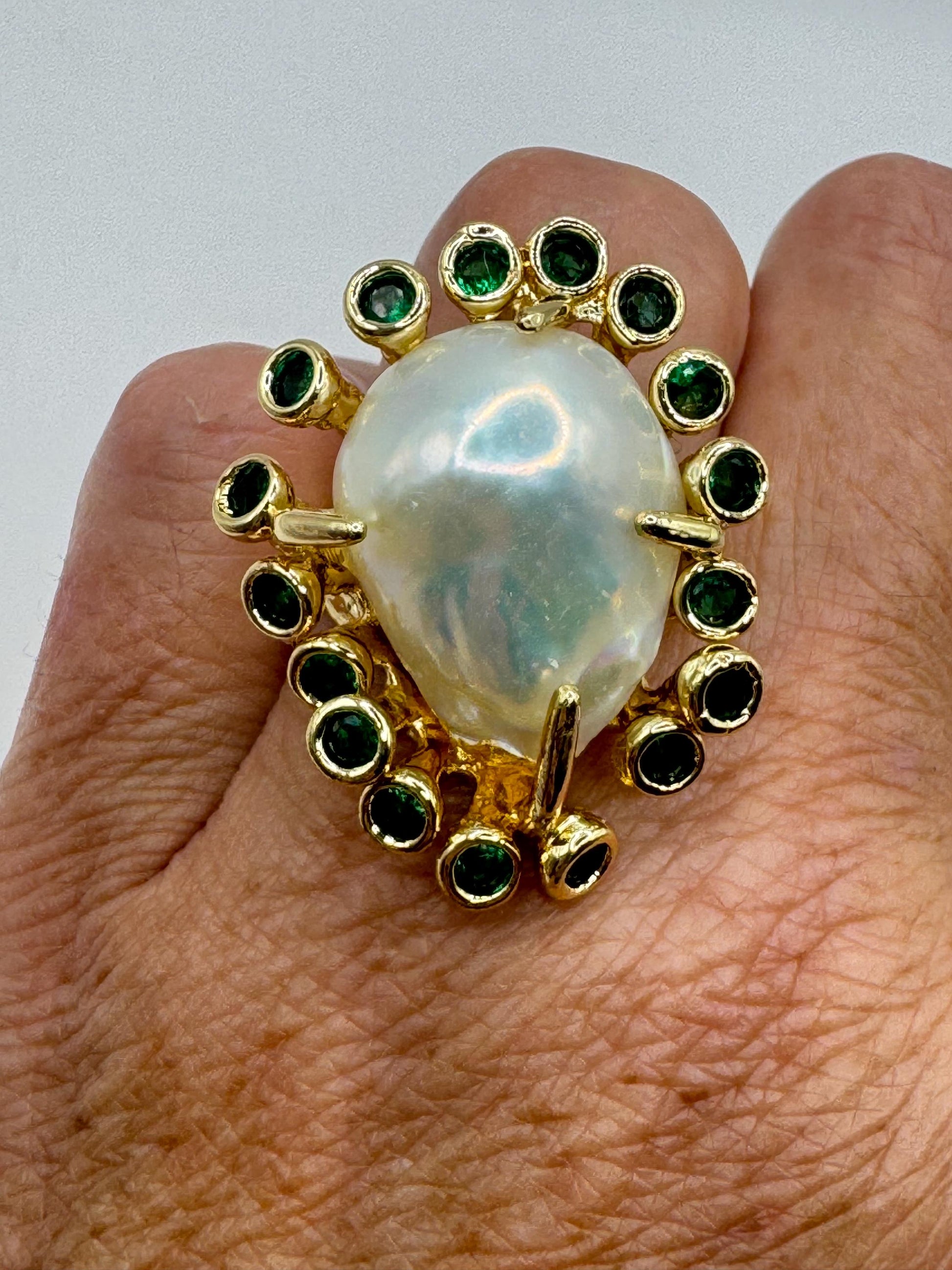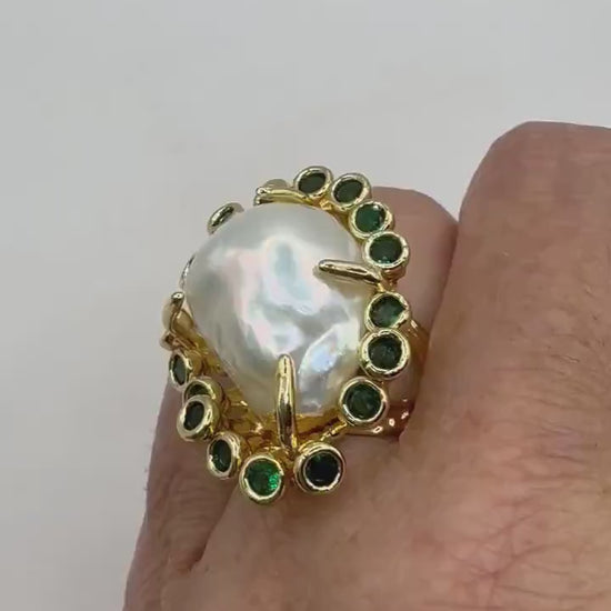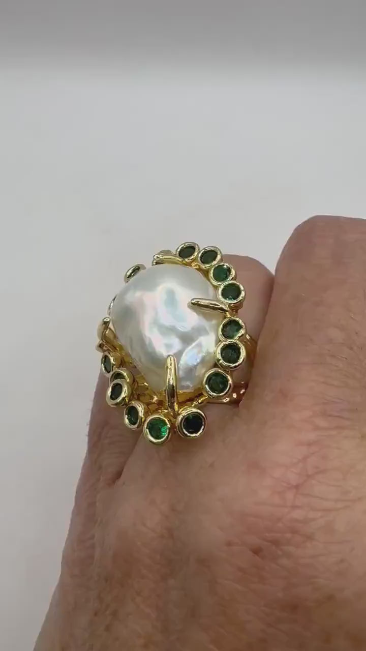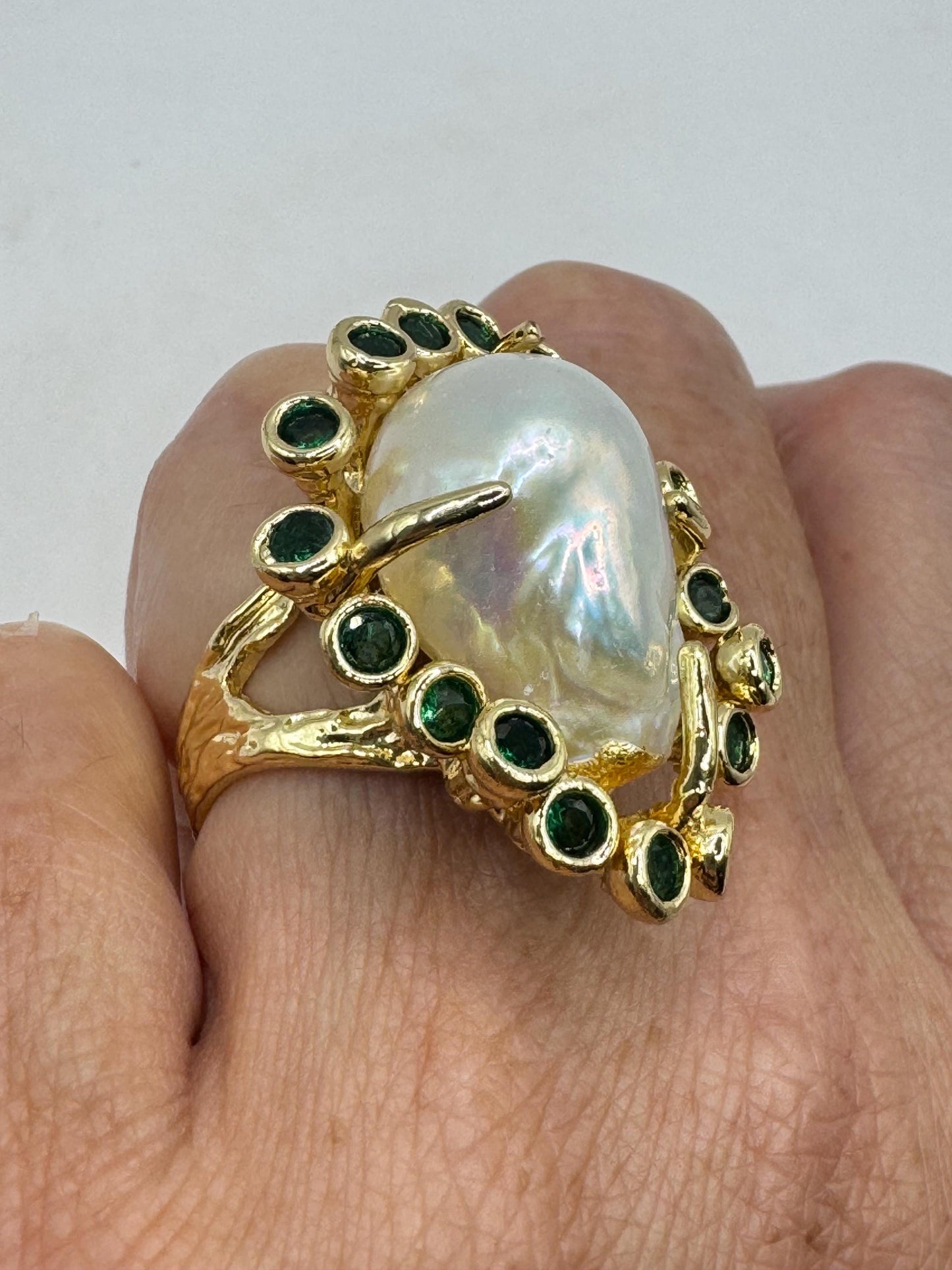 Vintage Biwa white pearl and green chrome diopside Ring Golden 925 Sterling Silver Cocktail Statement