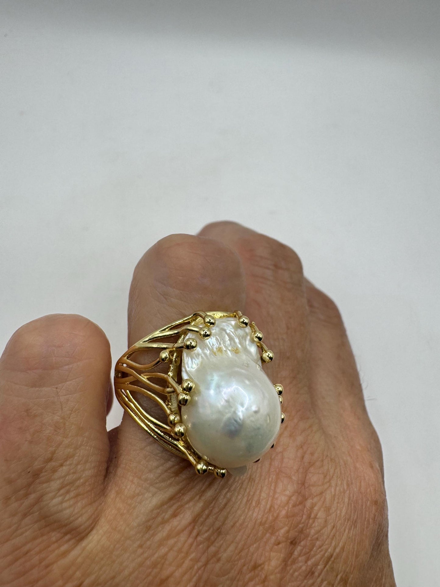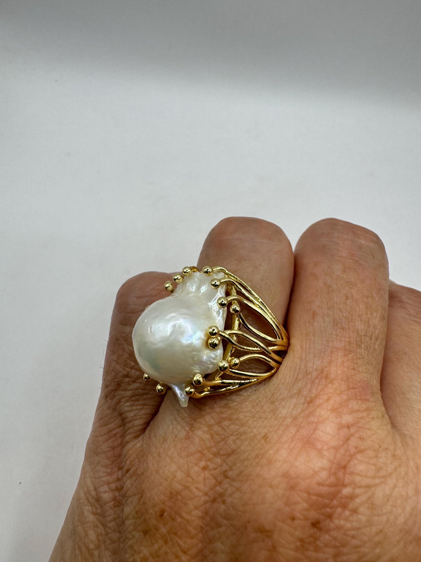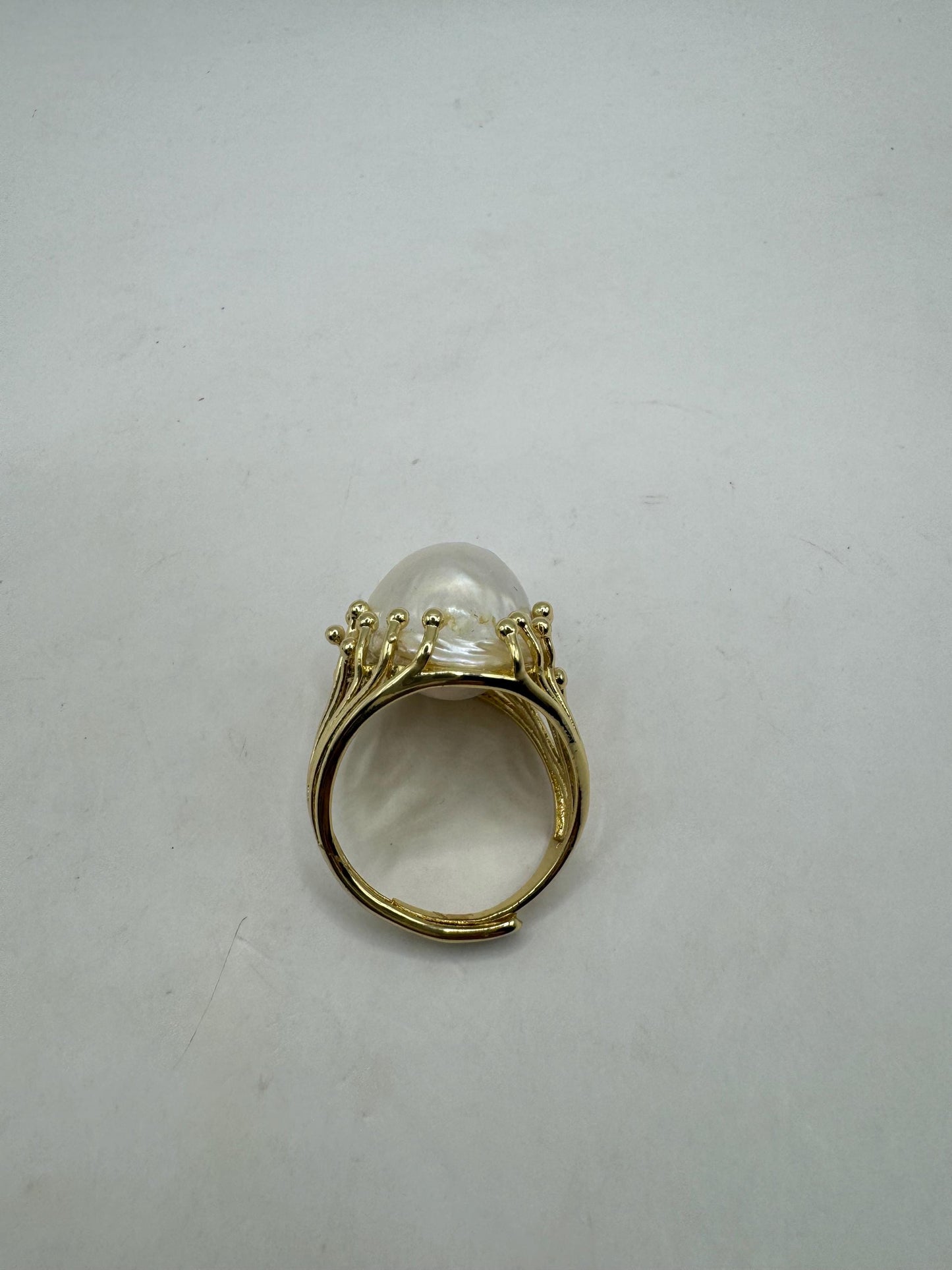 Vintage Biwa white pearl Ring Golden 925 Sterling Silver Cocktail Statement