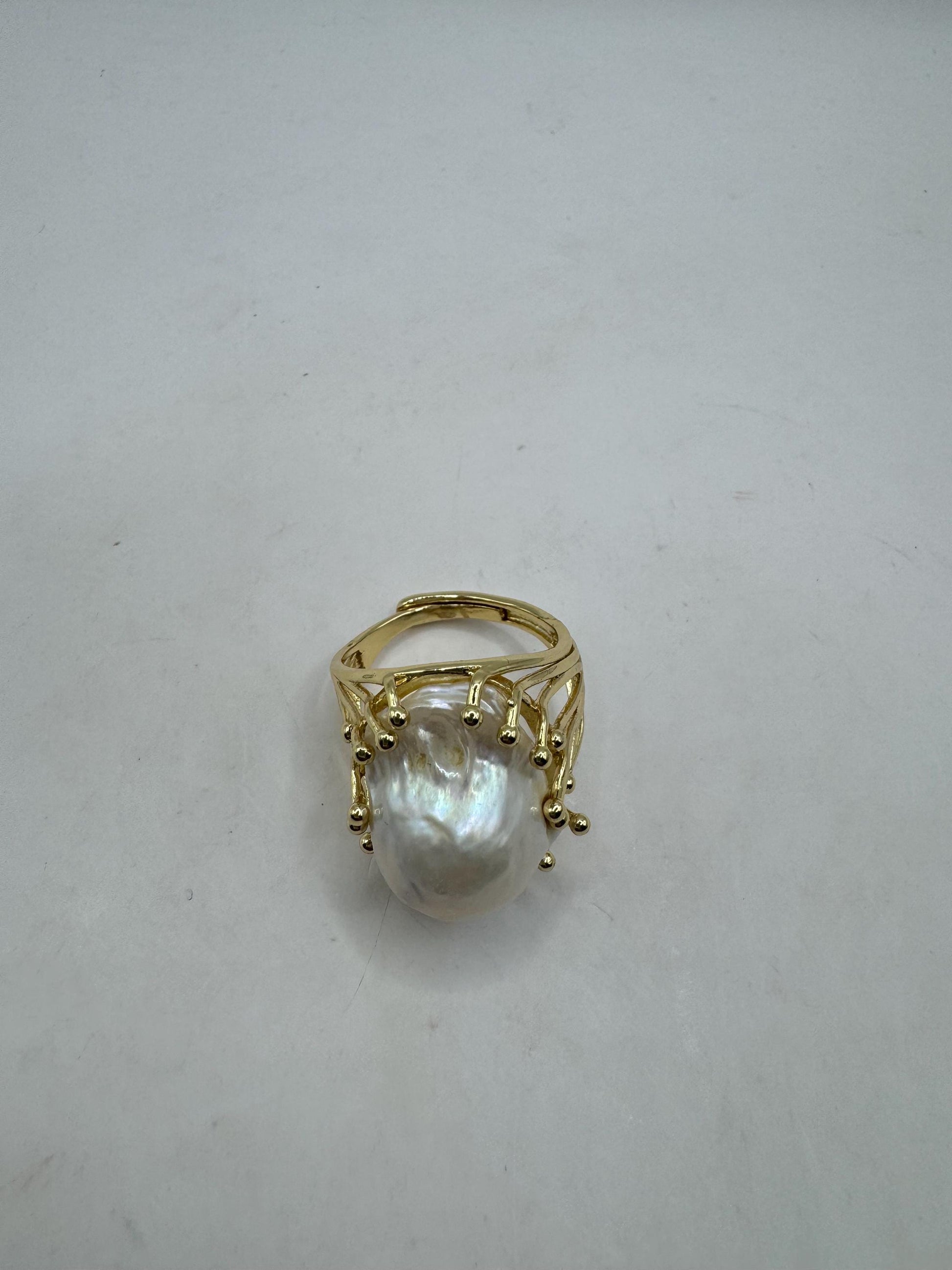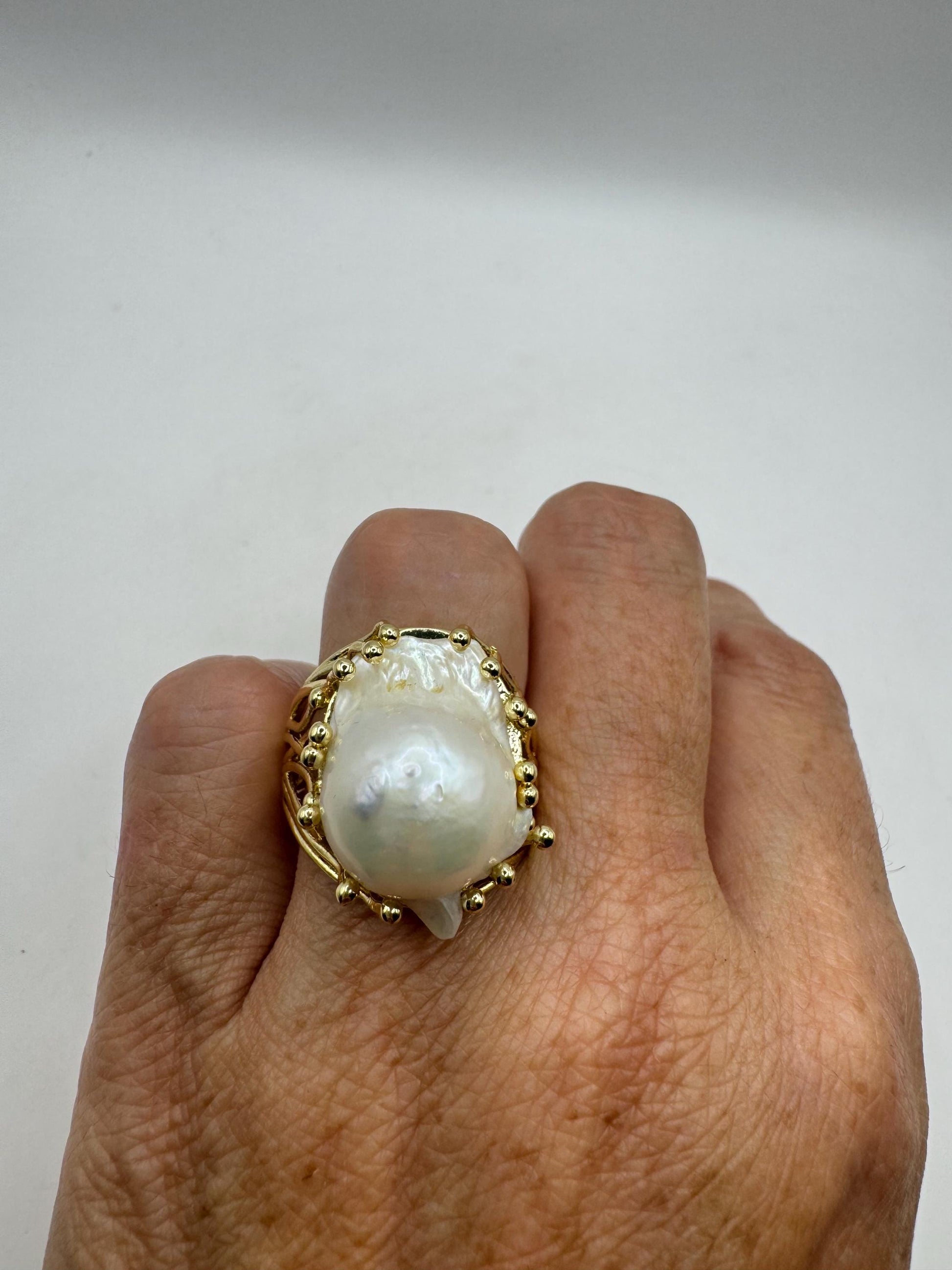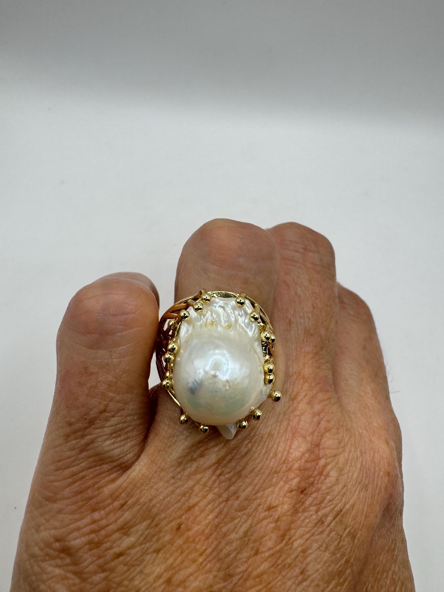 Vintage Biwa white pearl Ring Golden 925 Sterling Silver Cocktail Statement