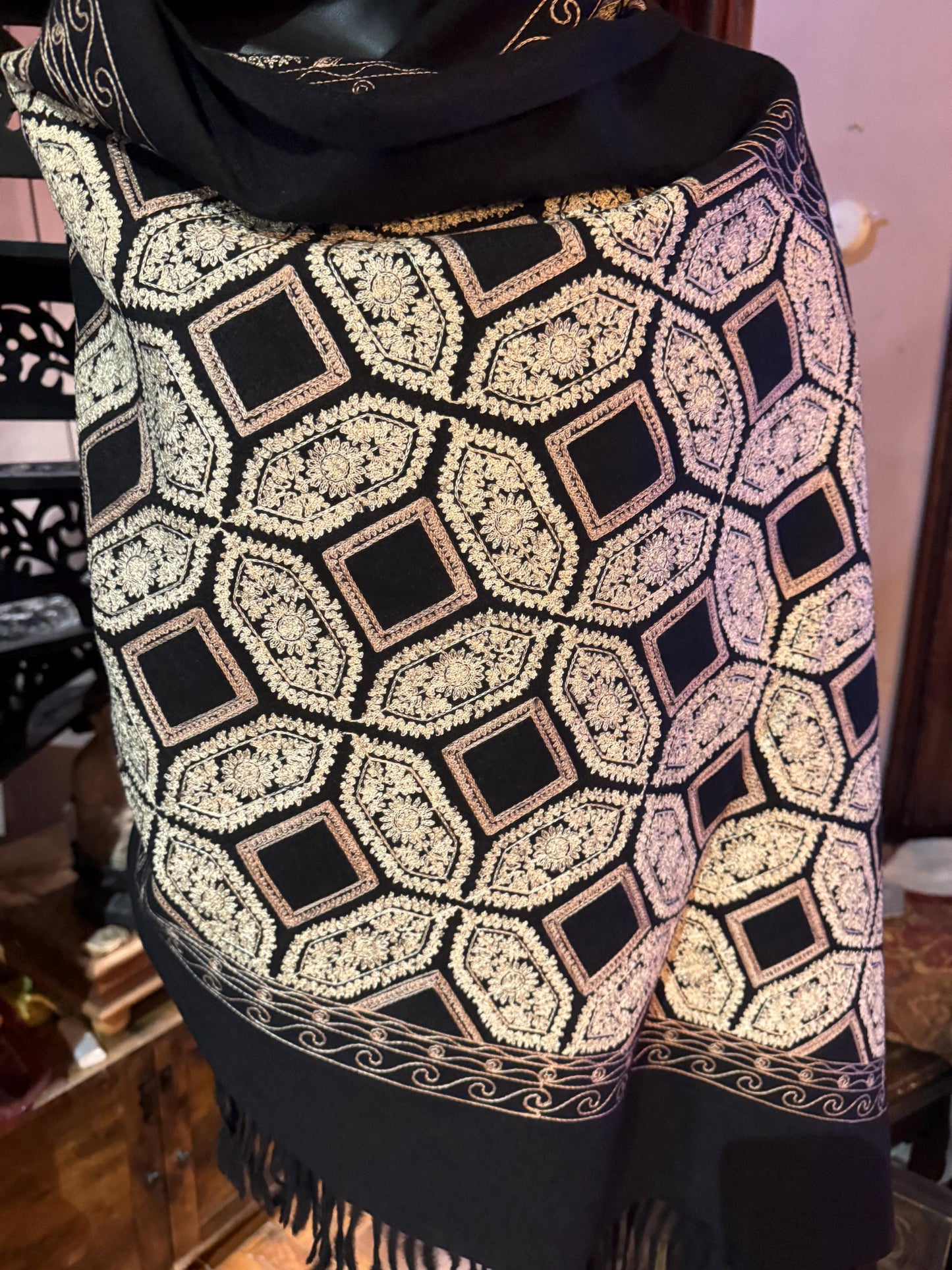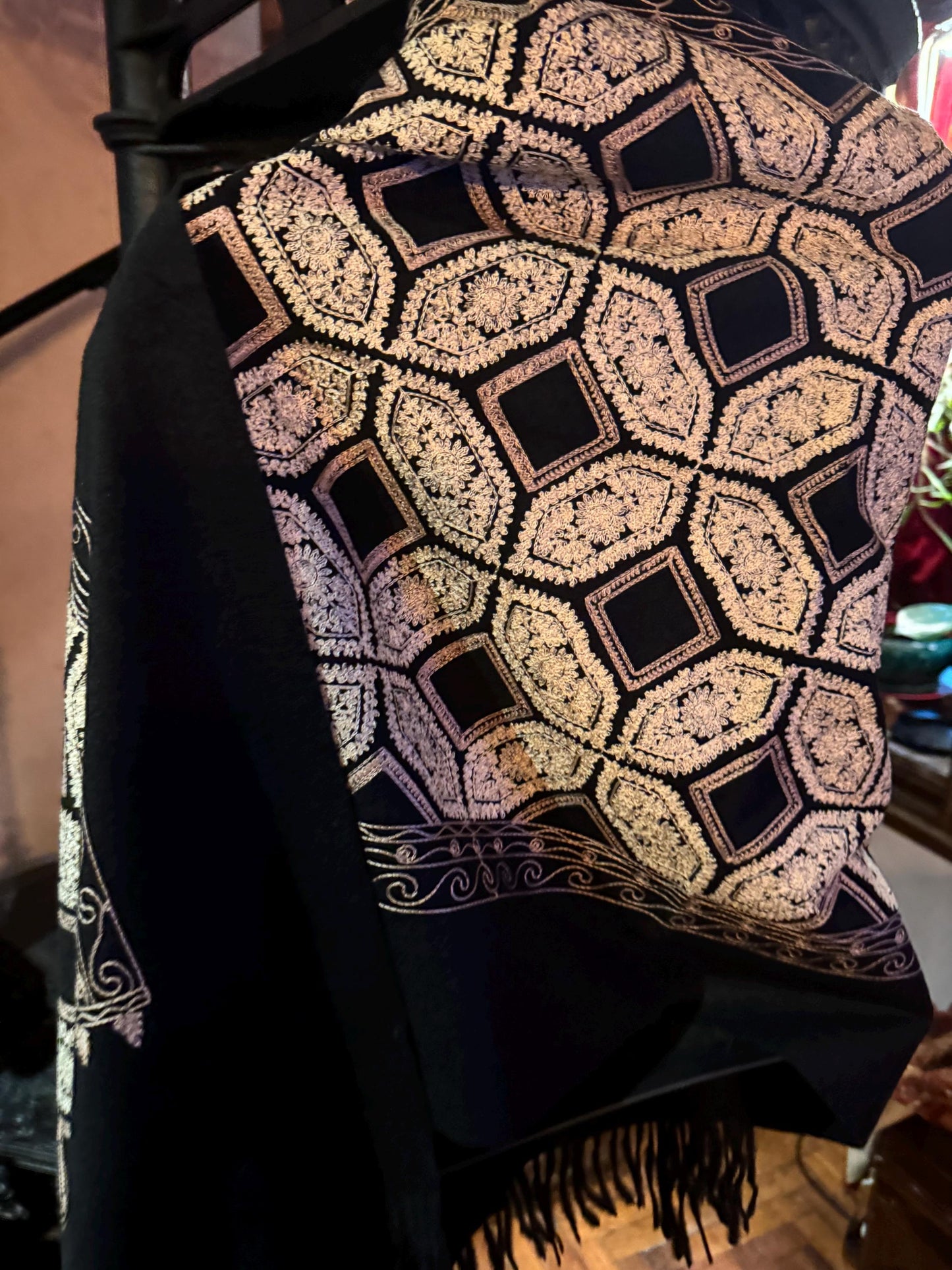 Vintage Black Cashmere Pashmina Scarf Wrap Paisley Embroidered