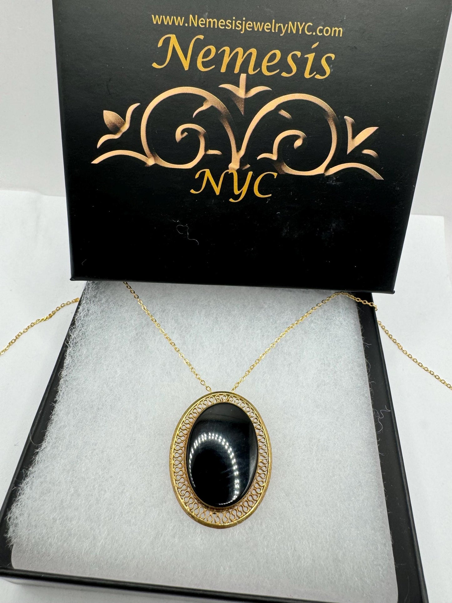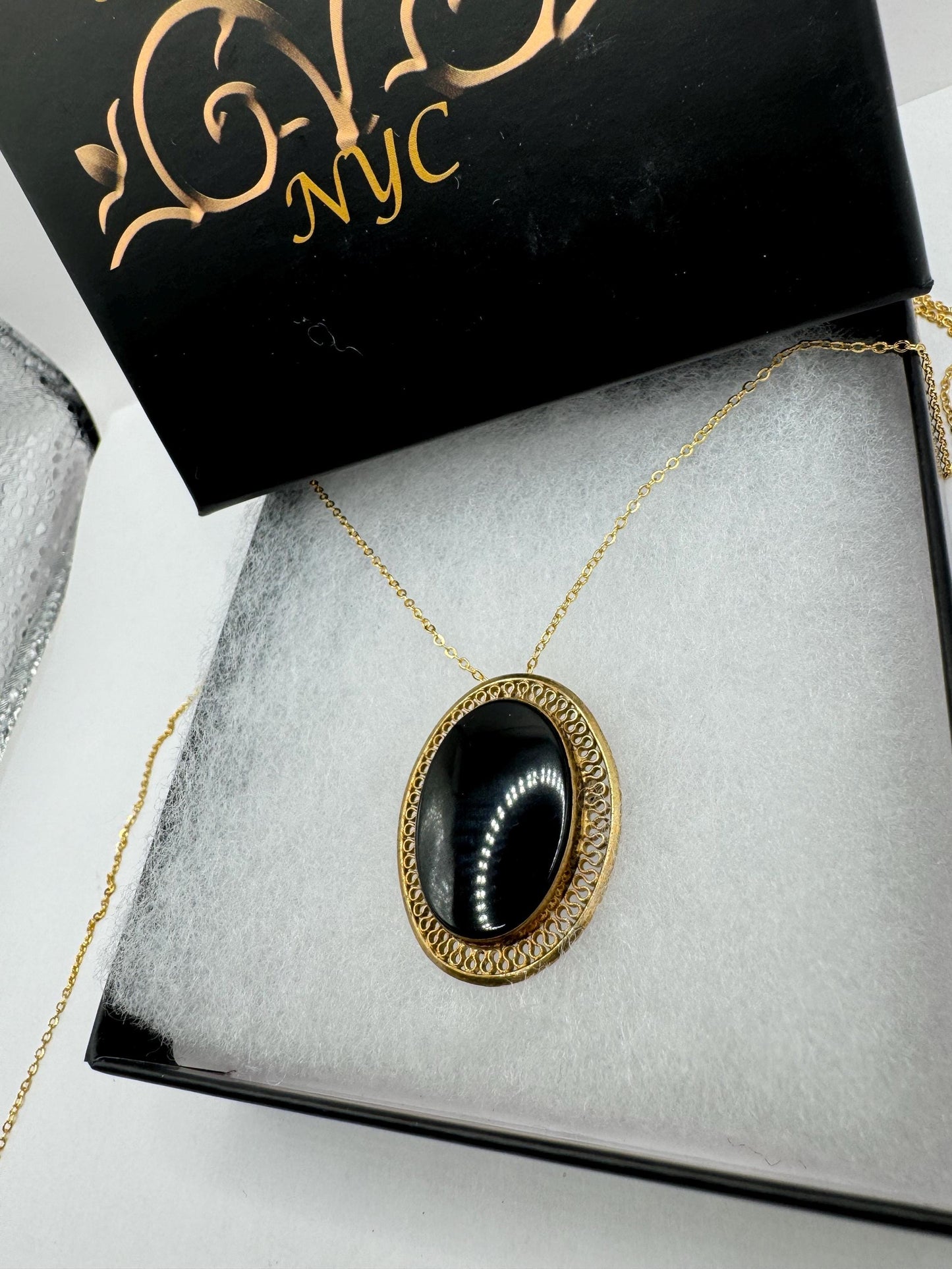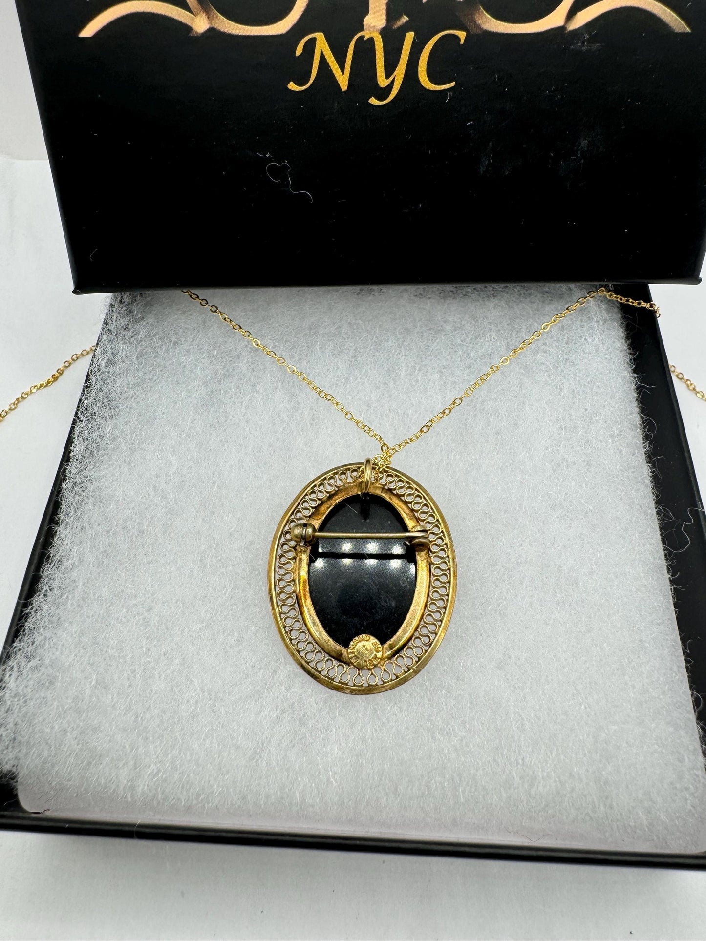 Vintage Black Onyx Gemstone Yellow Gold Filled Necklace Choker pin brooch