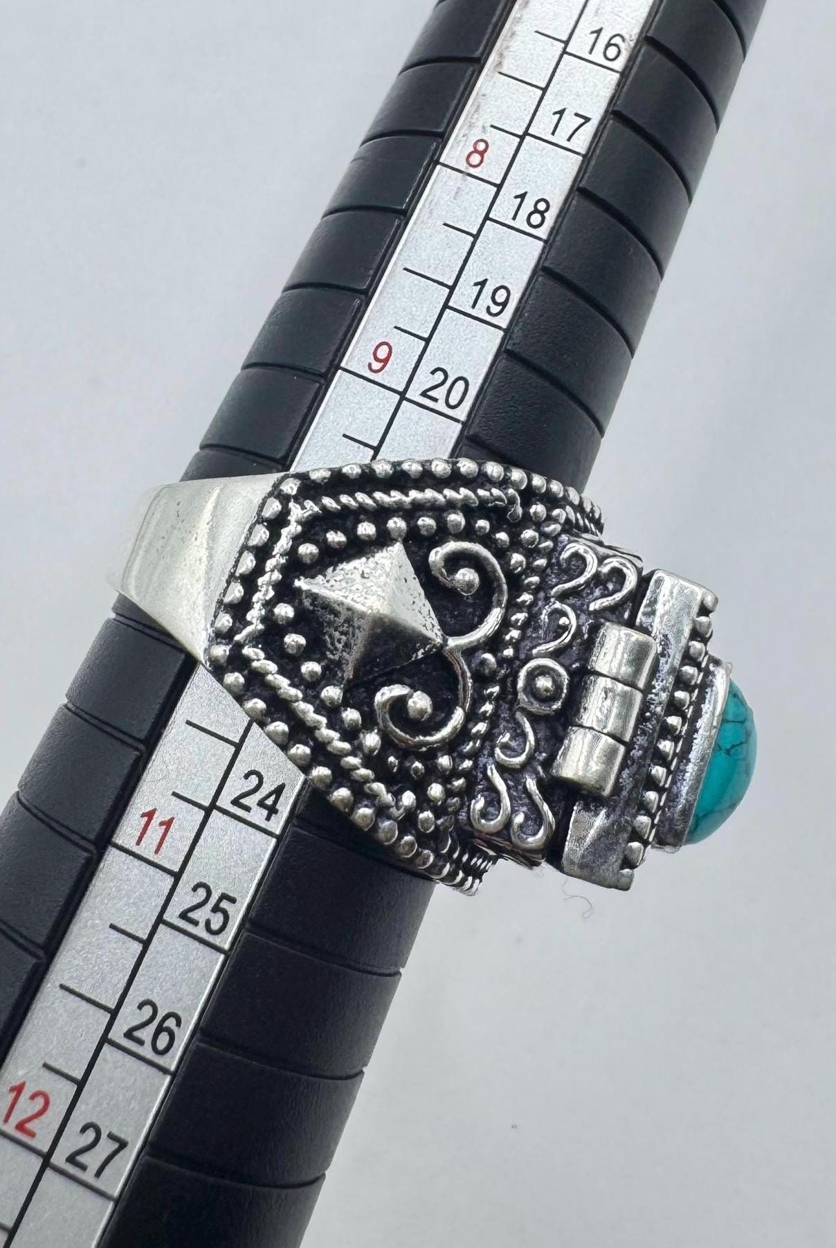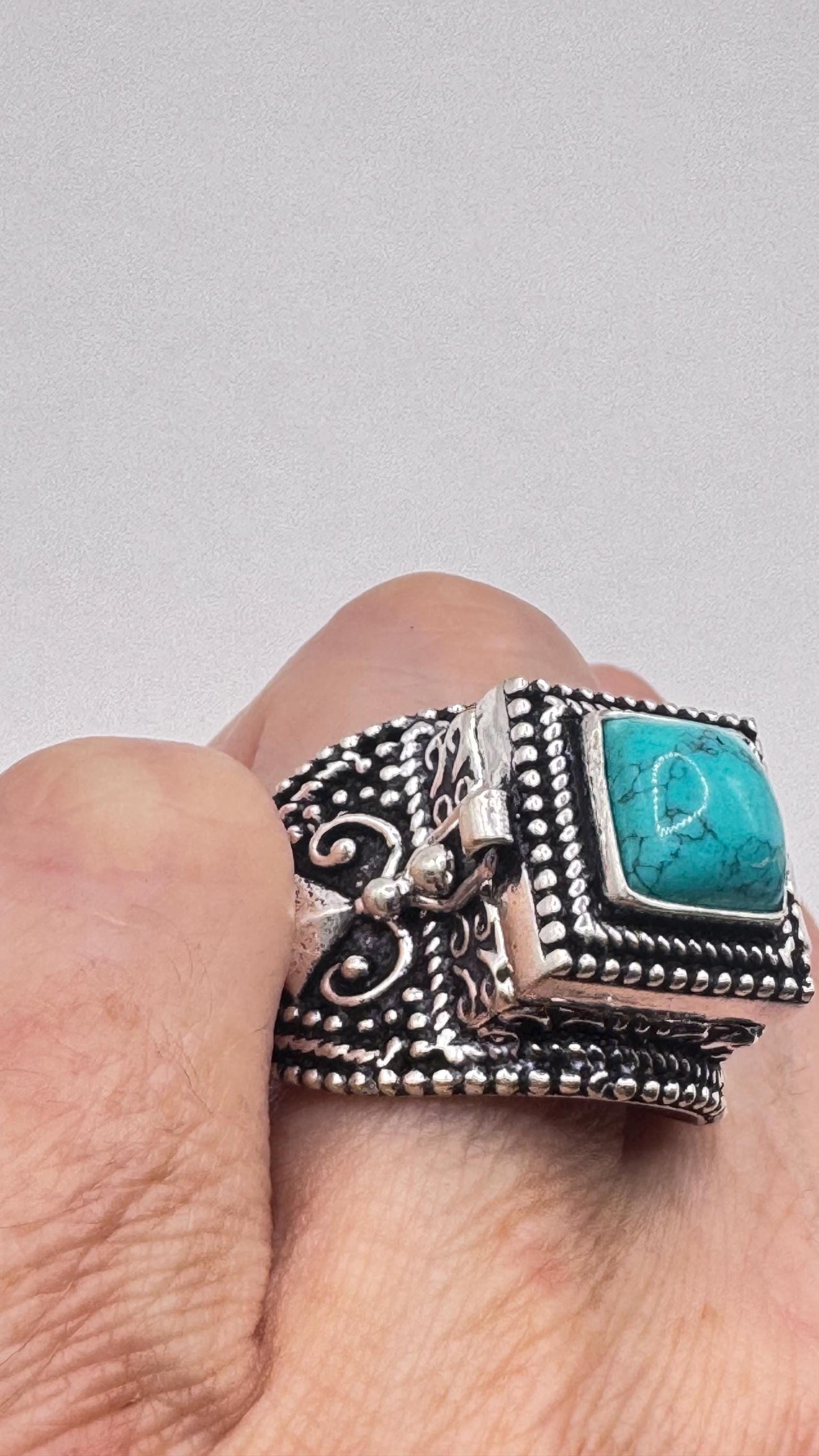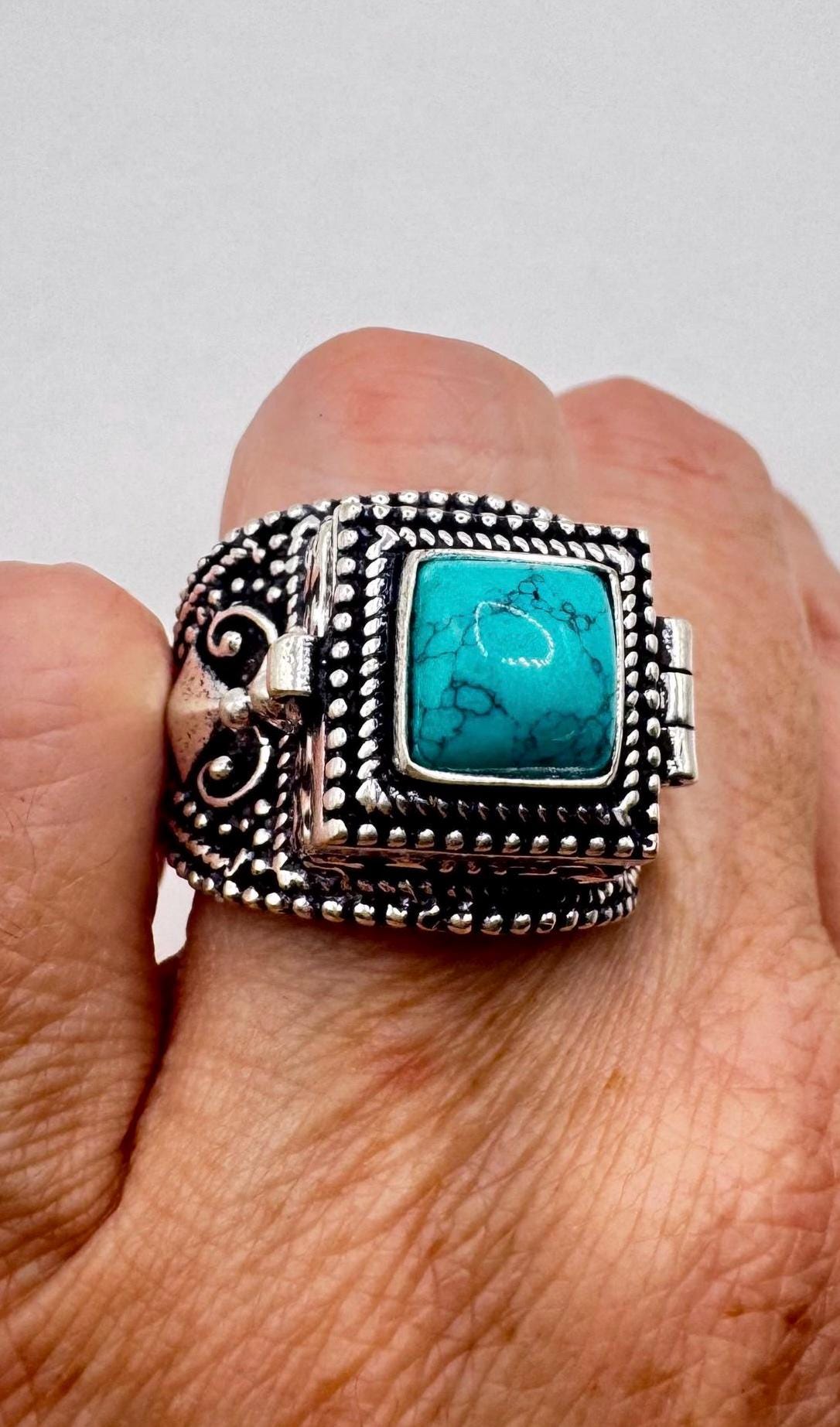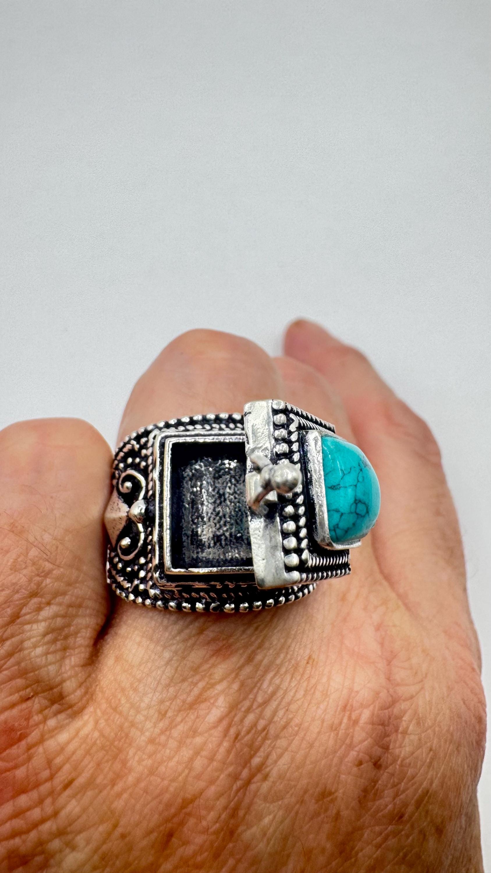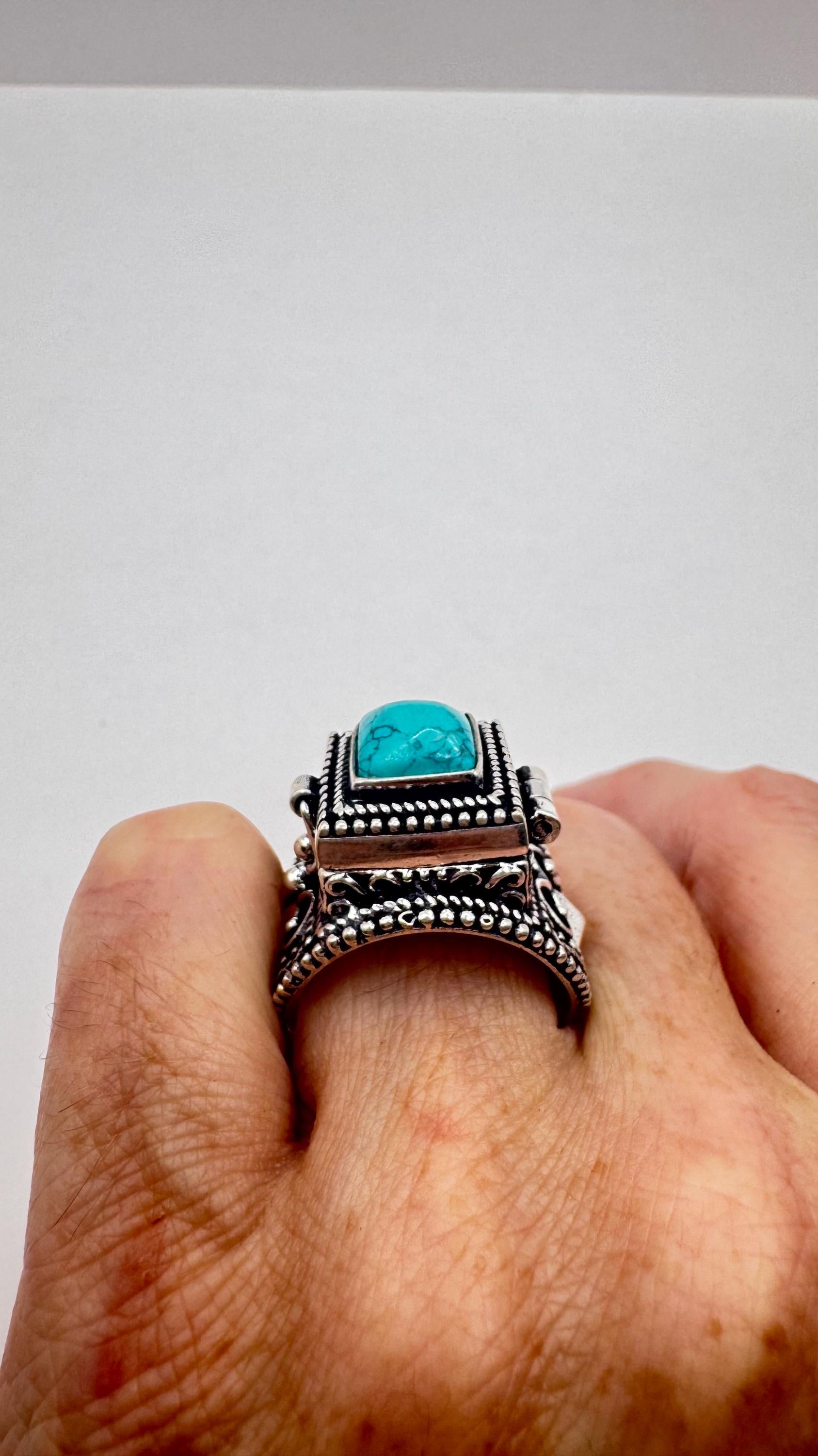 Vintage Blue Turquoise Howlite Silver Bronze Poison Pillbox Ring