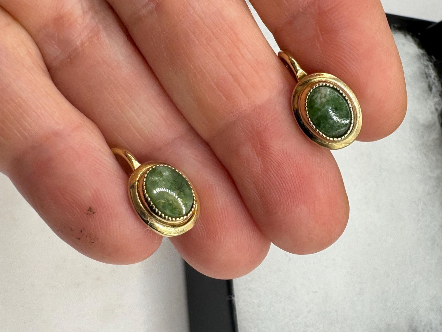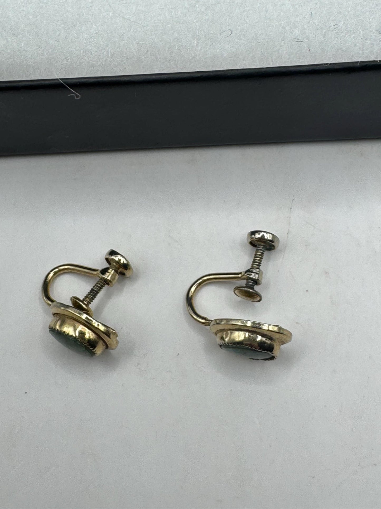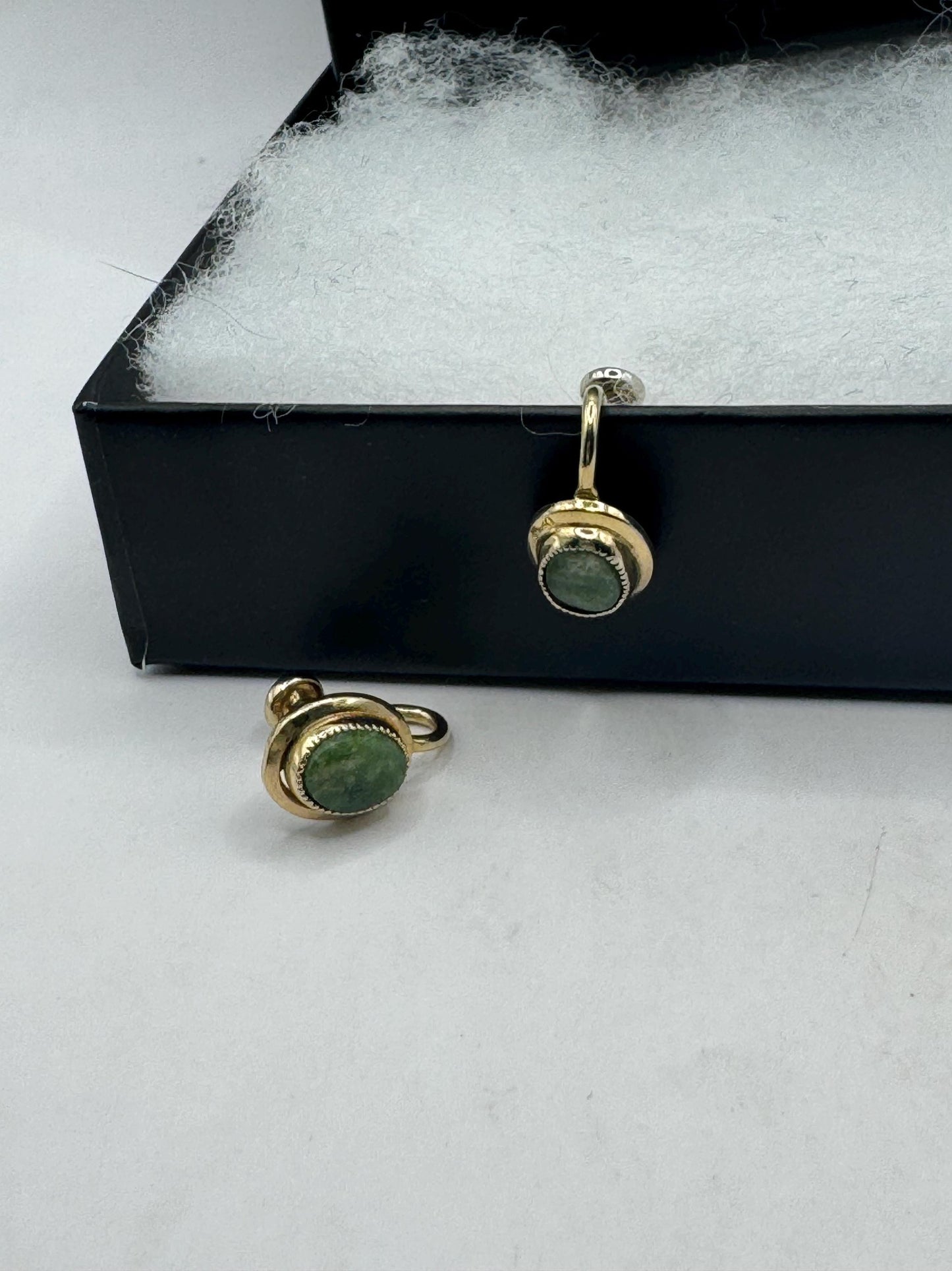 Delicate and detailed genuine vintage colorful green, jade gemstone and 12 K gold fill screw back stud clip earrings