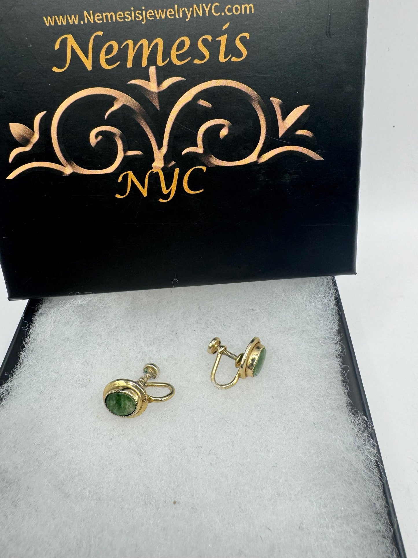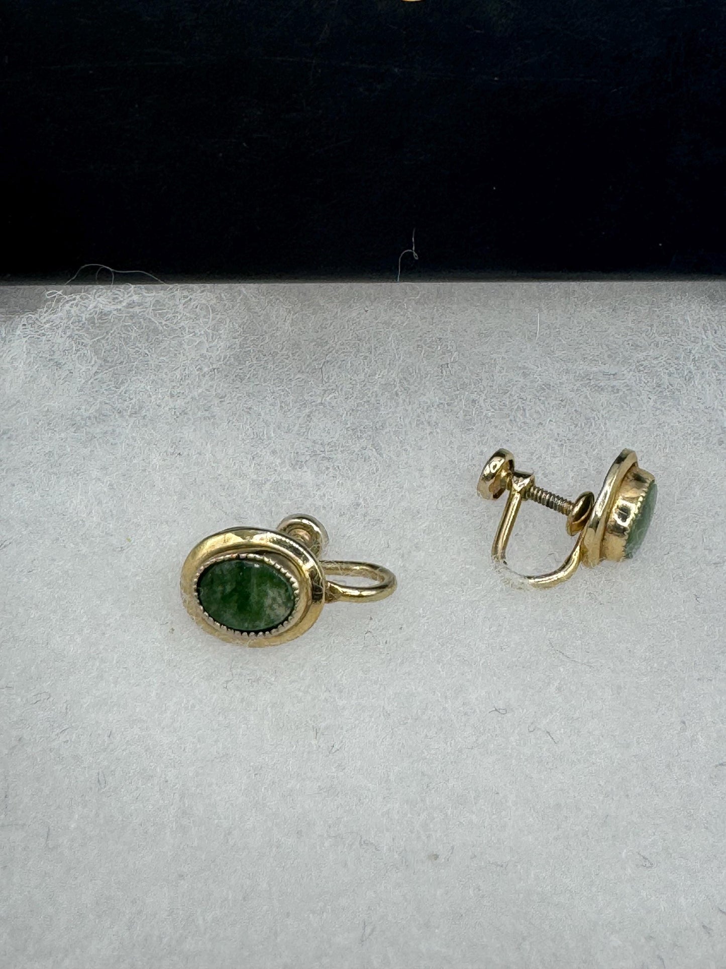 Vintage Genuine Green Jade Gemstone 12k Gold Filled Screw Clip Earrings