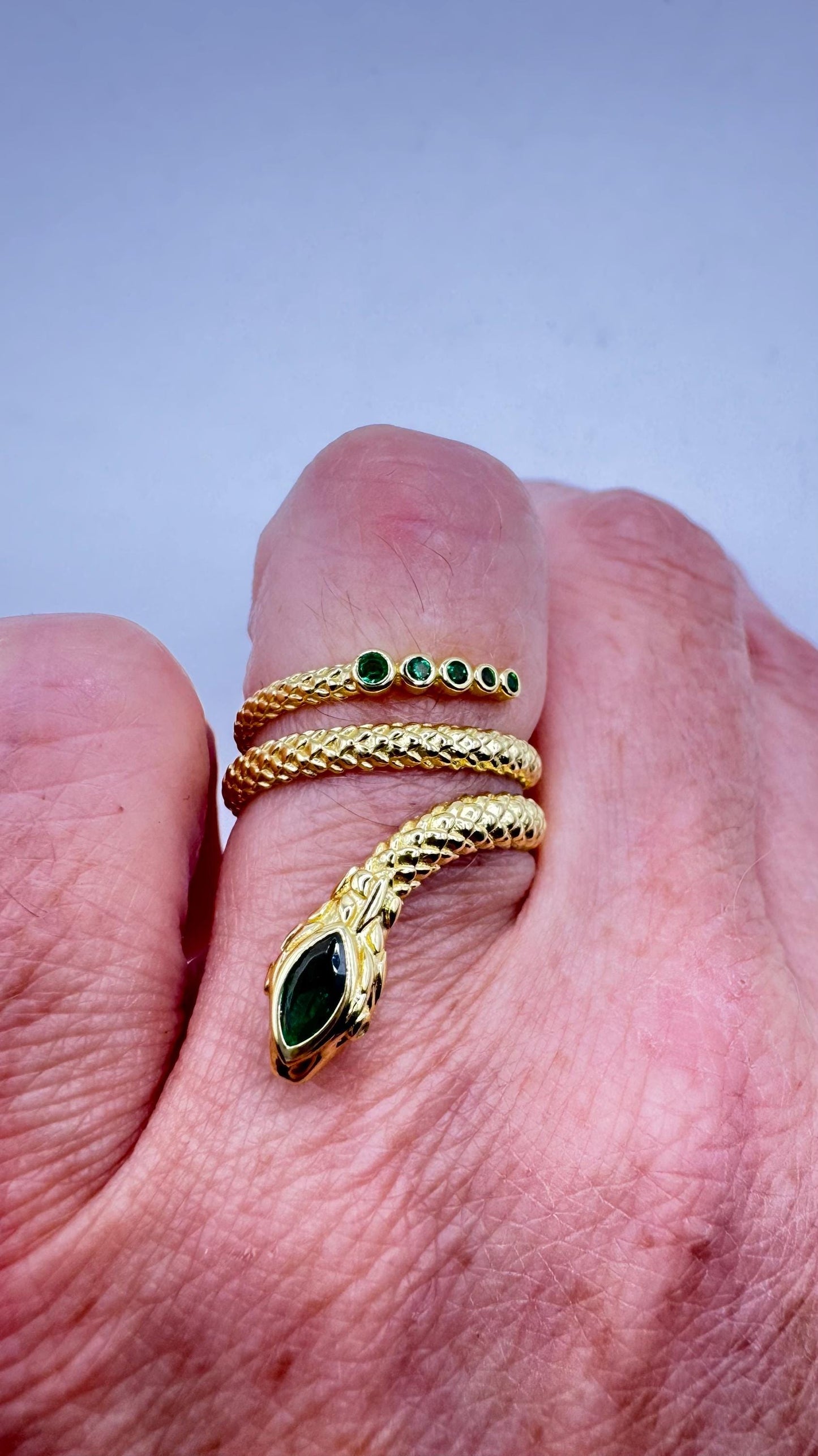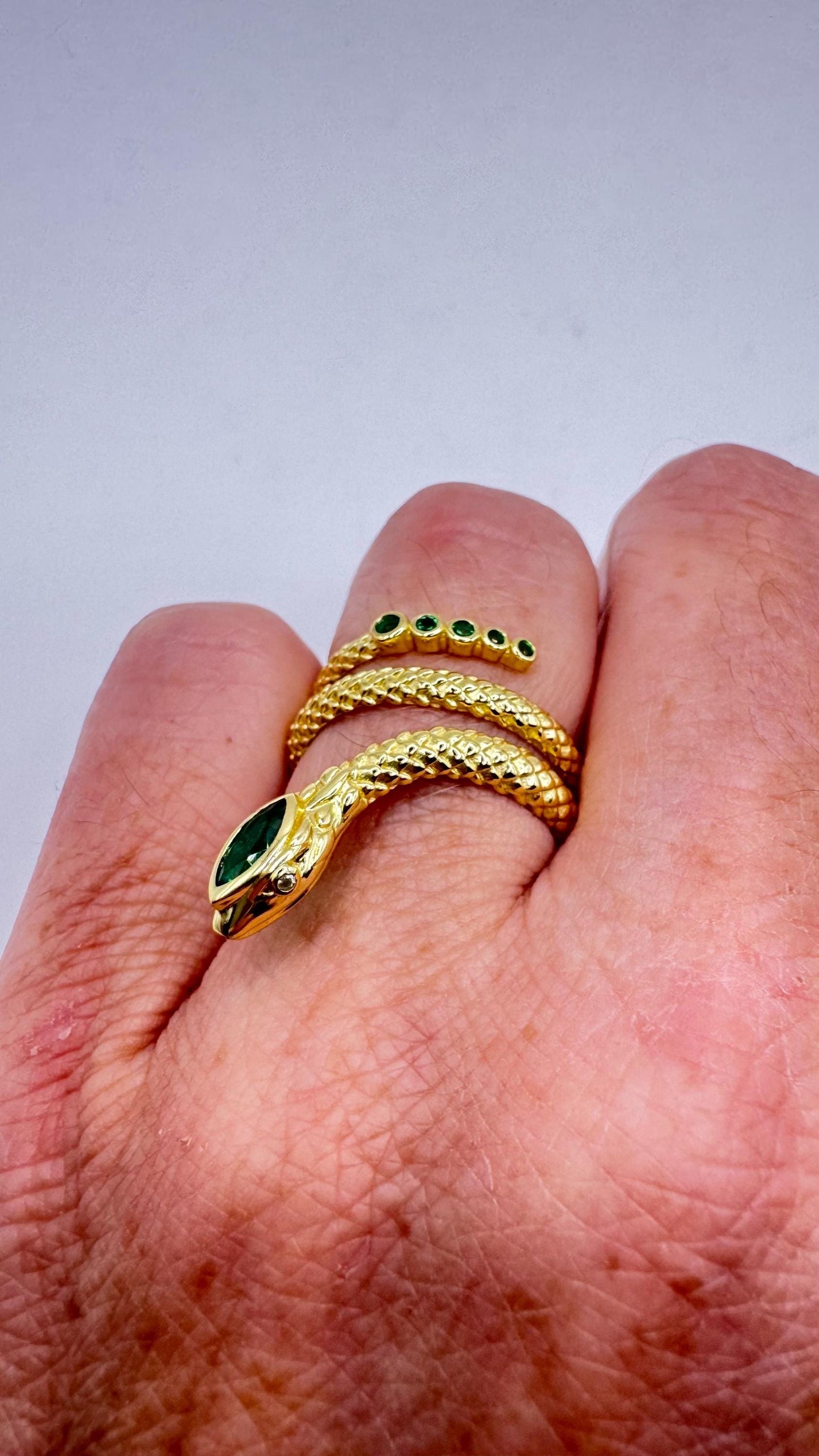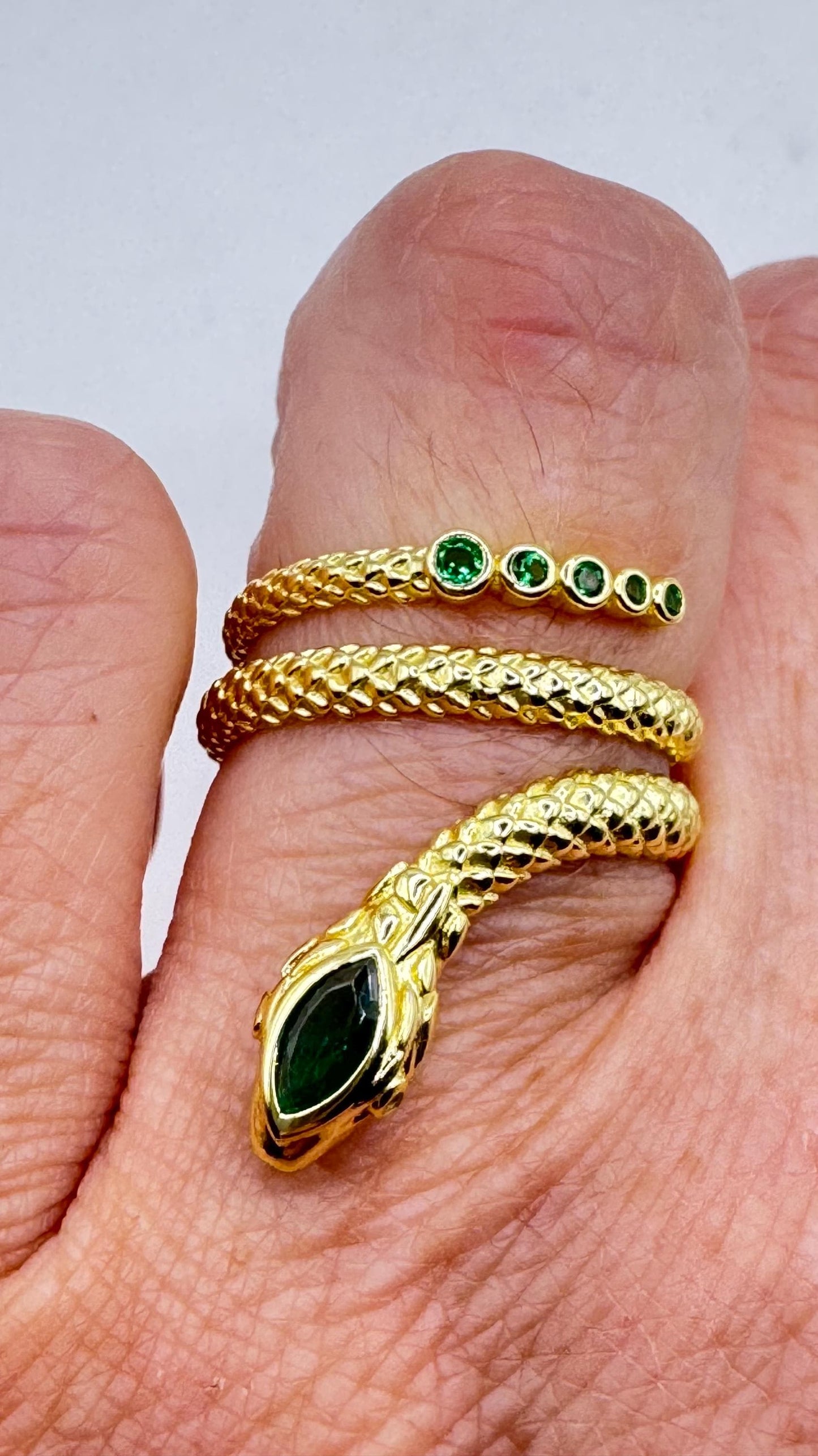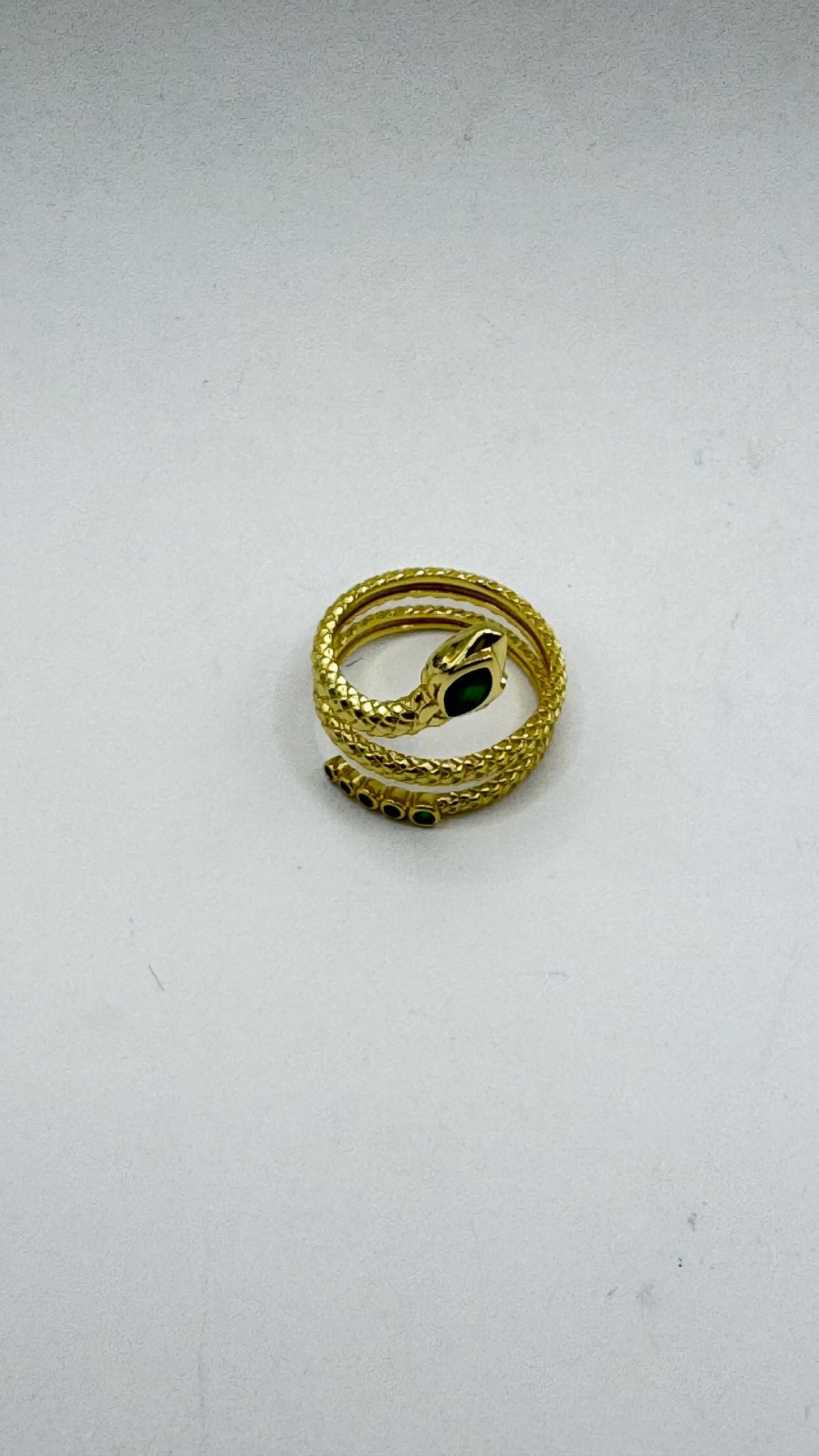 Vintage green chrome dioxide snake ring in 925 Sterling silver finished in durable 18k gold, does not tarnish