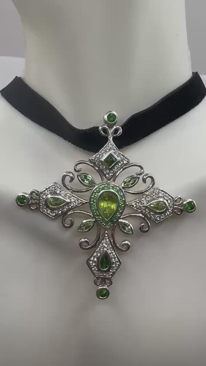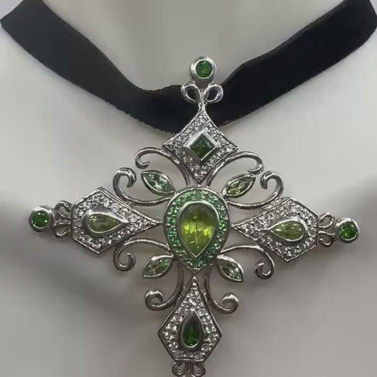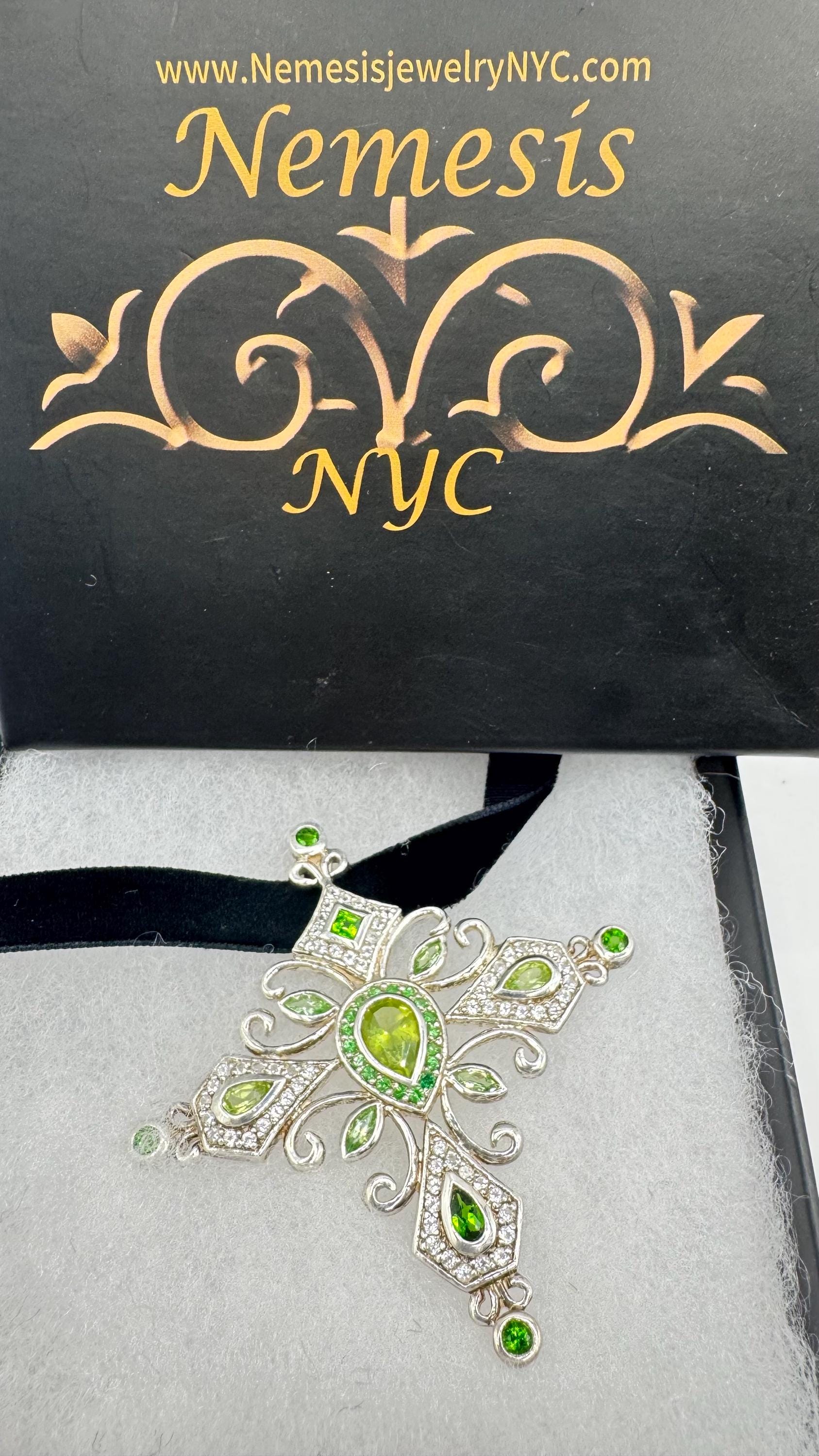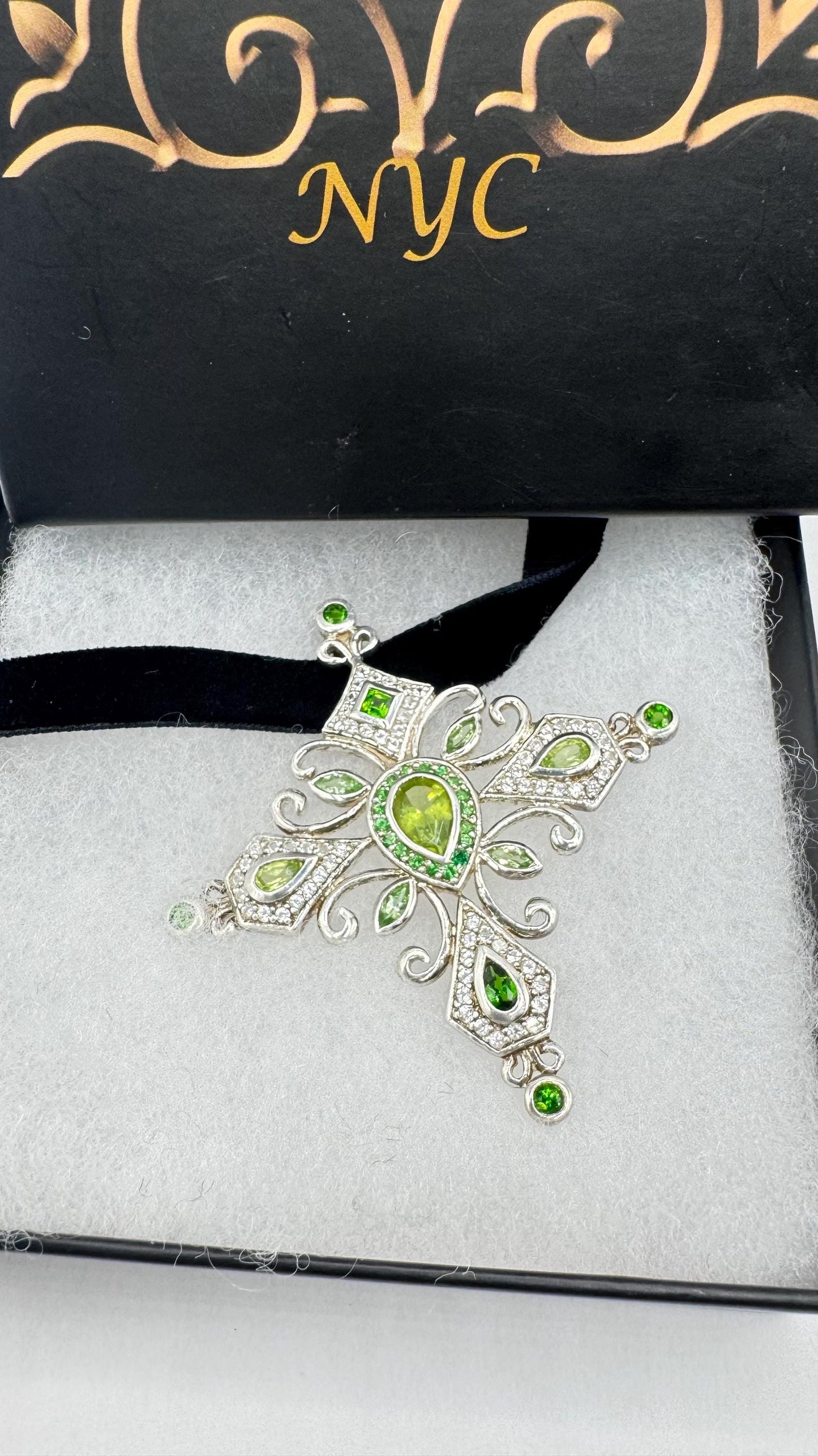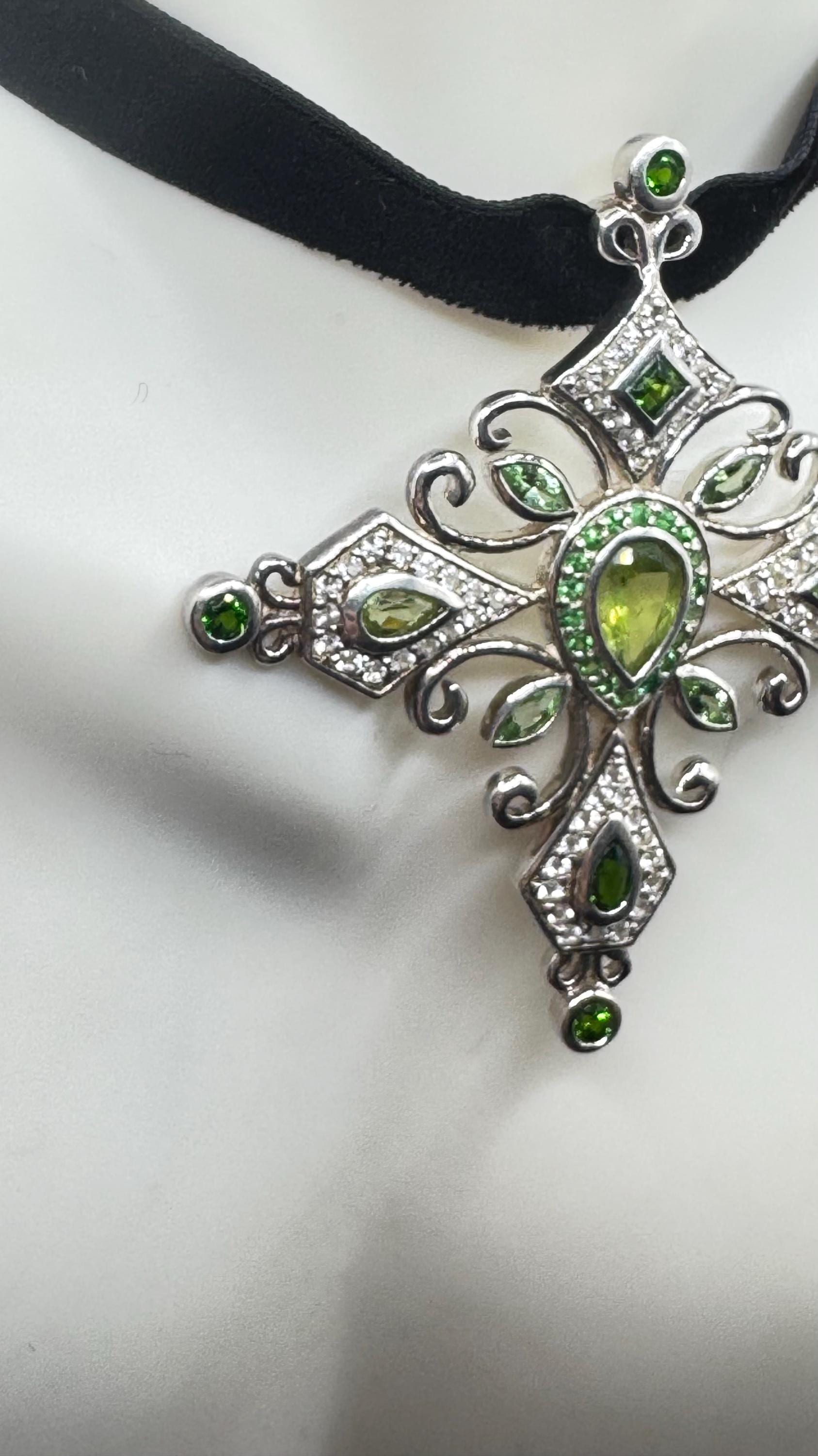 Vintage Green Cross Chrome Diopside Peridot Choker 925 Sterling Silver Cross Pendant