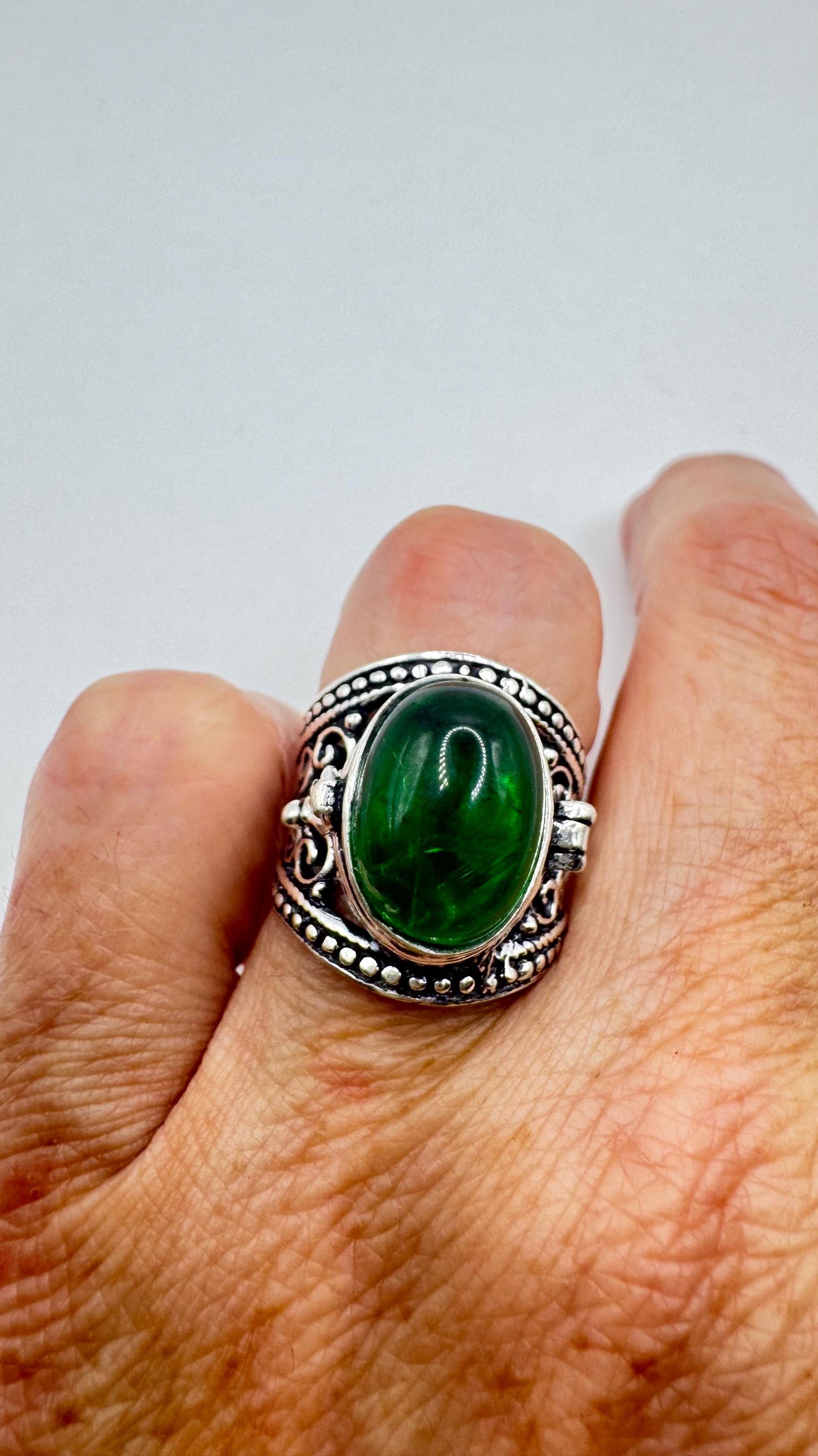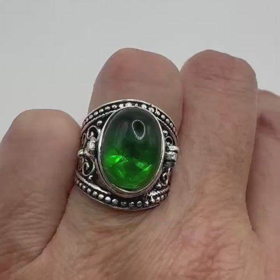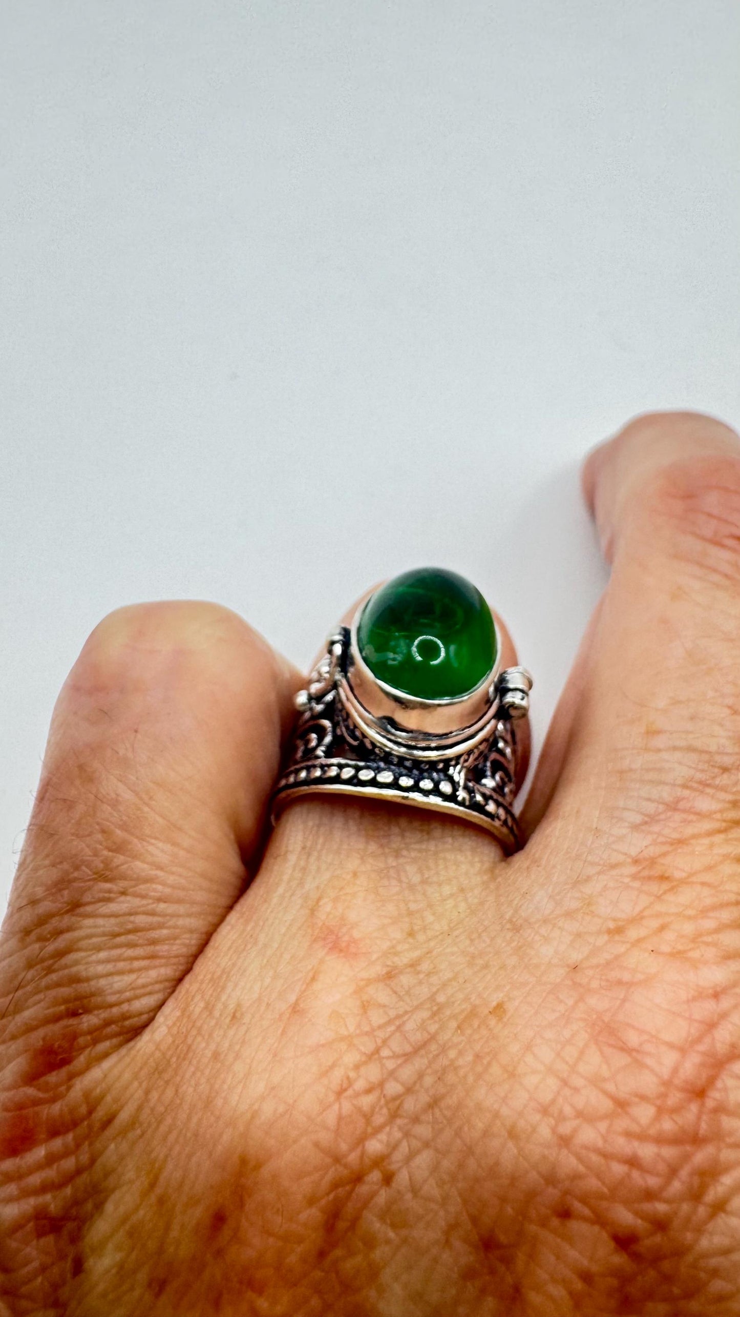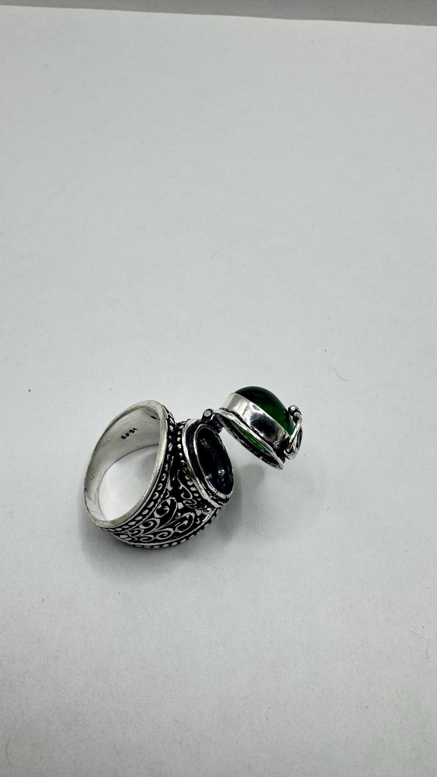 Vintage Green Emerald Glass Silver White Bronze Poison Pillbox Ring
