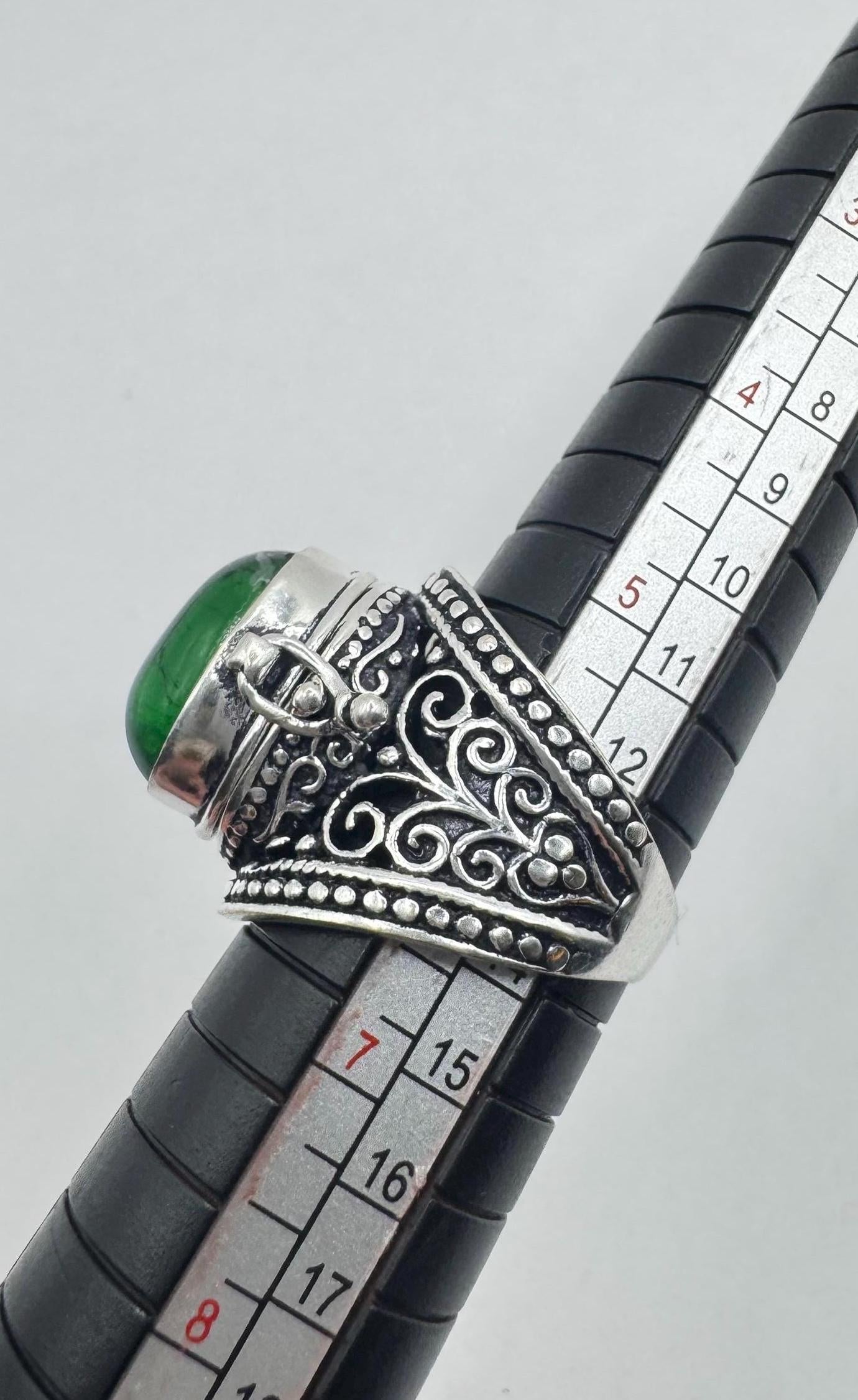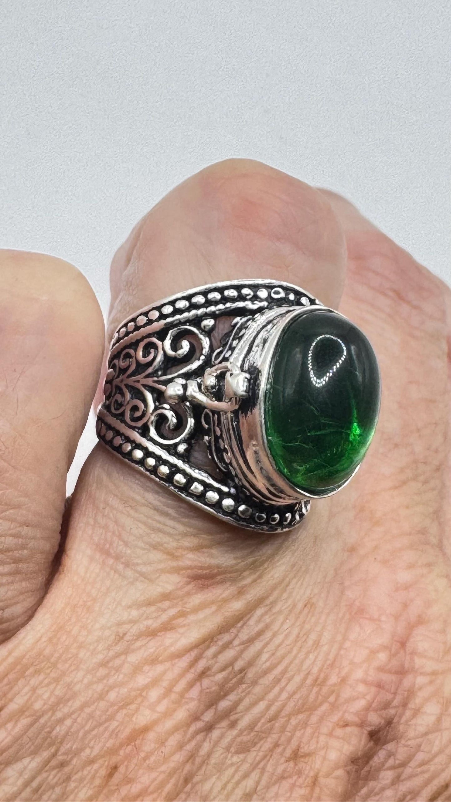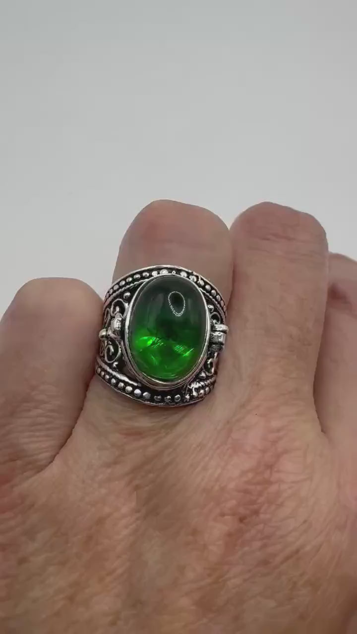 Vintage Green Emerald Glass Silver White Bronze Poison Pillbox Ring