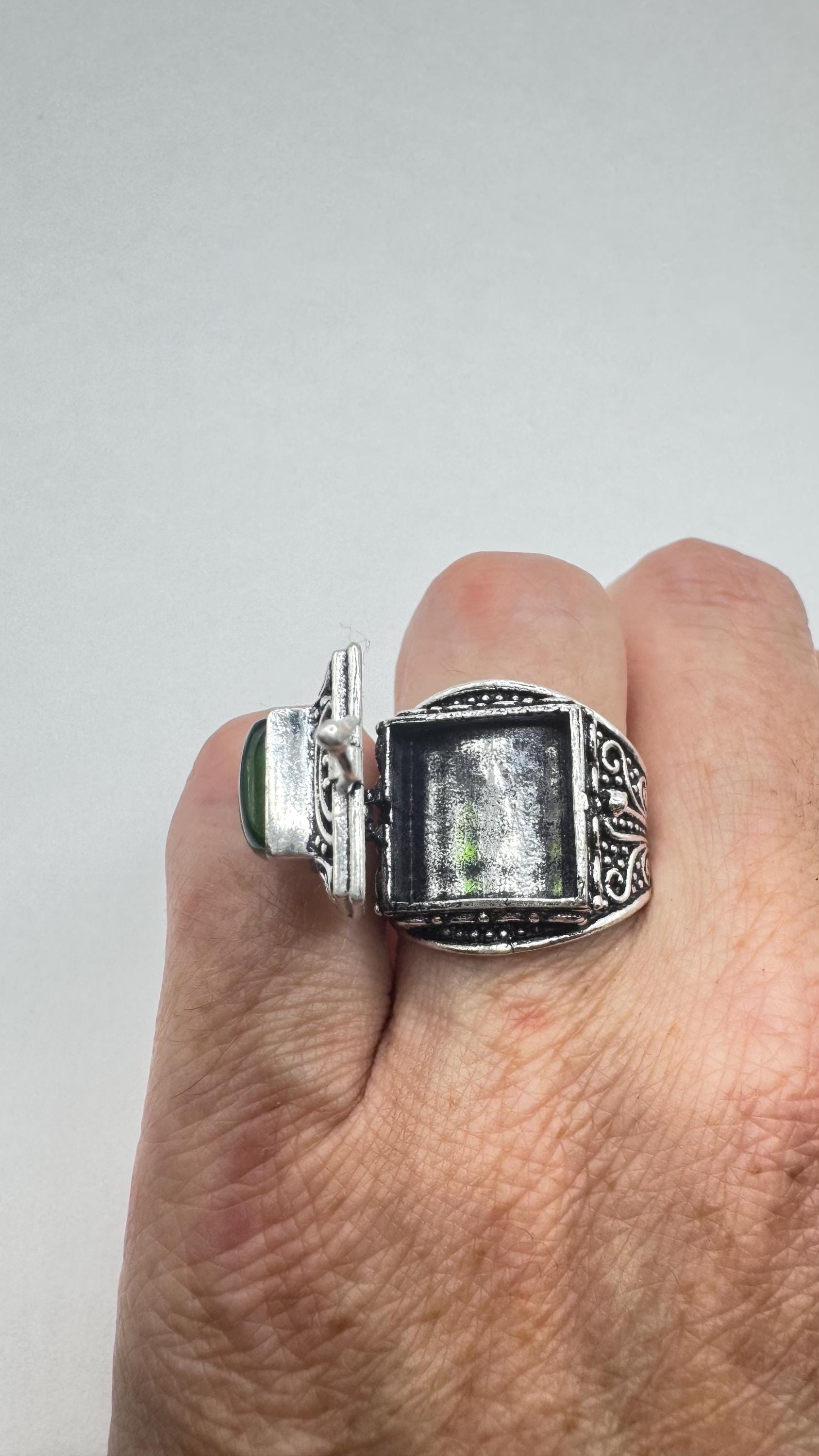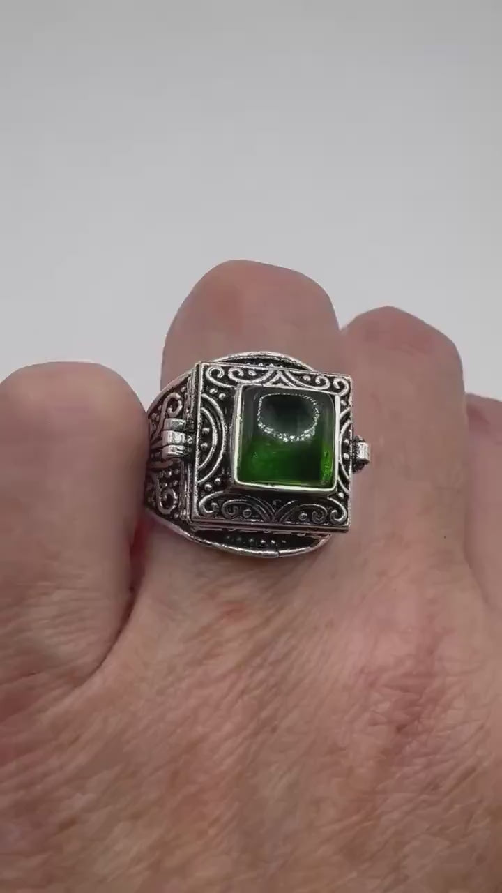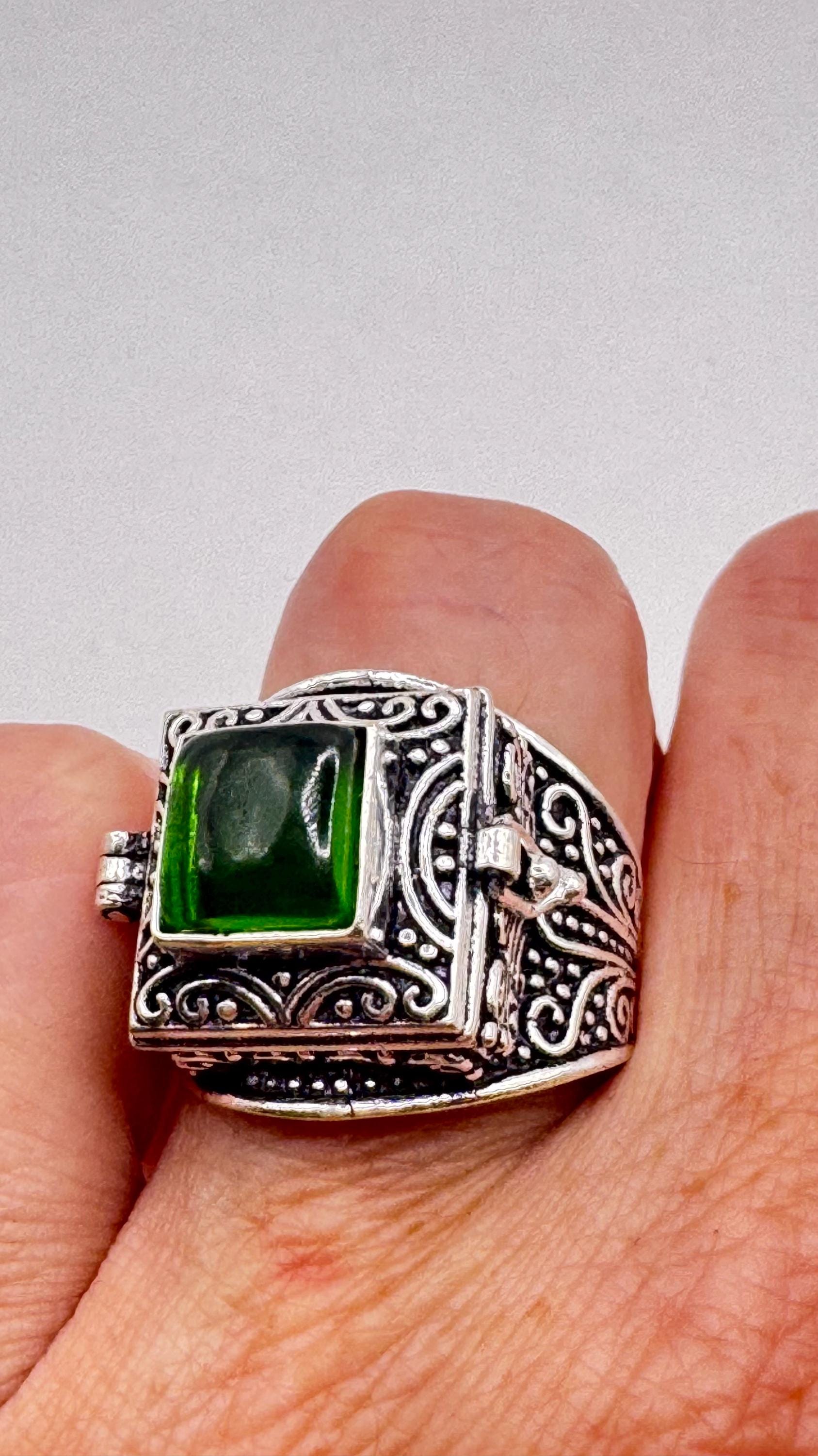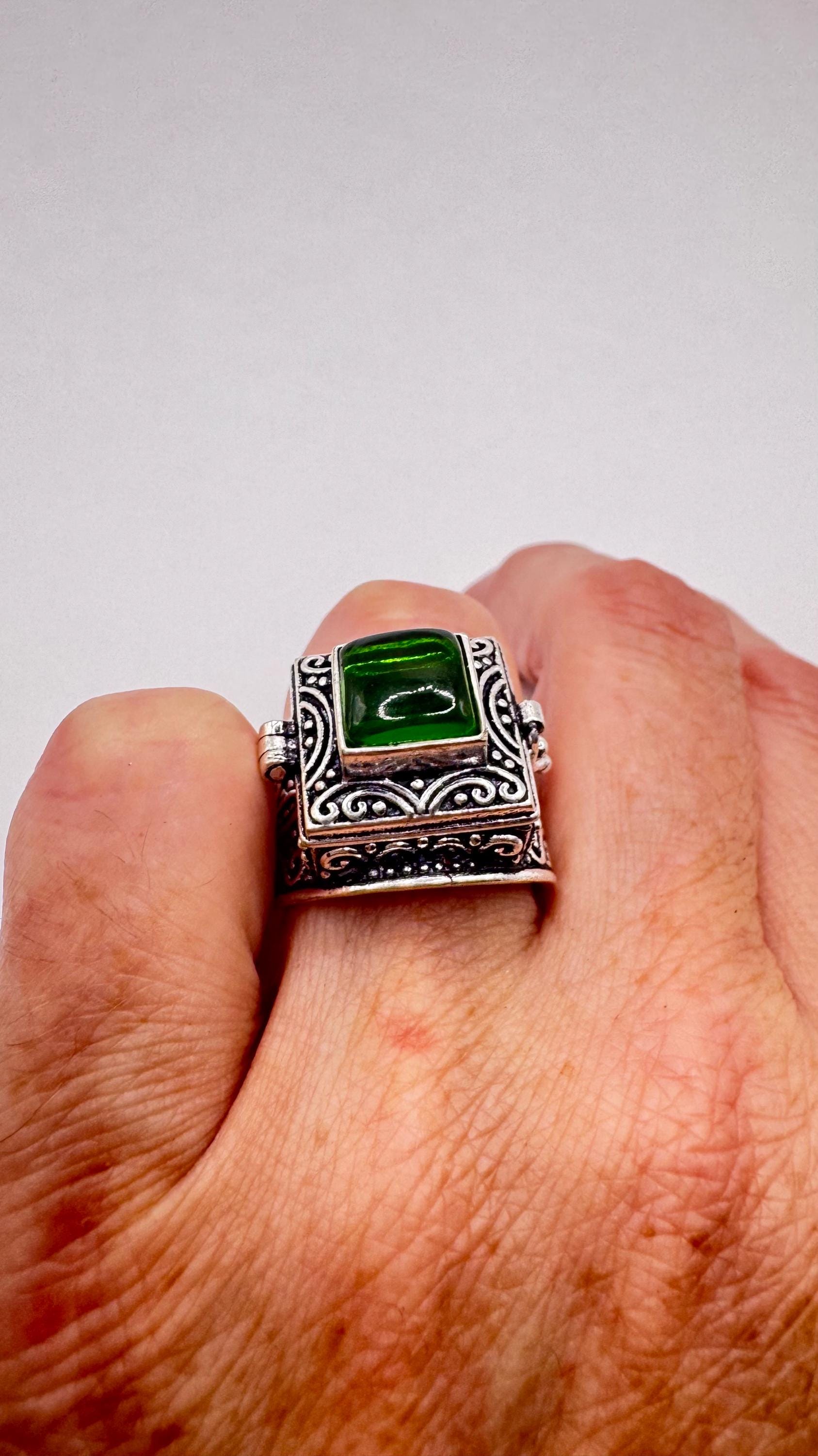 Vintage Green Emerald Glass Silver White Bronze Poison Pillbox Ring