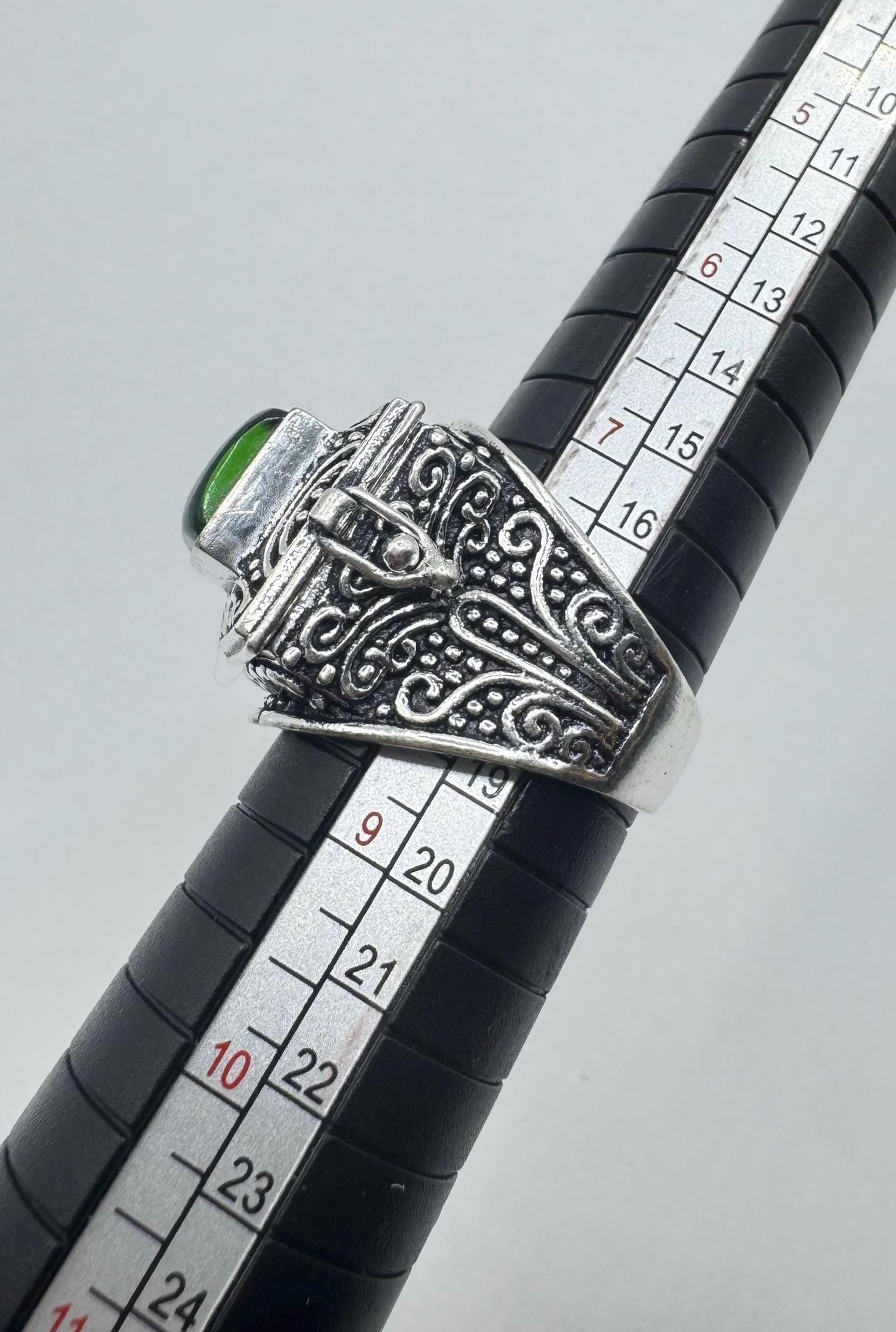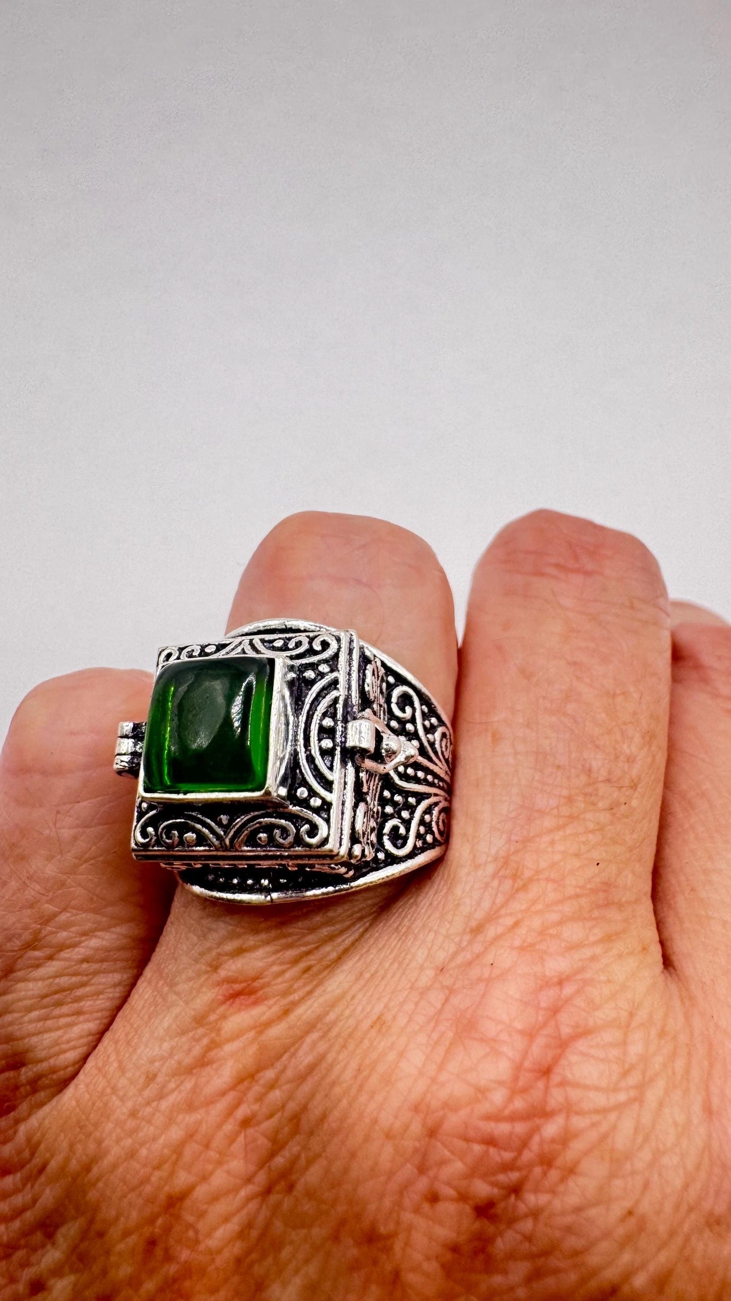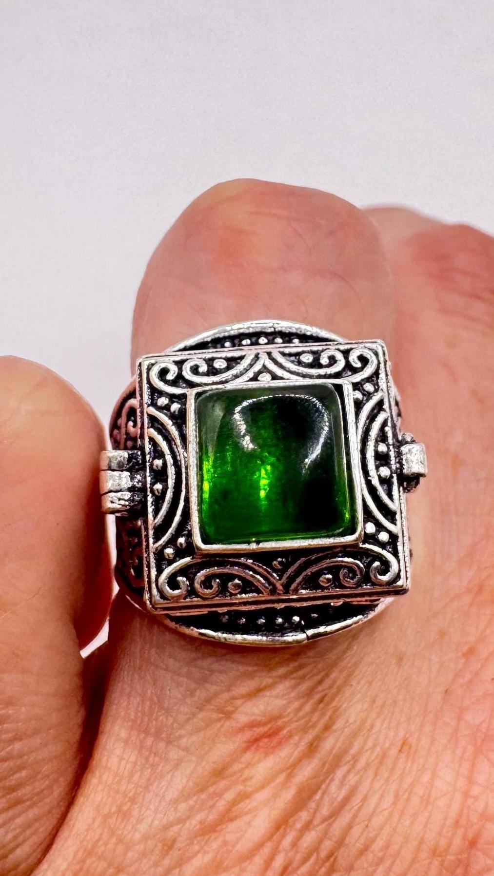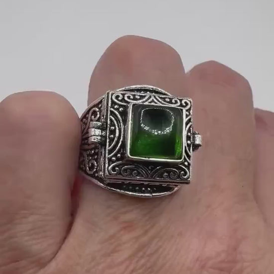 Vintage Green Emerald Glass Silver White Bronze Poison Pillbox Ring