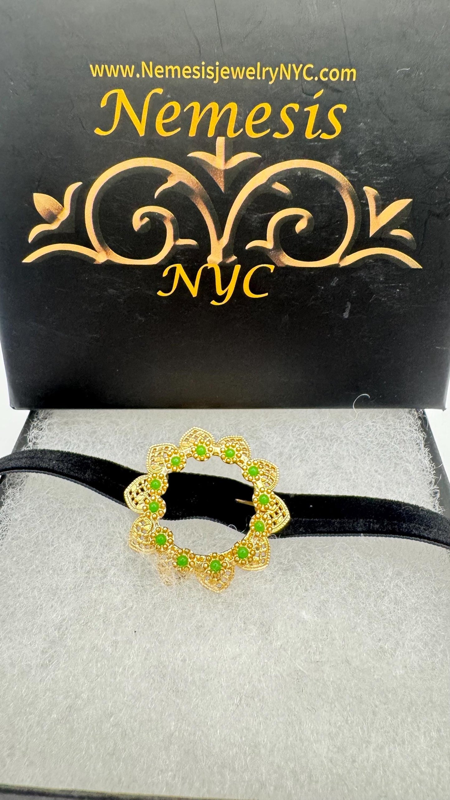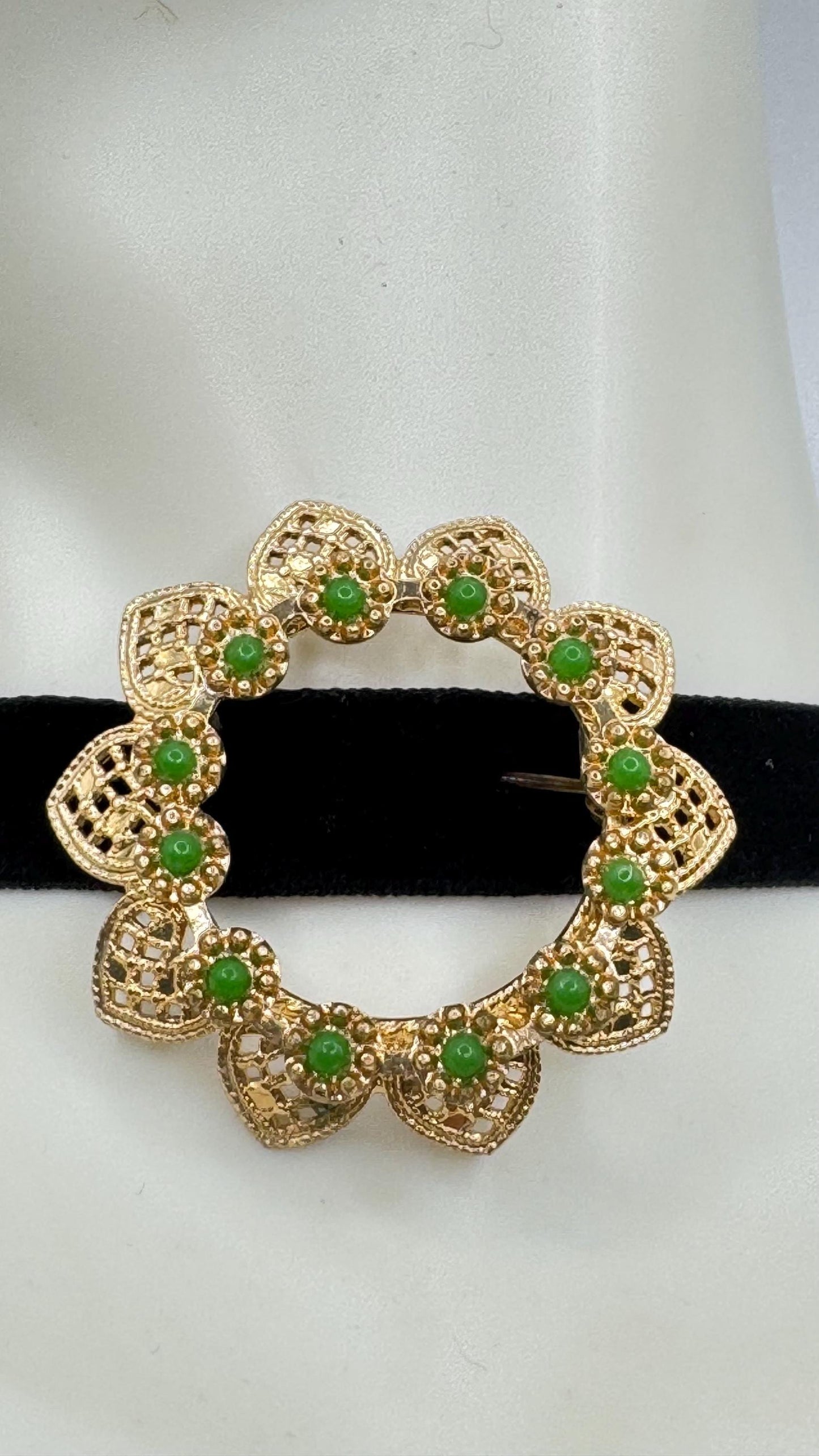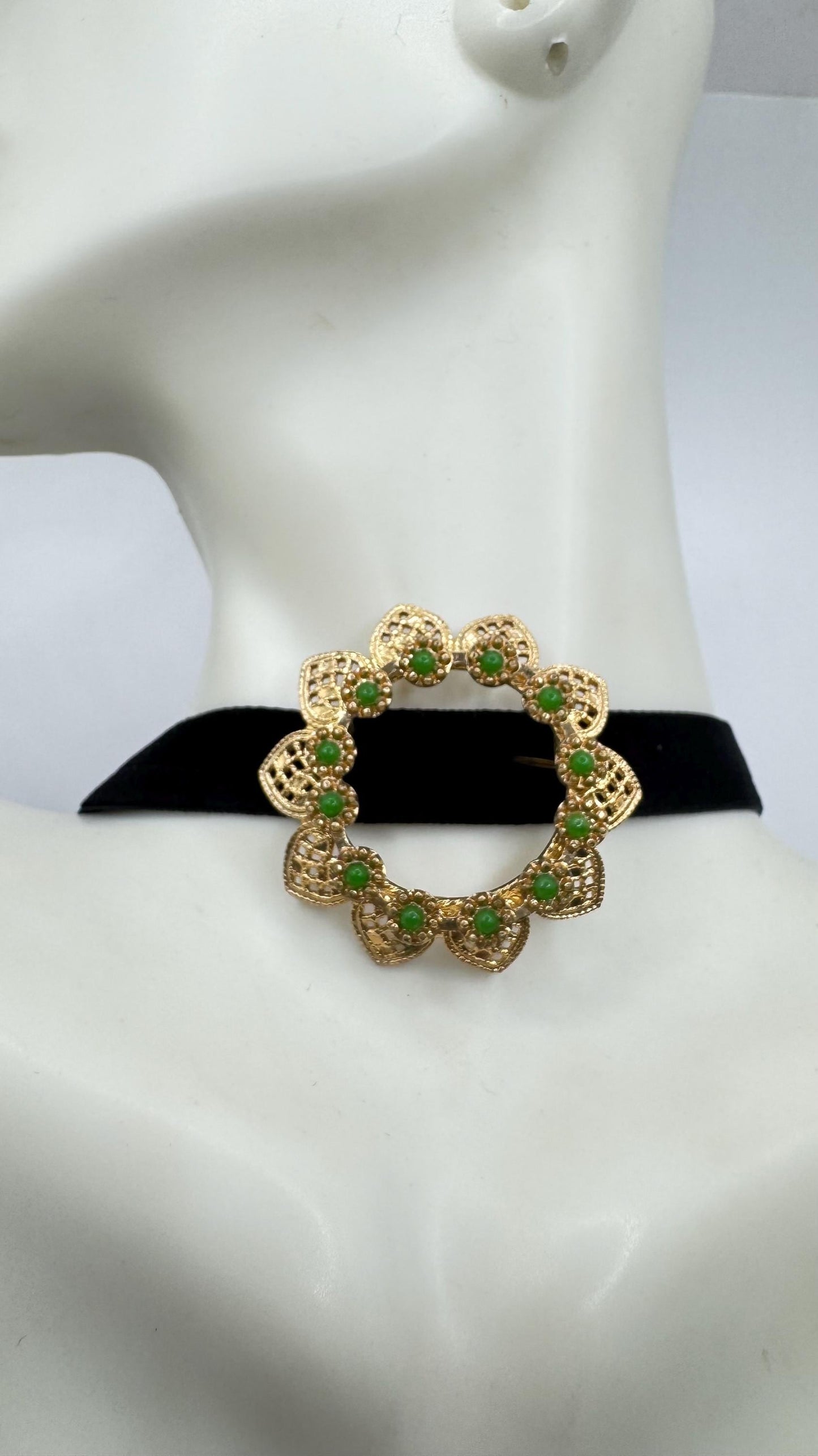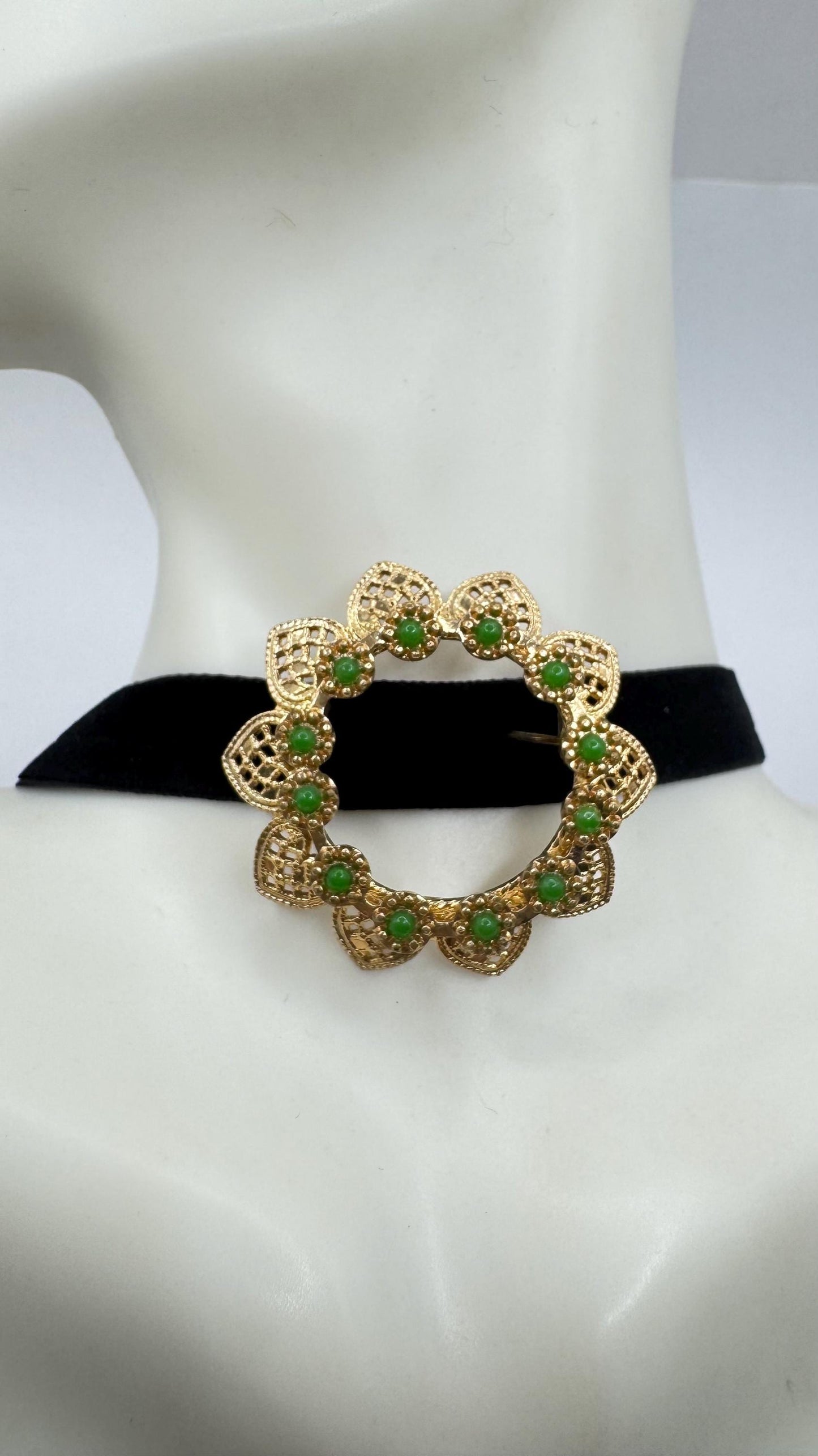 Vintage Green Jade Yellow Gold Filled Brooch Pin | black velvet choker